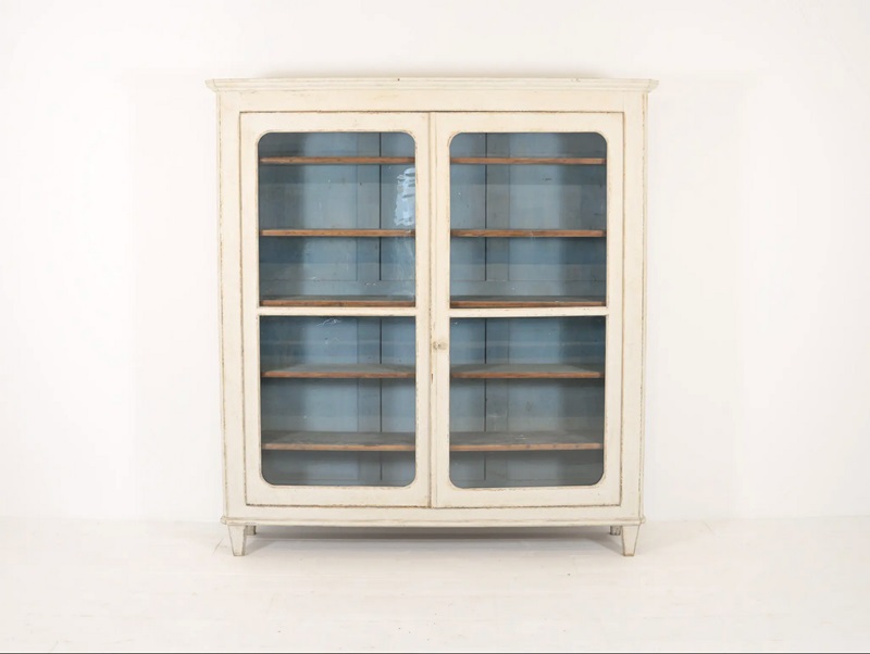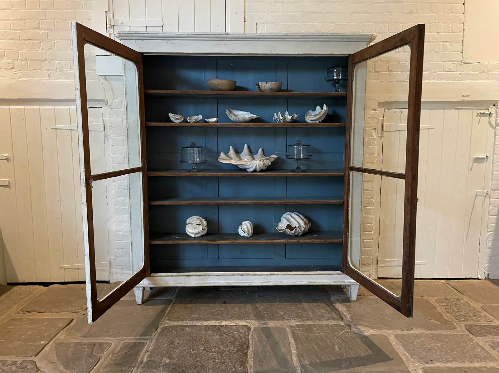 Scraped pale chalk white paint on the outside and a soft blue on the inside. A wonderful display piece for a dining room, kitchen, hall or drawing room. Relatively shallow at 43cm. Two doors. Clam shells also available for sale.