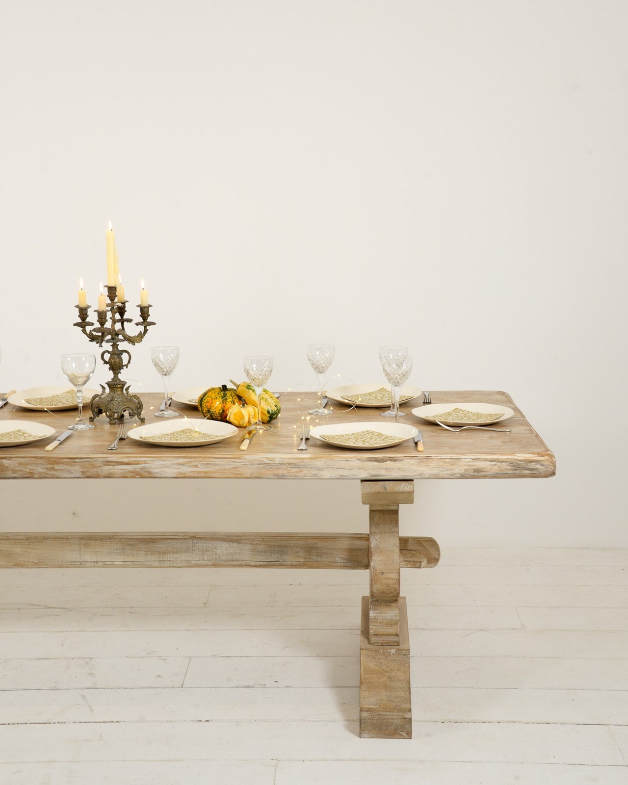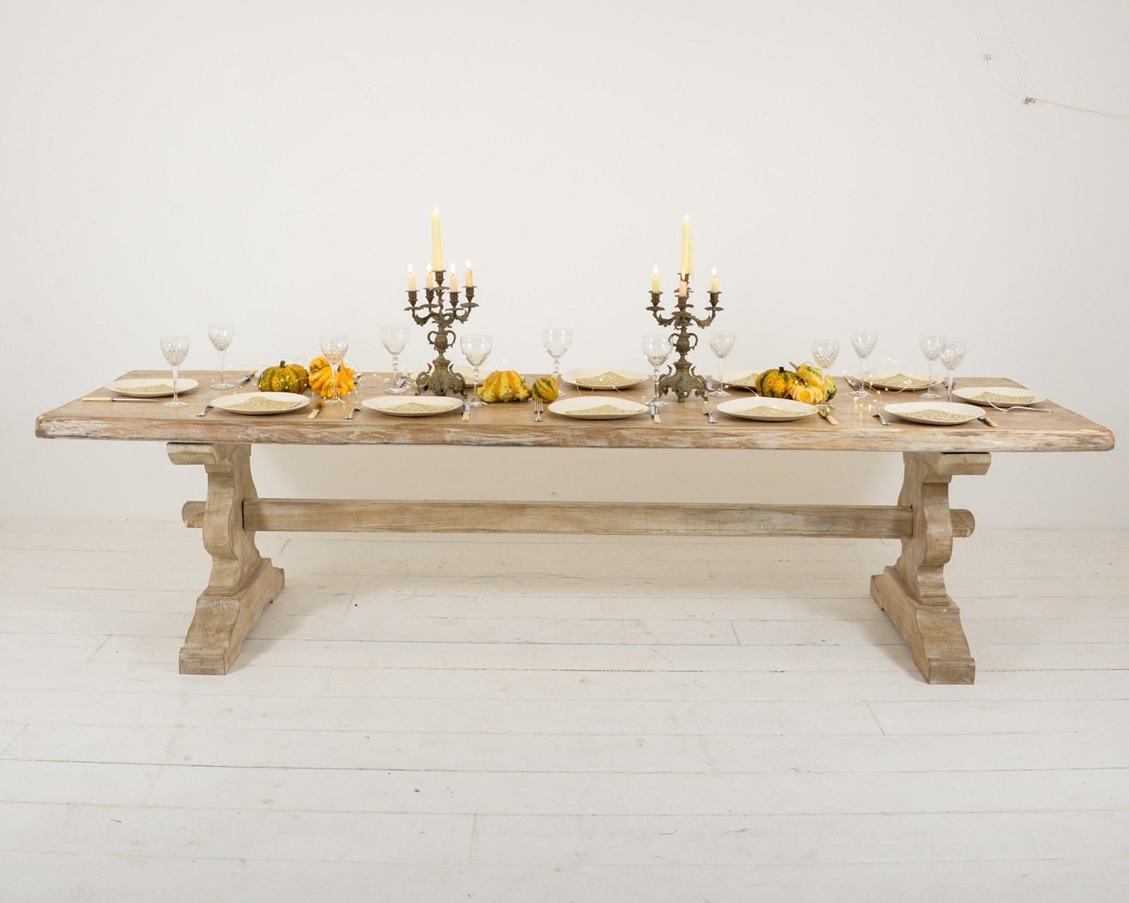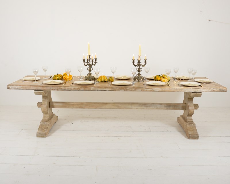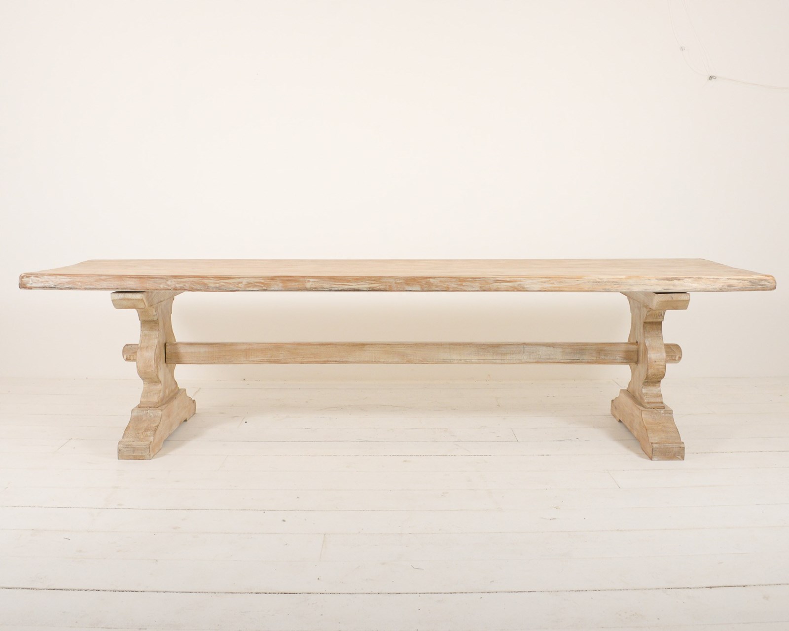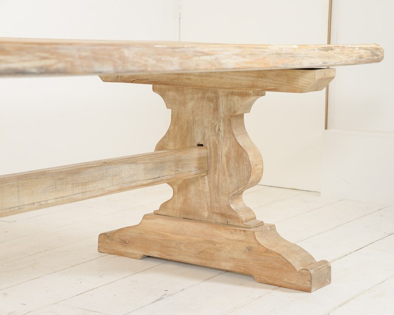 French 19th century monastery table. Solid oak on two plinths with screws and wooden pegs and a stretcher fixing. Very heavy top made of 3 large planks - 6cm deep. A lovely limed finish in its restoration. Easily seating 10 people, the distance between the end of the table top and the first leg plinth is 30cm, the plinths are each 13cm wide, 190cm between the two plinths and then 13cm and 30cm again over a total of 3m of table top.