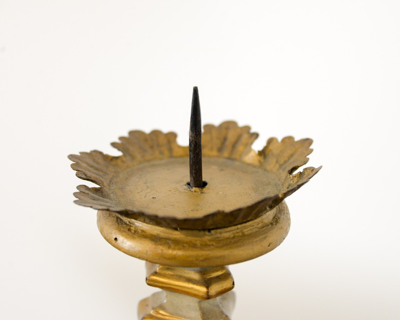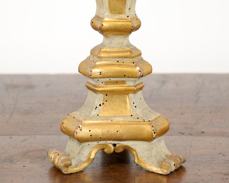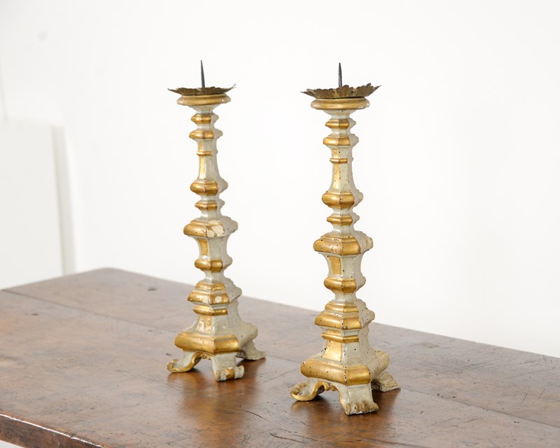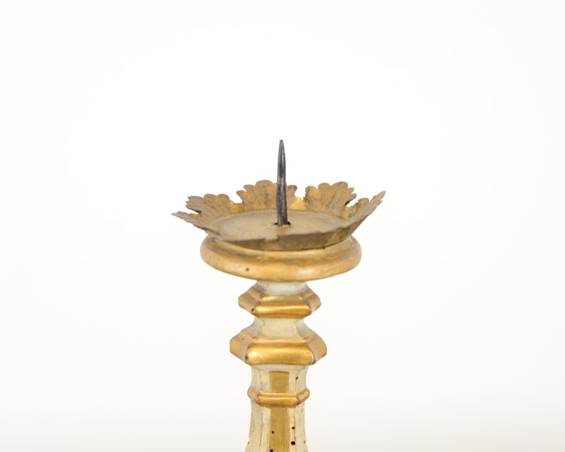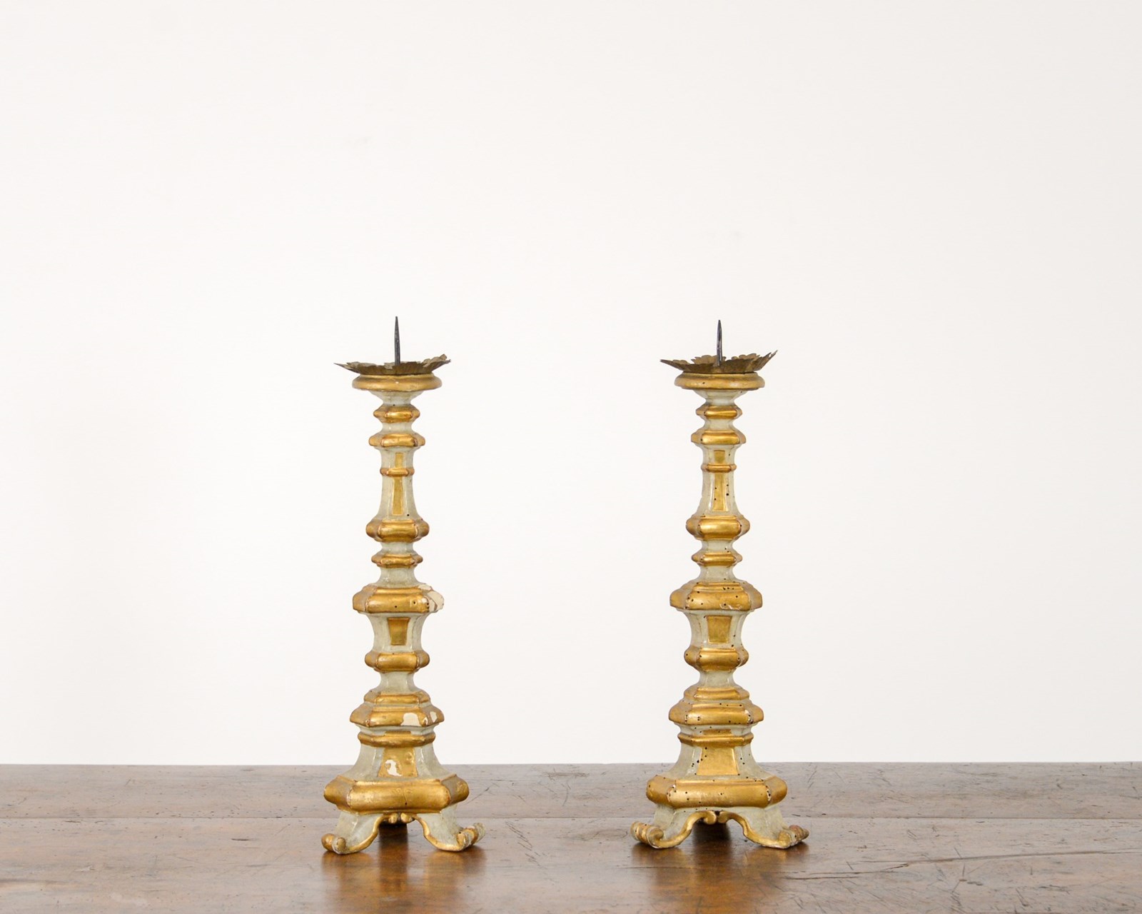 Pair of wooden Swedish candlesticks, late 19th century, decorated with areas of gilt. Original metal drip holders.