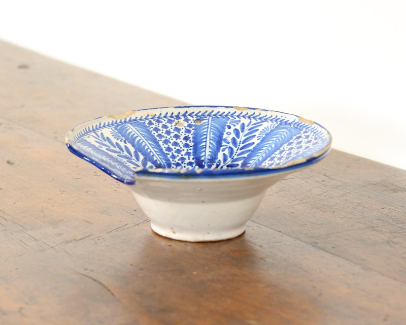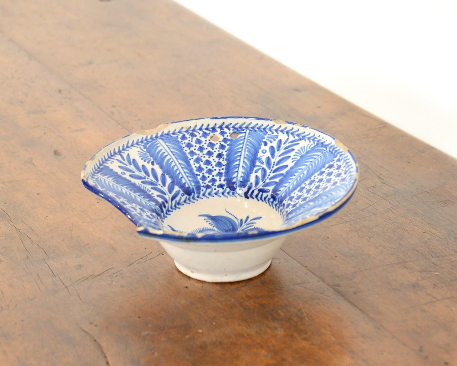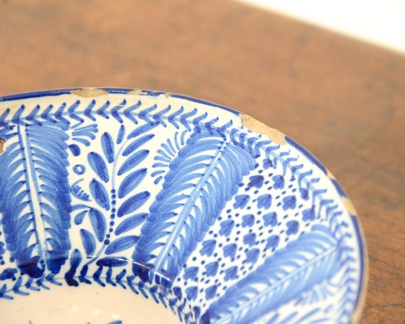 19th century Spanish blue and white glazed shaving bowl. Wear and tear commensurate with age. A charming decorative piece of ceramic.
