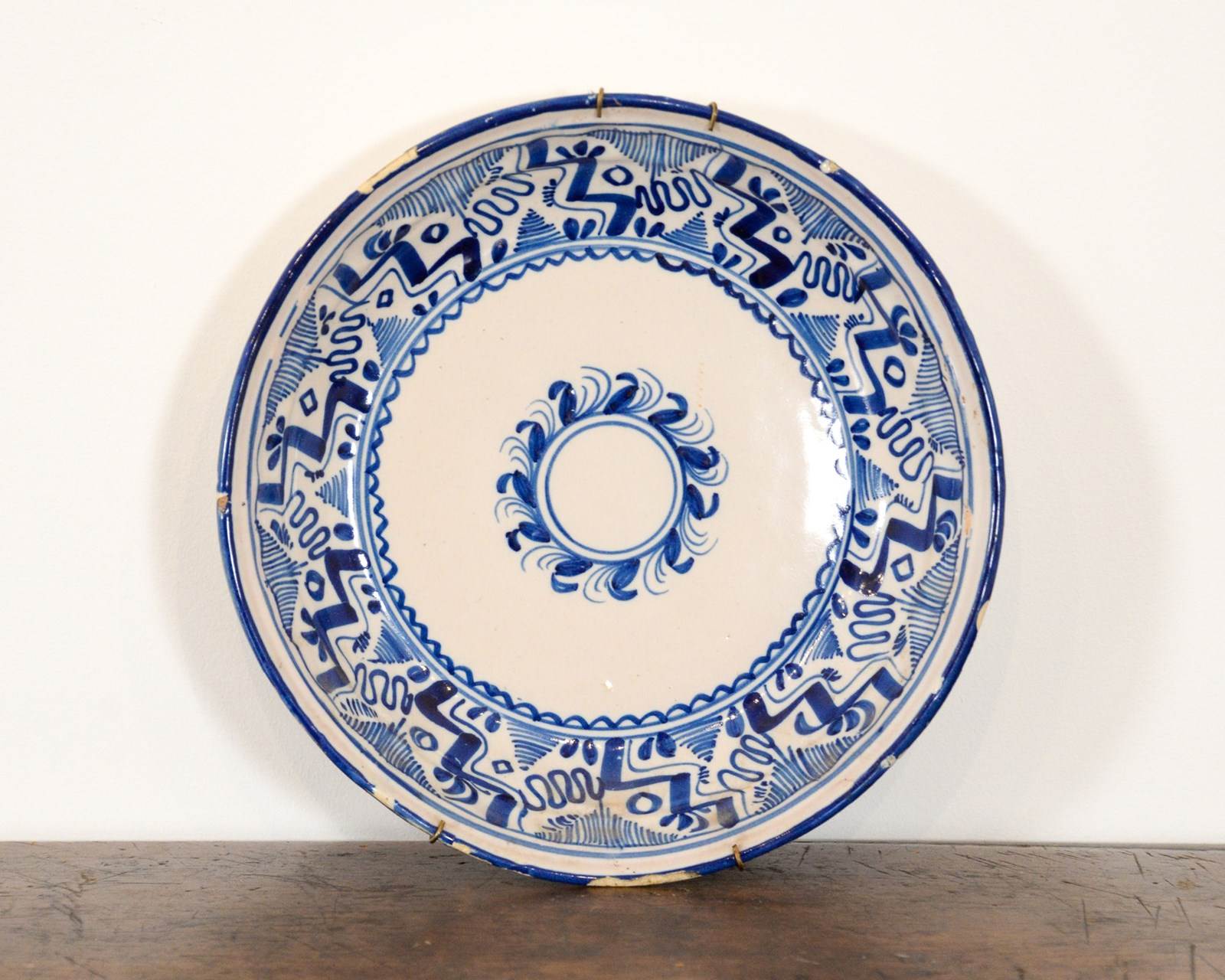 Spanish 19th century blue and white glazed plate. Valencia, Spain. Wear and tear commensurate with age. Currently with a wire plate hanger on the back.