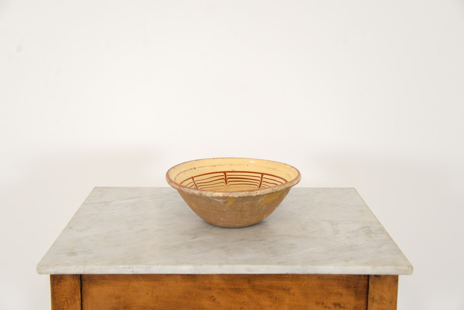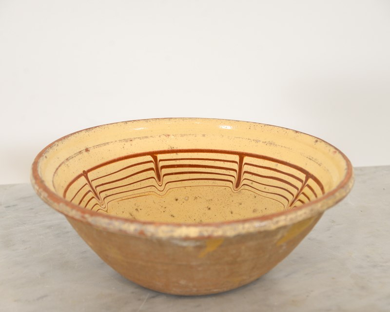 19th century Spanish terracotta bowl with ochre glaze and umber pattern.