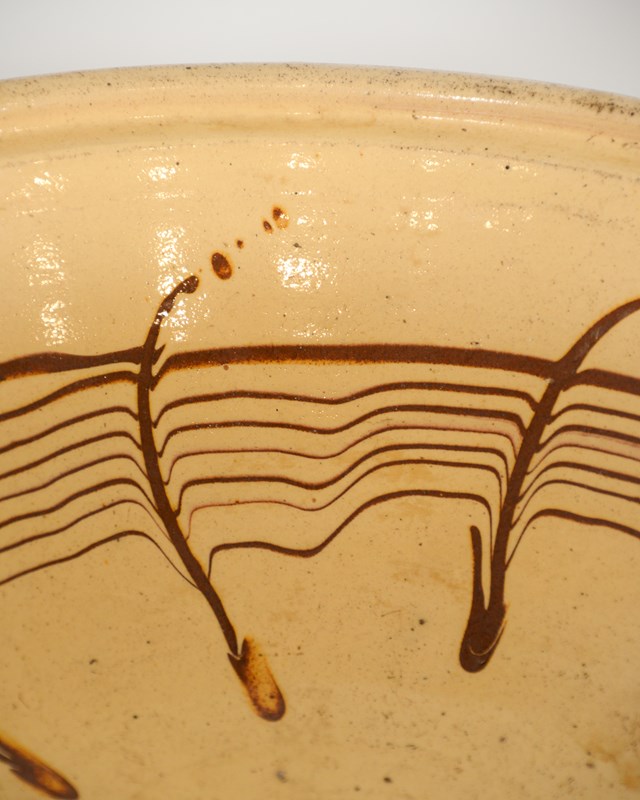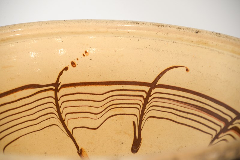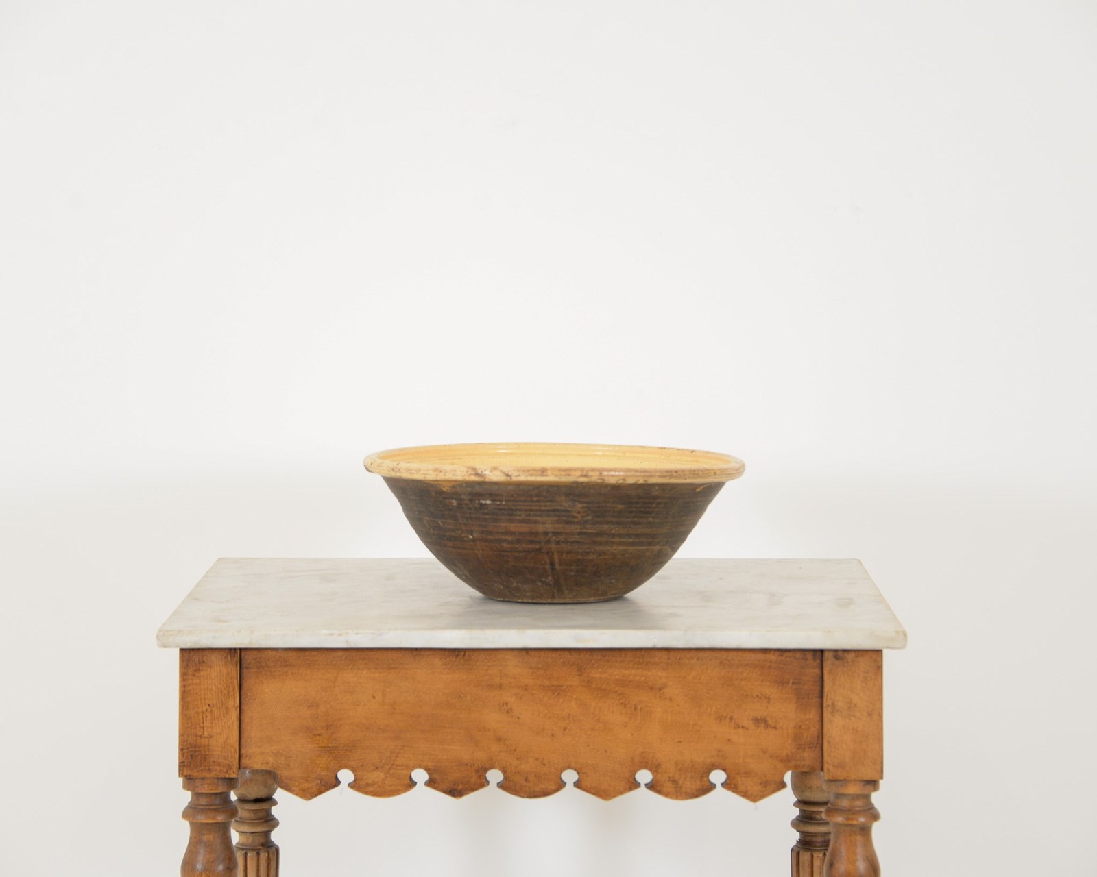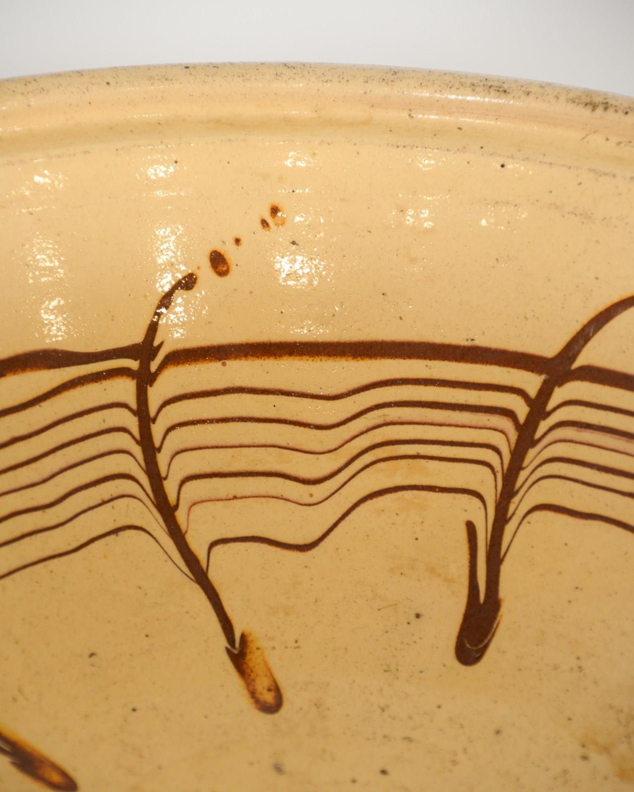 Spanish 19th century terracotta bowl with ochre glaze and umber pattern. Darker patina to the outside of the bowl.