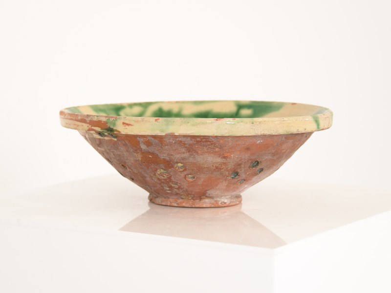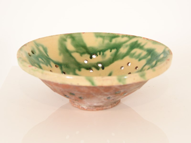 Spanish 20th century terracotta drainer bowl with a green and cream glaze.