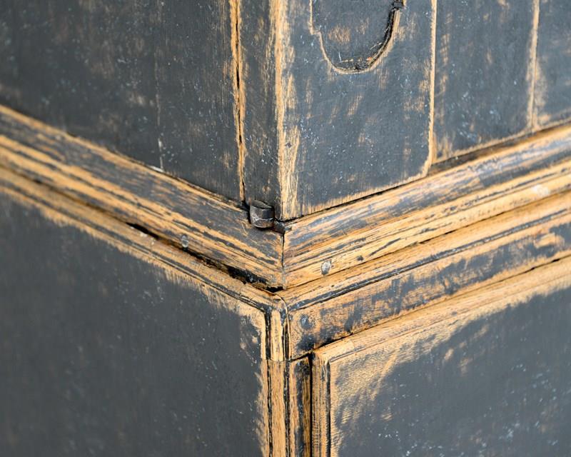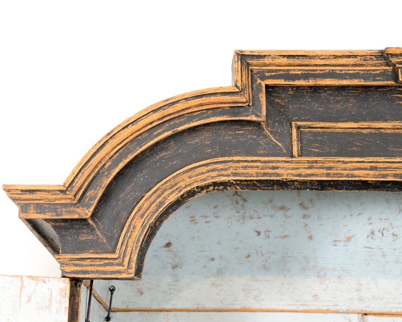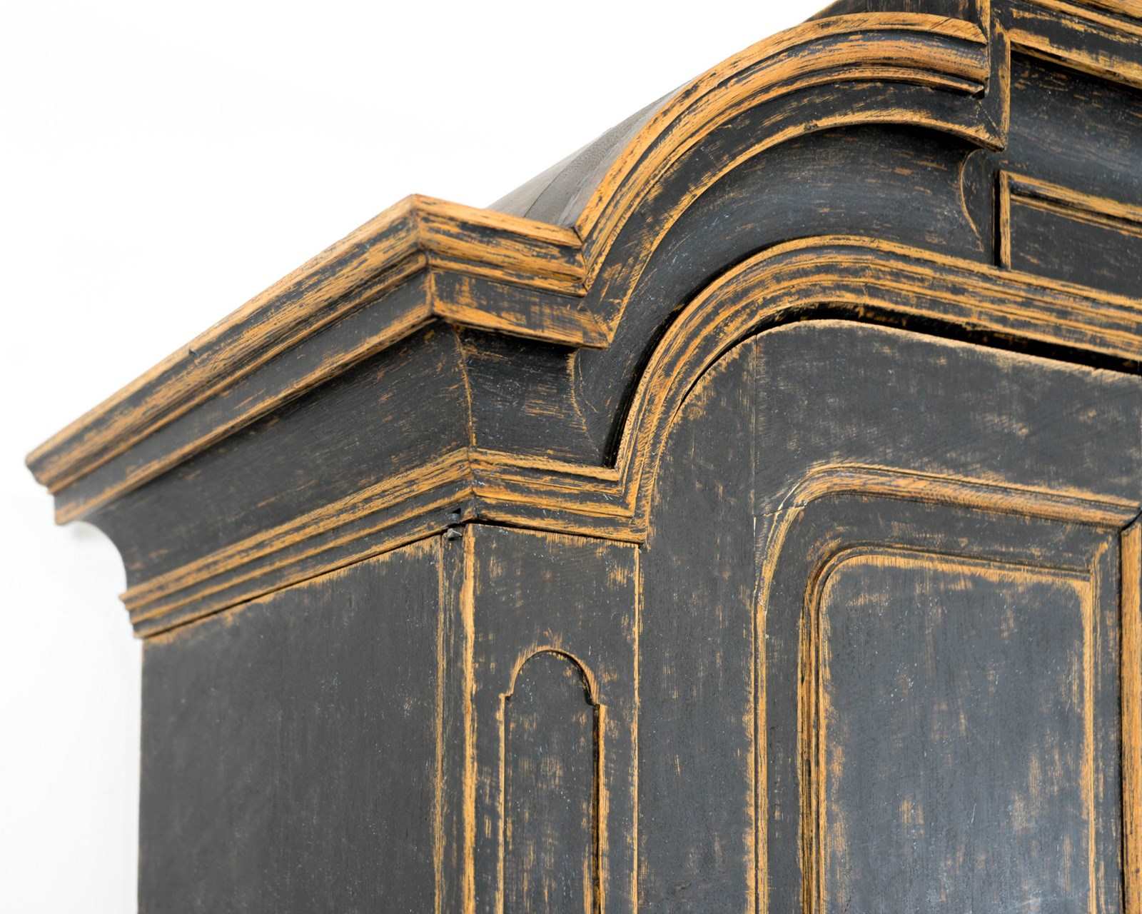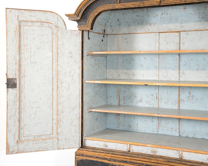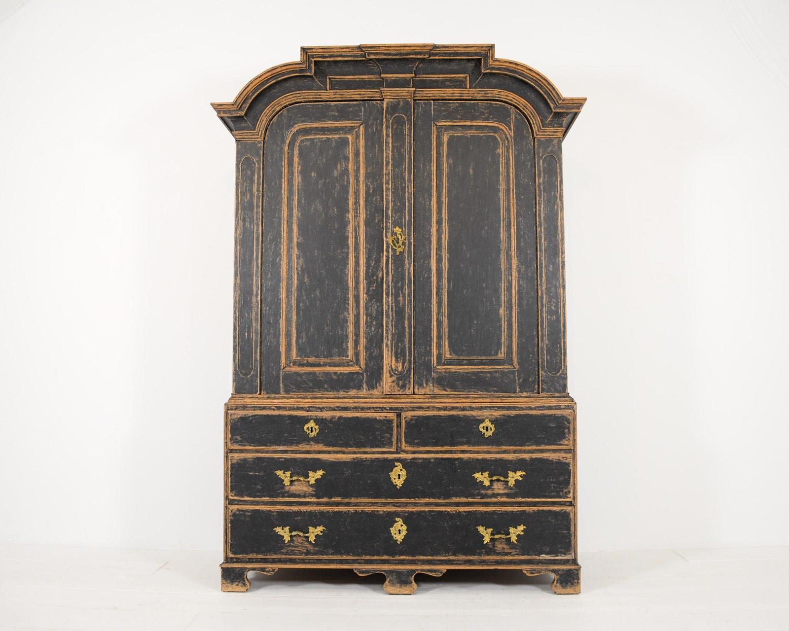 Swedish two tier cabinet of Baroque origin, dating 1770. Four drawers at the base with a canopied cupboard above with 3 shelves and three thin drawers. Original hardware and keys with later black, scraped paint. The crown comes off for transporting and is secured with original iron hooks and the doors also come off easily. The most wonderful piece for a room with good height, one I'd love to keep!