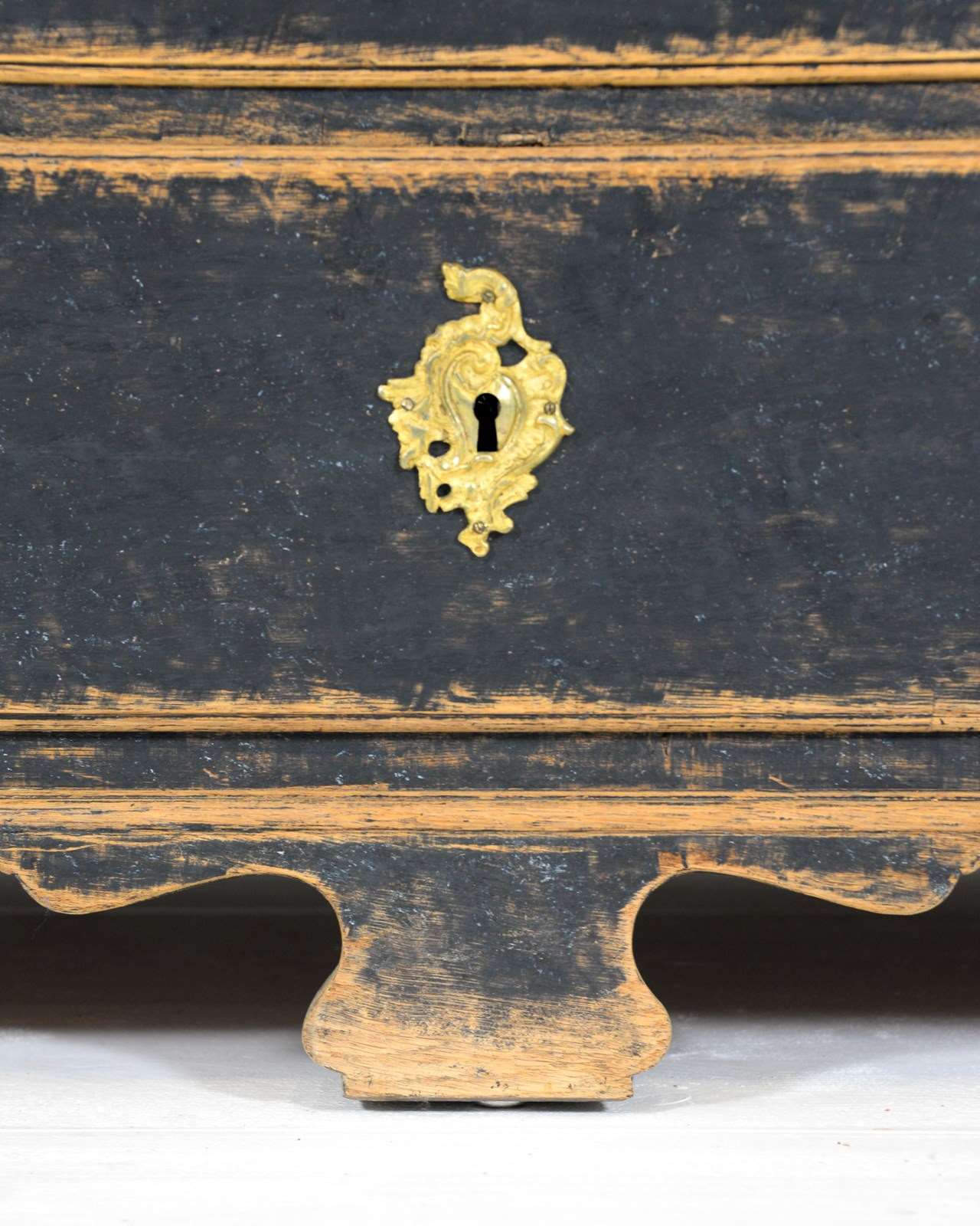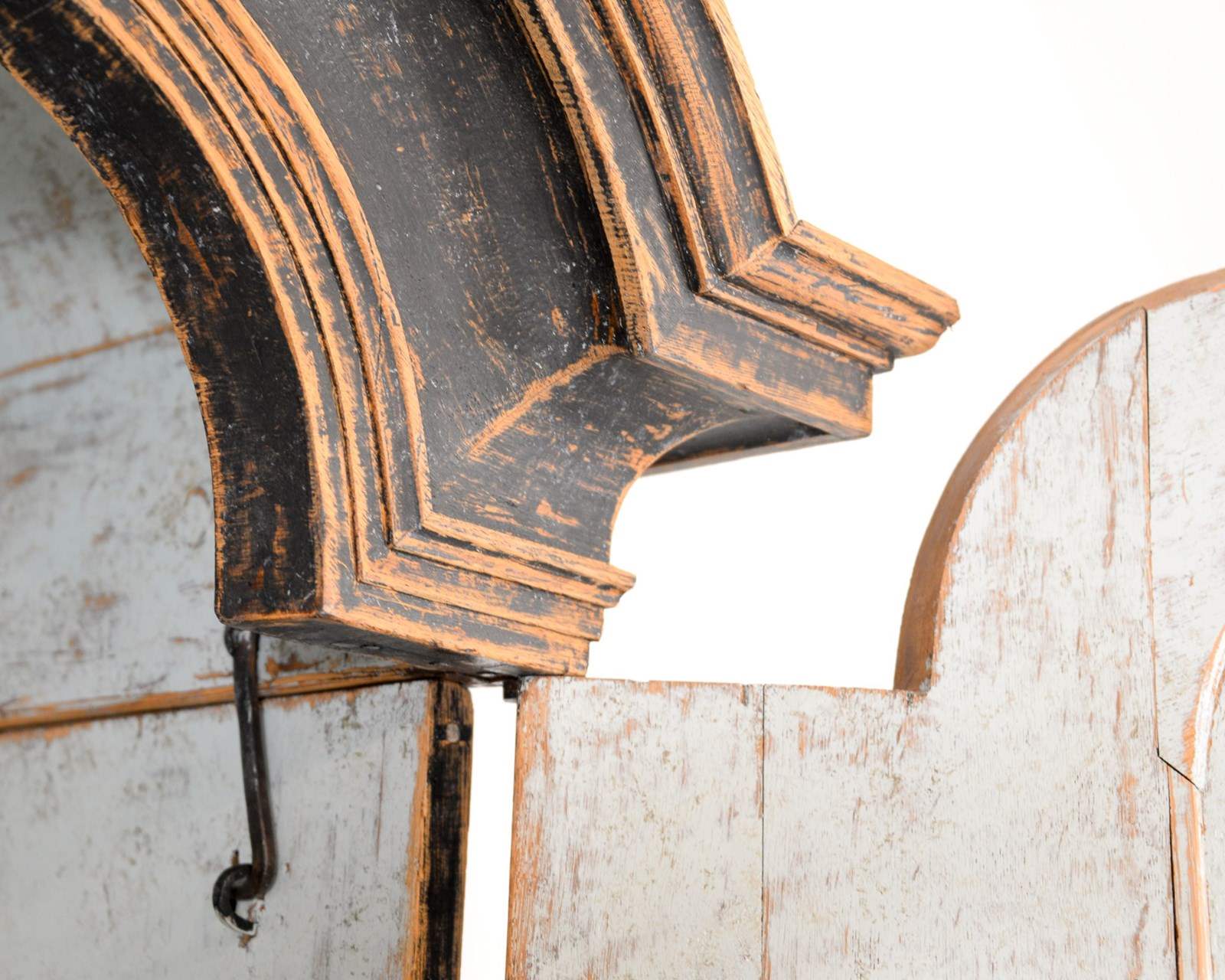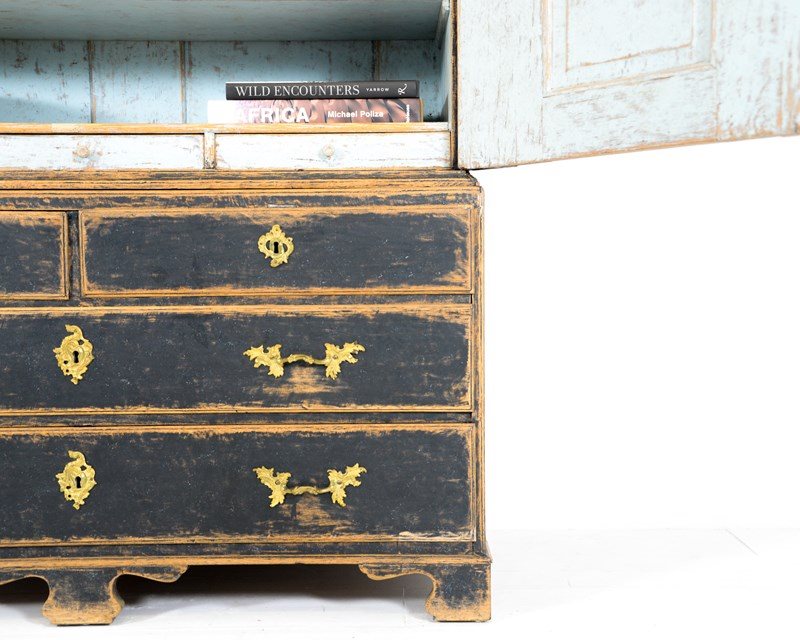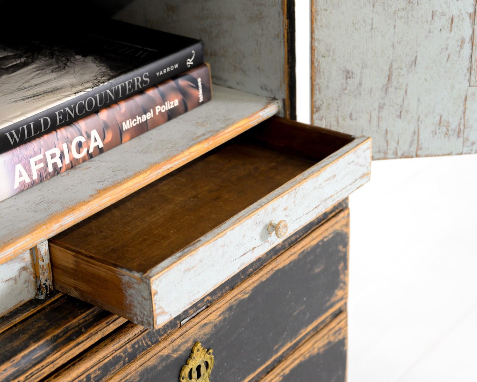 Swedish two tier cabinet of Baroque origin, dating 1770. Four drawers at the base with a canopied cupboard above with 3 shelves and three thin drawers. Original hardware and keys with later black, scraped paint. The crown comes off for transporting and is secured with original iron hooks and the doors also come off easily. The most wonderful piece for a room with good height, one I'd love to keep!