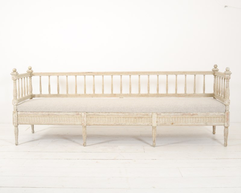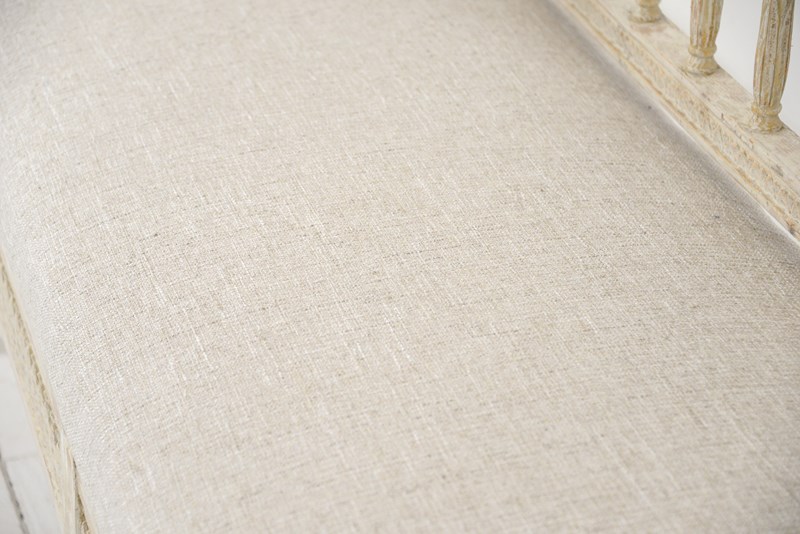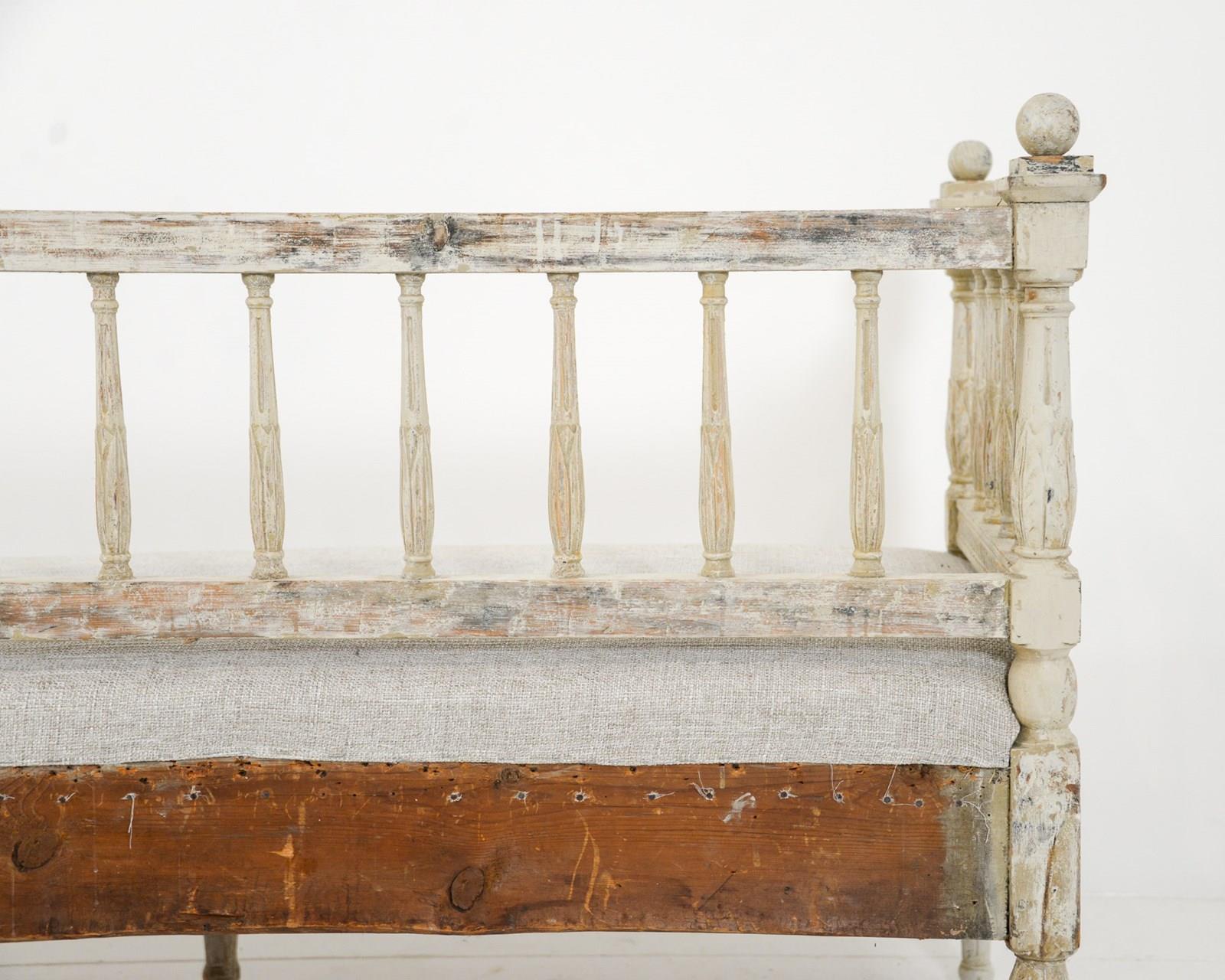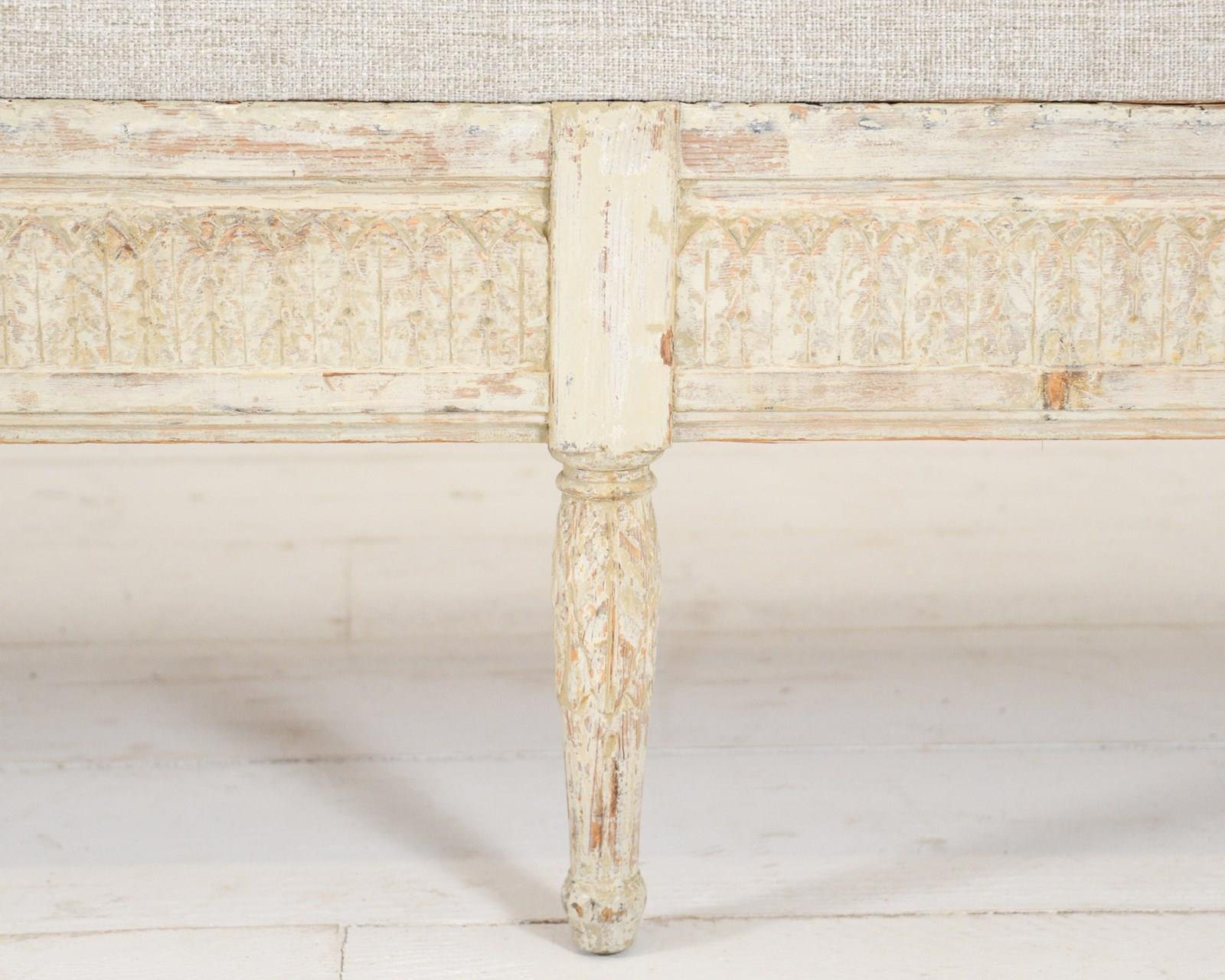 Swedish early 19th century sofa, the woodwork scraped back to original pale cream paint with some further later paint. Recently upholstered in neutral Belgian linen. Wonderful for a large entrance hall or drawing room. Seat height 46cm.