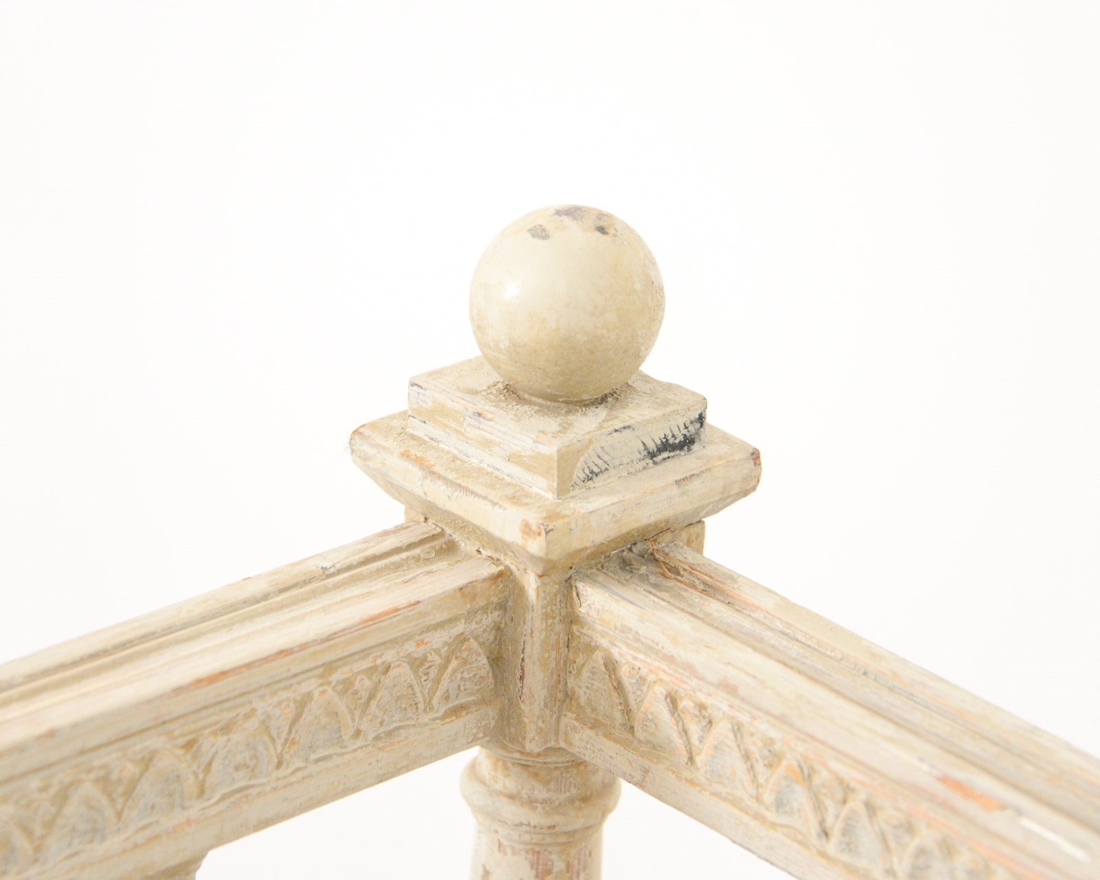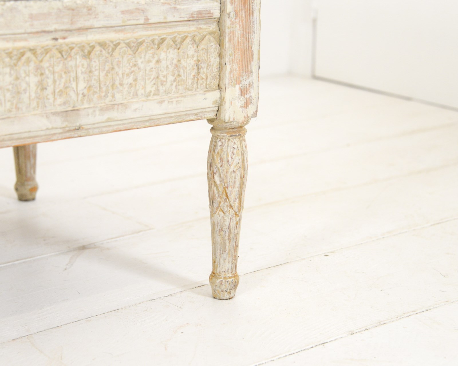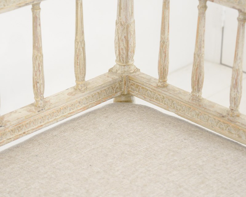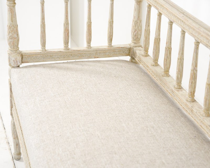 Swedish early 19th century sofa, the woodwork scraped back to original pale cream paint with some further later paint. Recently upholstered in neutral Belgian linen. Wonderful for a large entrance hall or drawing room. Seat height 46cm.