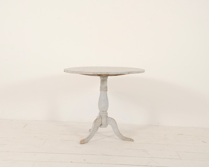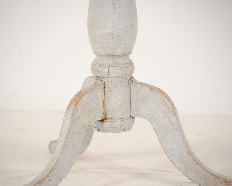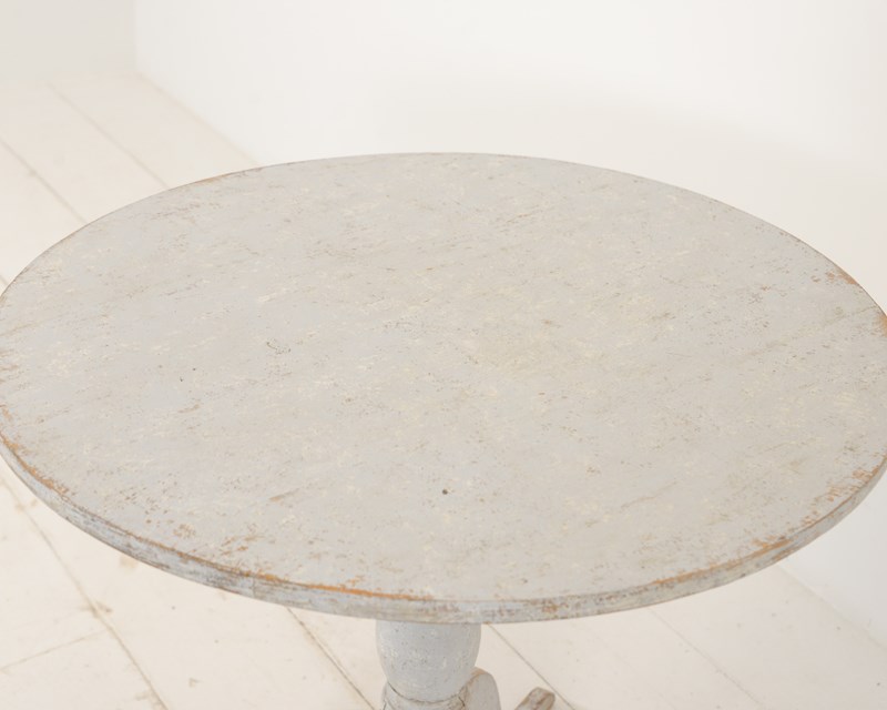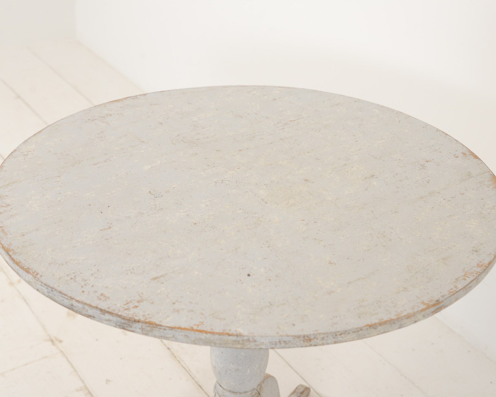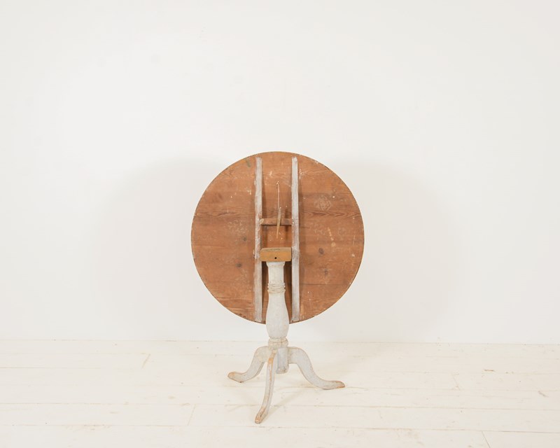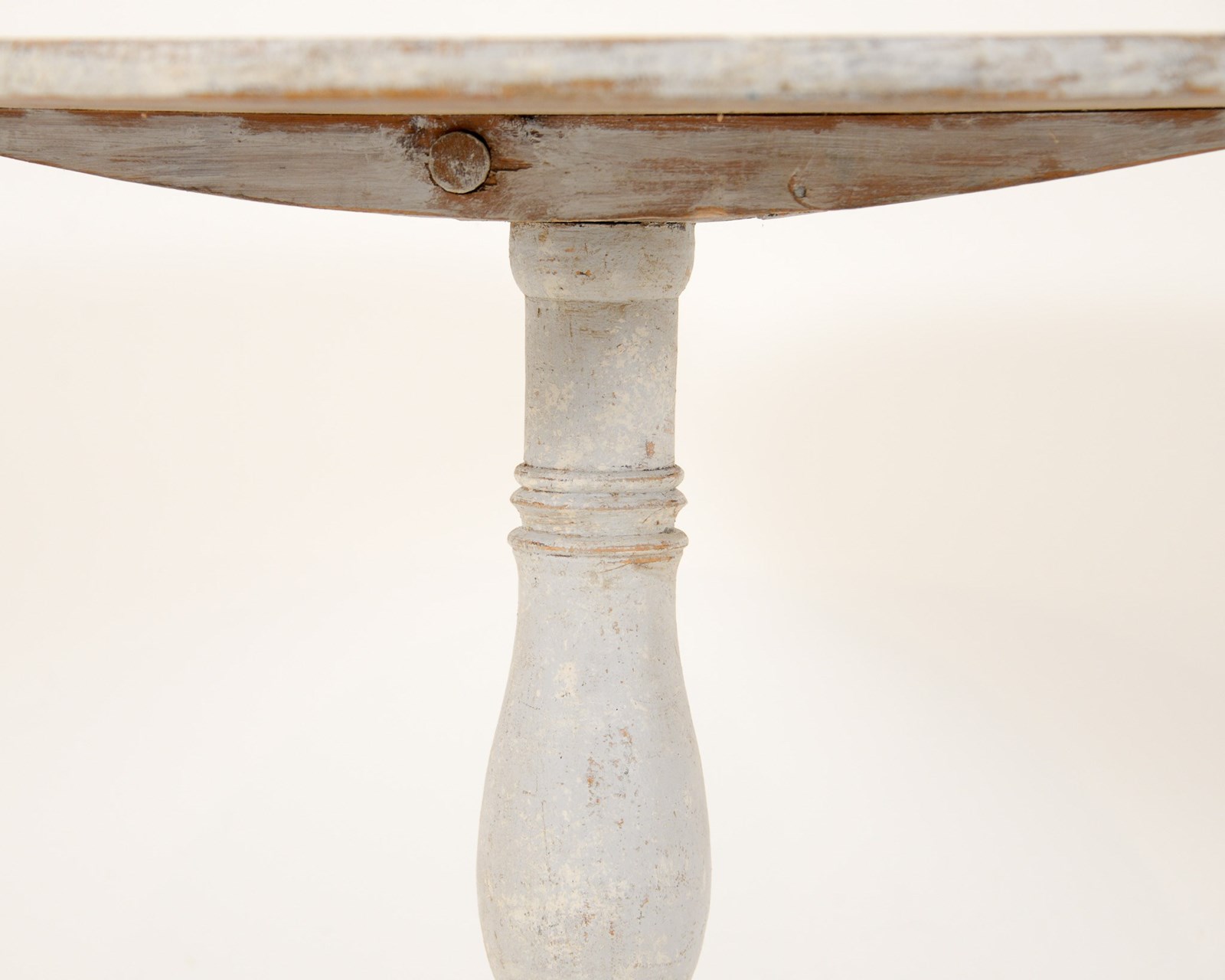 A pretty tilt top table from Sweden, late 19th century, pine, scraped with some later paint. The table top is held in place by a wooden peg.
