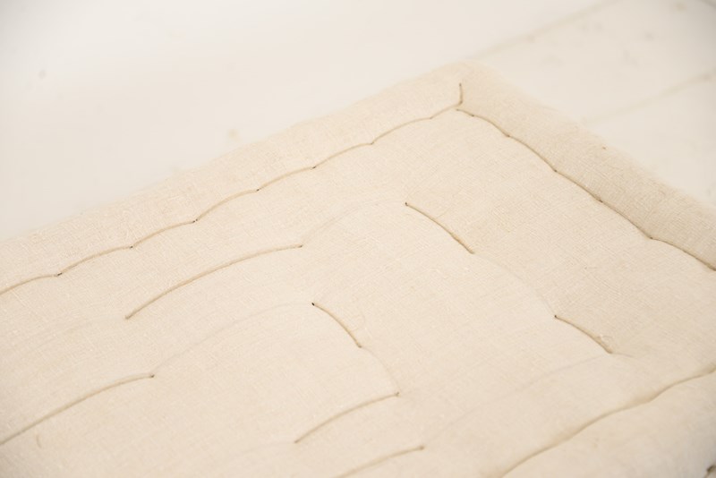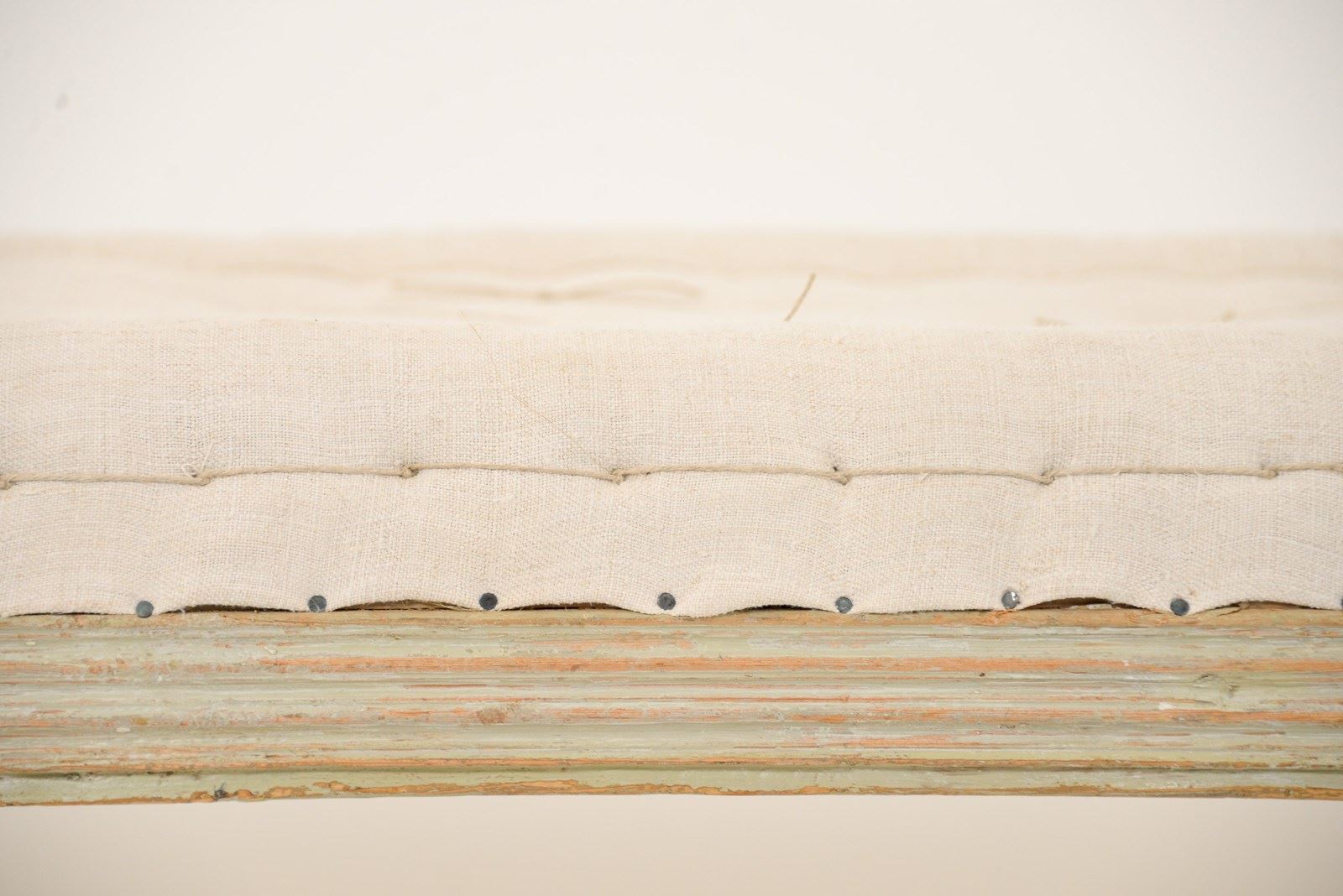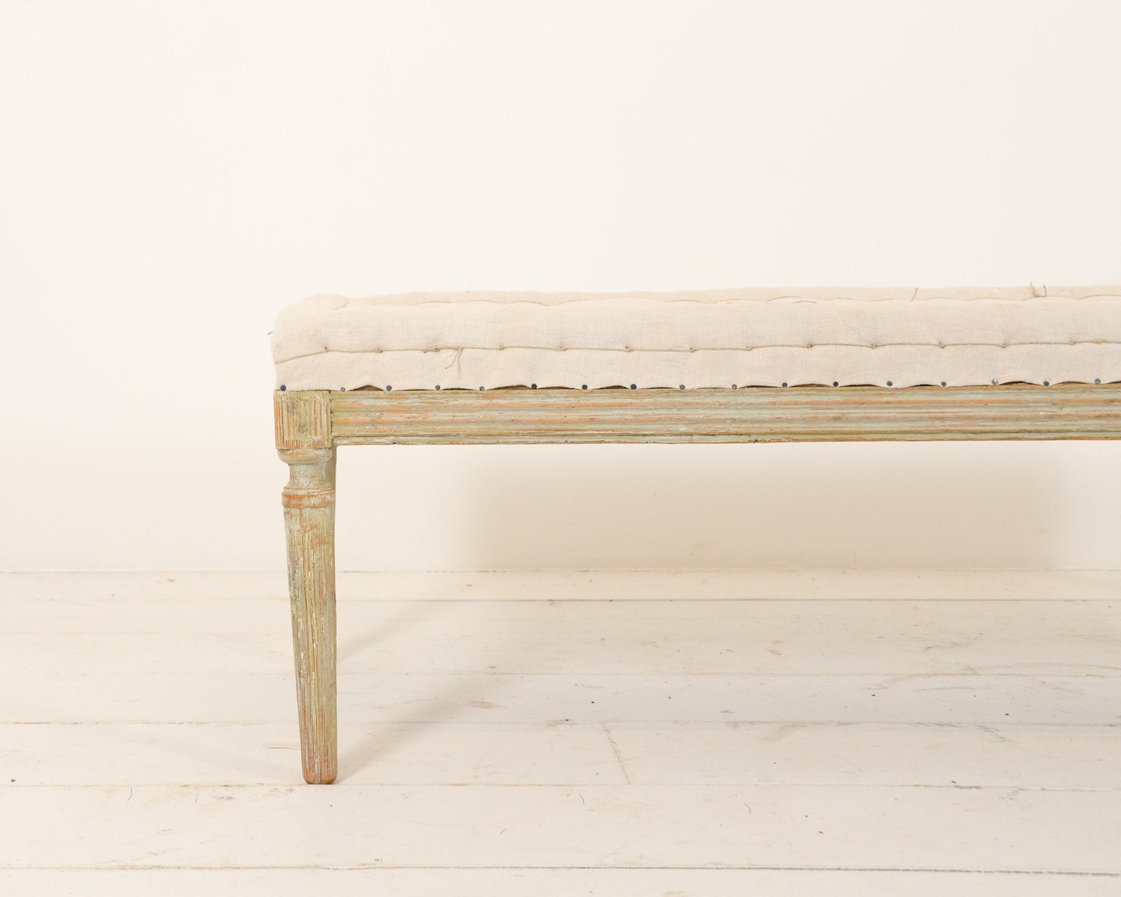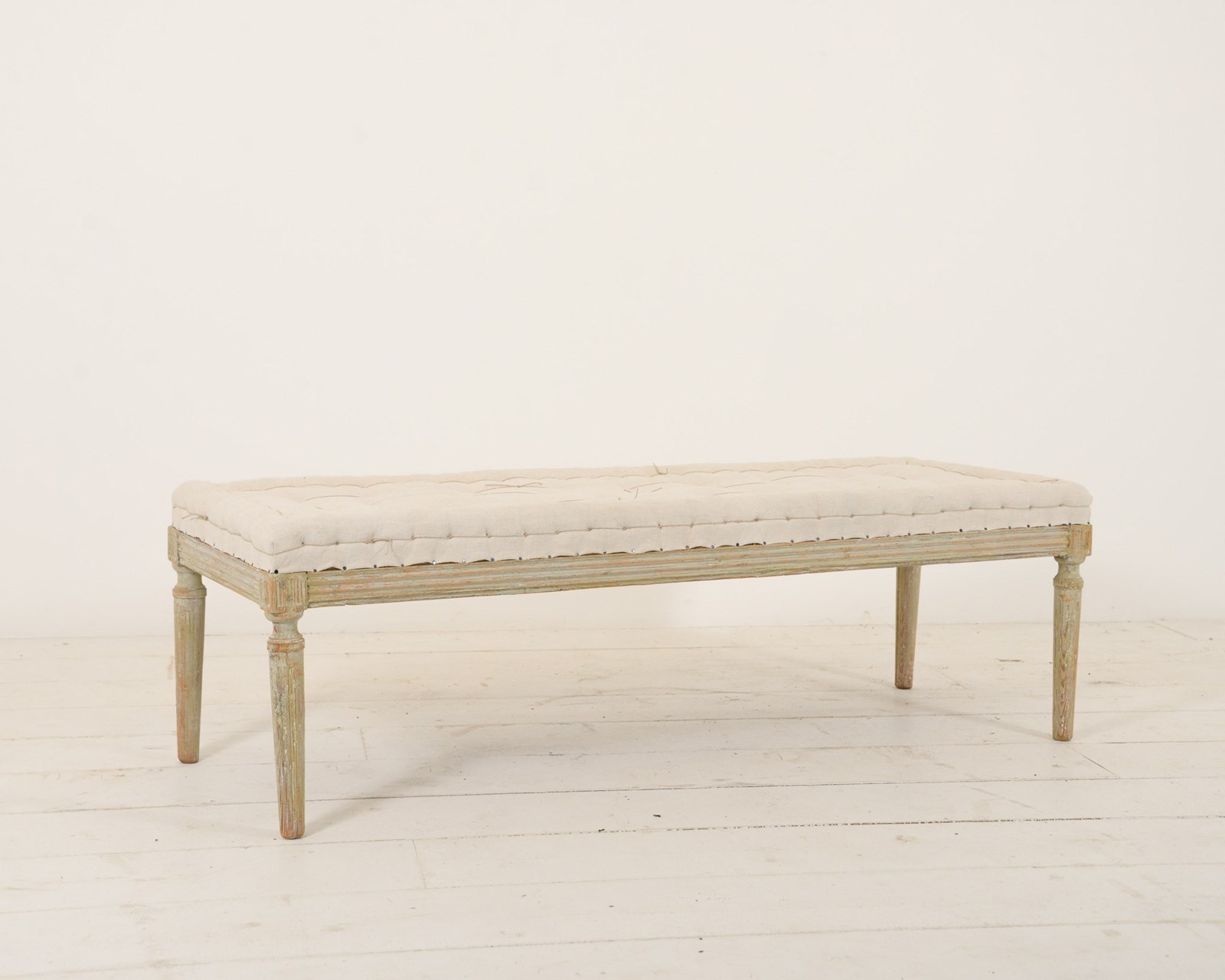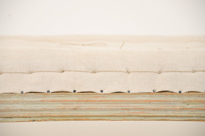 19th century Swedish upholstered bench. Scraped back woodwork with a slightly pale green hue to it appearing through the cream paint. Recently reupholstered with neutral linen.