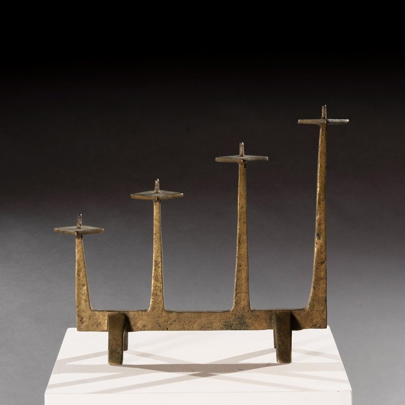 Conceived in the Brutalist style, this fine candelabrum for four candles of staggered heights is a lovely piece of 1960s design. Manufactured in hammered solid bronze which has attained a fine colour and patination, the four pricket candlestick platforms extend upwards from a flat base supported on four square legs. The bronze has been hammered out by hand and so has tooling marks which add great charm to the planished finish of the piece. The variation in colour across the piece is highly attractive. Making use of the pricket candlestick, a traditional form which was one of the earliest candlestick designs in use in Europe, the piece has simple lines and its modernist aesthetic, combined with the high quality construction and luxurious metal used, makes it a real statement piece.