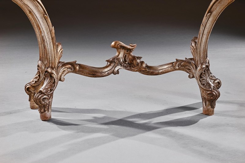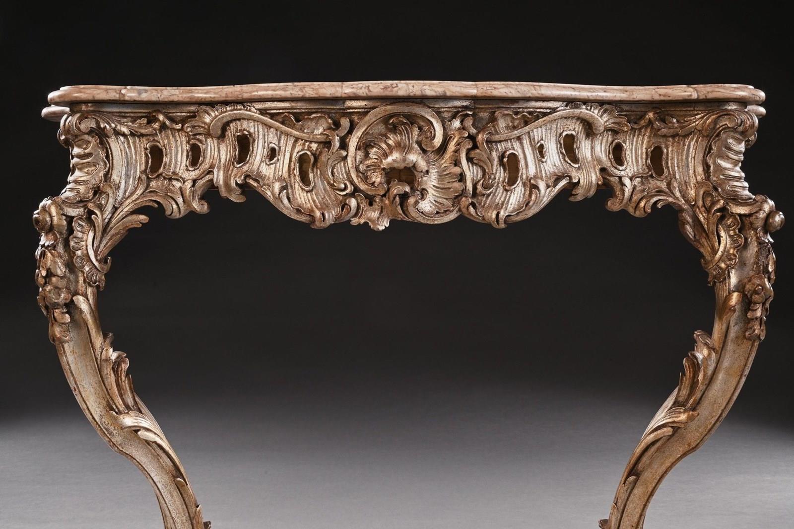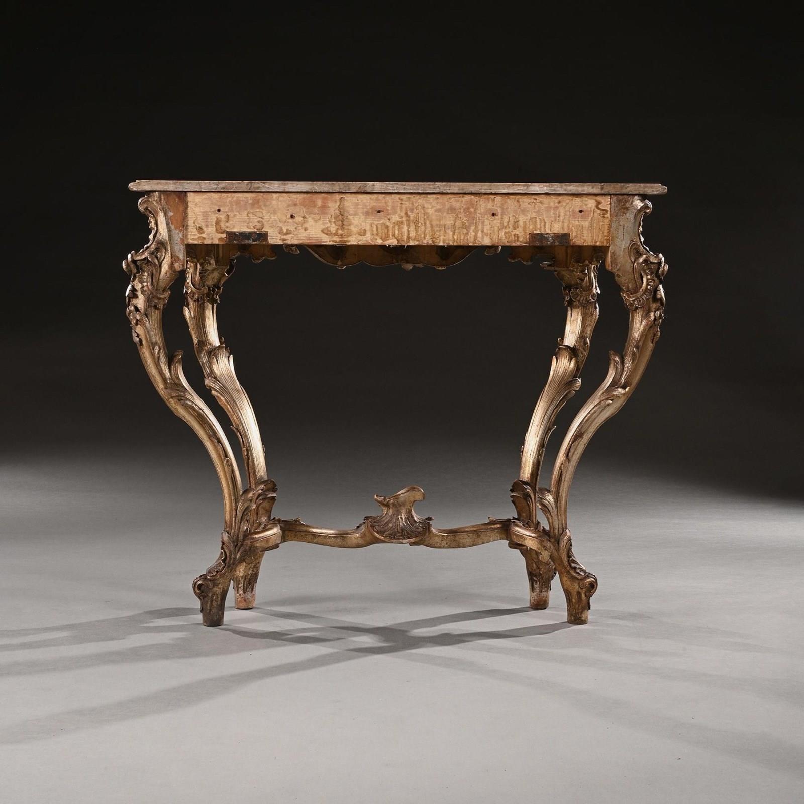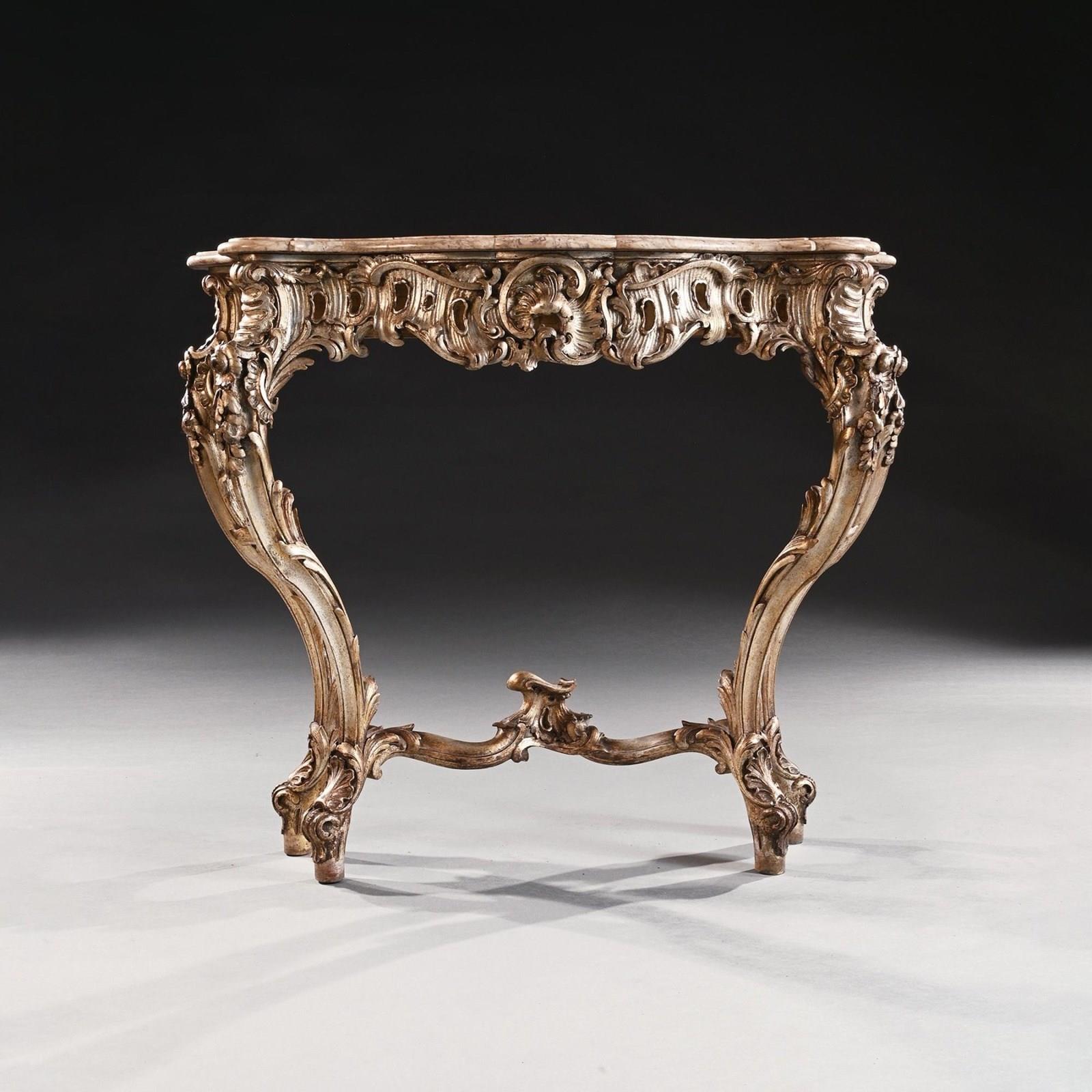 Of sumptuous rococo form, this fine console table centres on an cartouche, surrounded by scroll carving. The combination of foliate detailing and fretted areas is highly attractive, as is the wonderfully playful "cloud-shaped" marble top which is original to the piece.