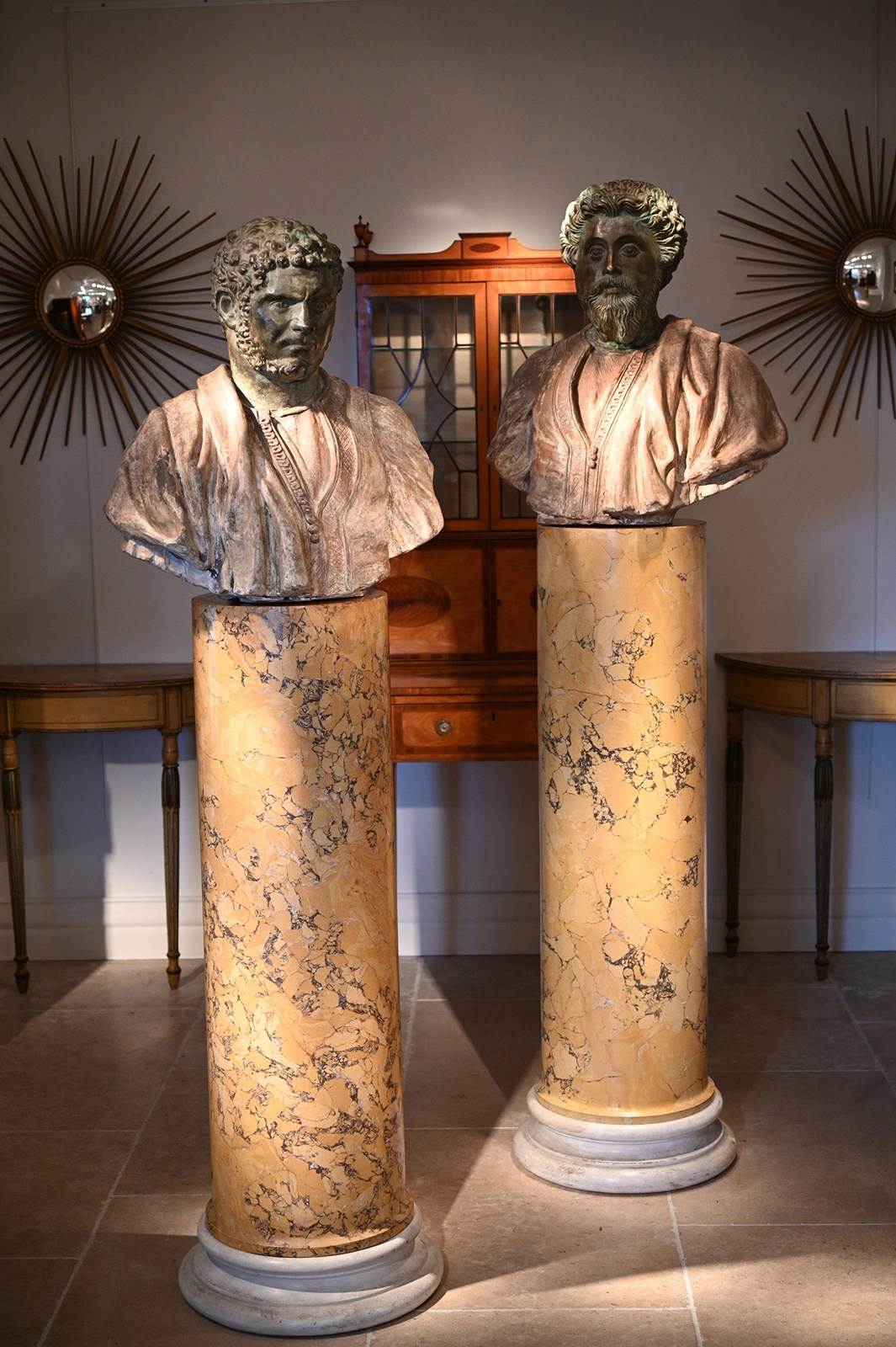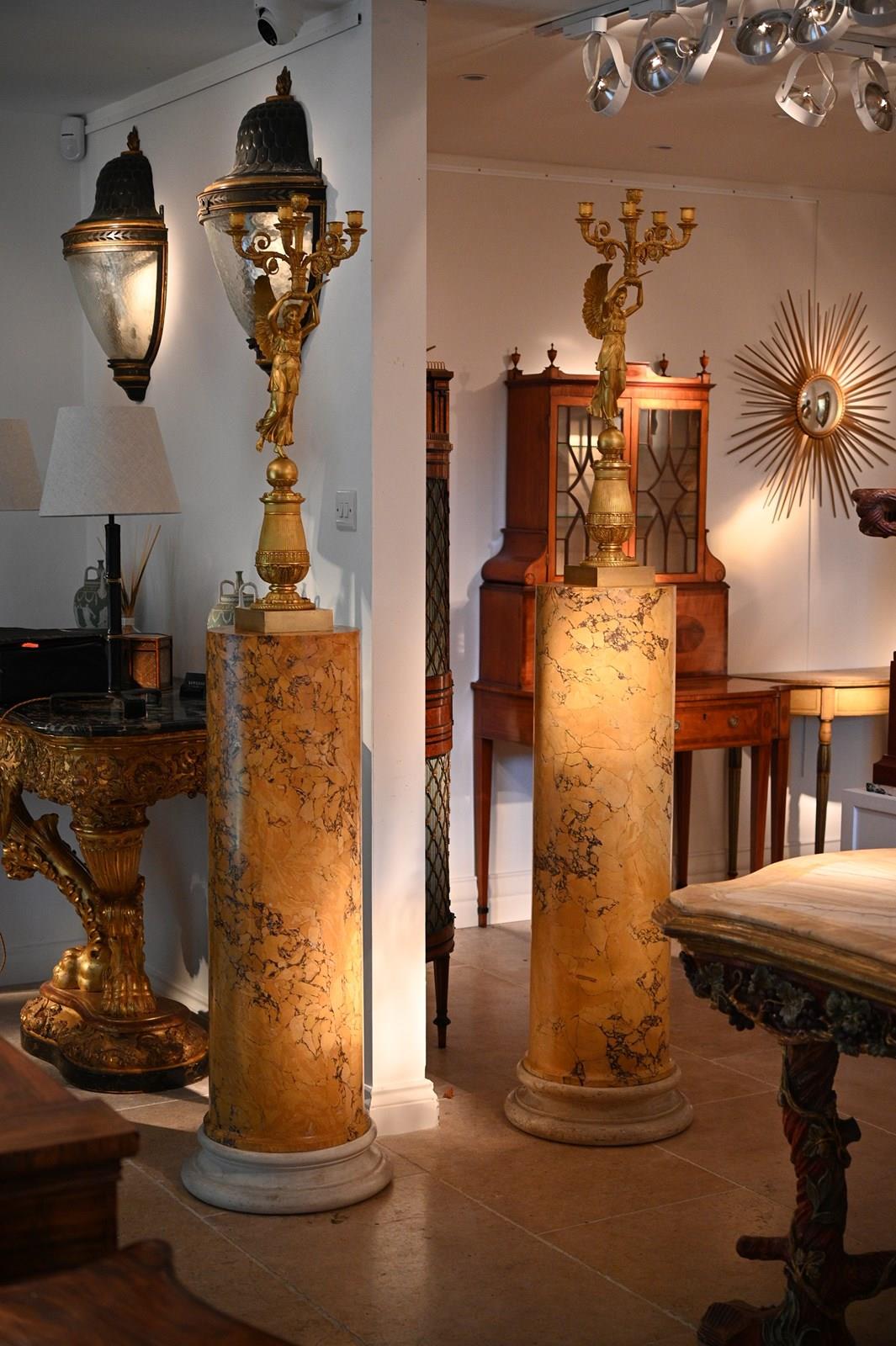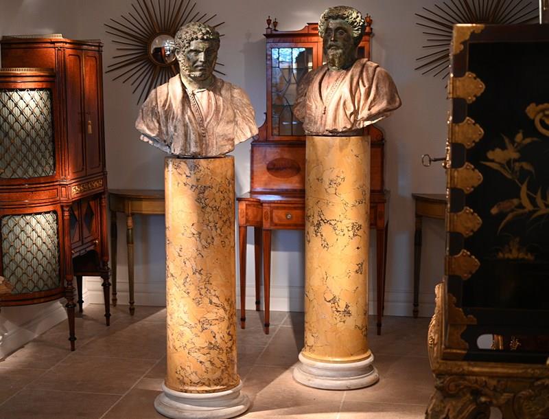 Scagliola is the process of creating sophisticated imitations of marbles using a combination of plaster of Paris, glues and pigments. The best examples as per out pair are then painstakingly painted with veining and the other surface treatments necessary to imitate finely figured marbles, providing all of the decorative appeal without the weight associated with the use of natural marble. It is often wrongly assumed that the use of scagliola indicates cost saving when in many cases this was not the case at all. Scagliola columns were often featured in the most prestigious stately home interiors. One particularly fine example of this, incorporating scagliola columns that imitate Siena marble as with the present pieces, is the dining room in Spencer House in London