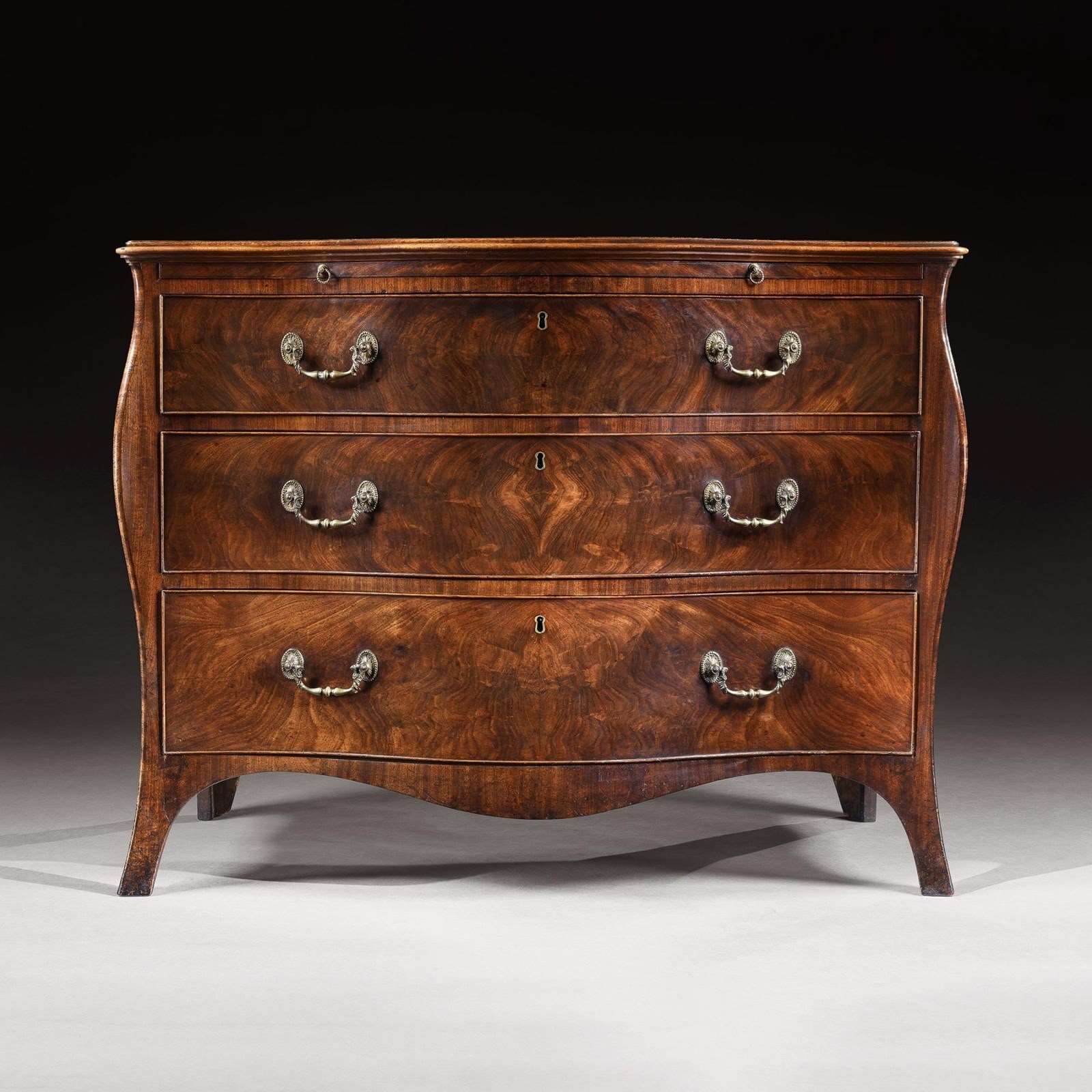 Of outstanding colour and patination, this fine commode is of serpentine shape, highly influenced by the French models of the late rococo period but with a very English sensibility. It is veneered throughout in mahogany of exceptional figure, the veneers bookmatched across the drawer fronts for additional visual impact. The veneers on the top of the piece are especially well figured and have aged beautifully. The commode consists of three drawers with a brushing slide above, standing on curving feet which come directly from the stiles as is usually the case on commodes of this form.