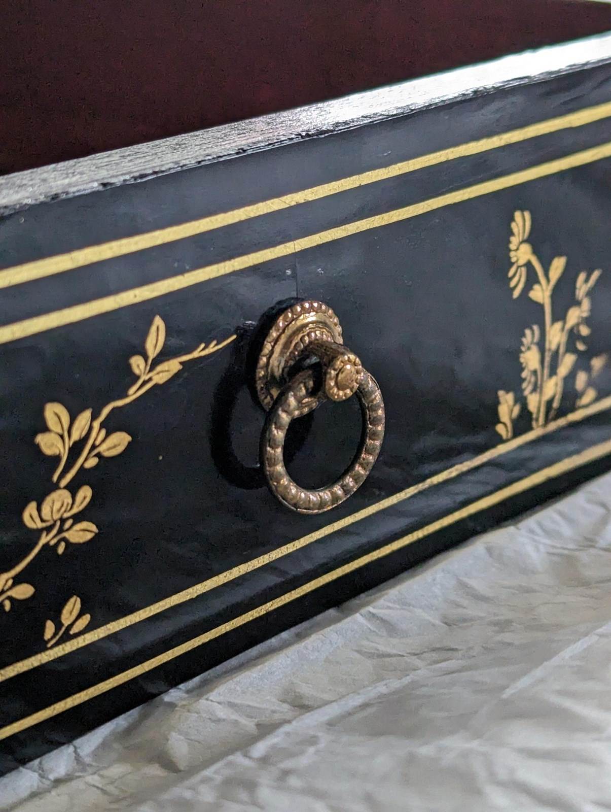 The metalware on this commode is also particularly noteworthy. The handles with their floral back plates are an especially fine model, beautifully cast, chased and gilded. The same backplates occur on another commode attributed to Hill sold at Christie's on the 20th of November 1986, lot 173. The handles on this commode, however, had different bales. What is particularly interesting on our piece is the very fine pattern of small handles used on the brushing slide. These appear to be identical to those used on the inner drawers on the Osterley Park lacquer secretaire supplied by Thomas Chippendale to the Earls of Jersey