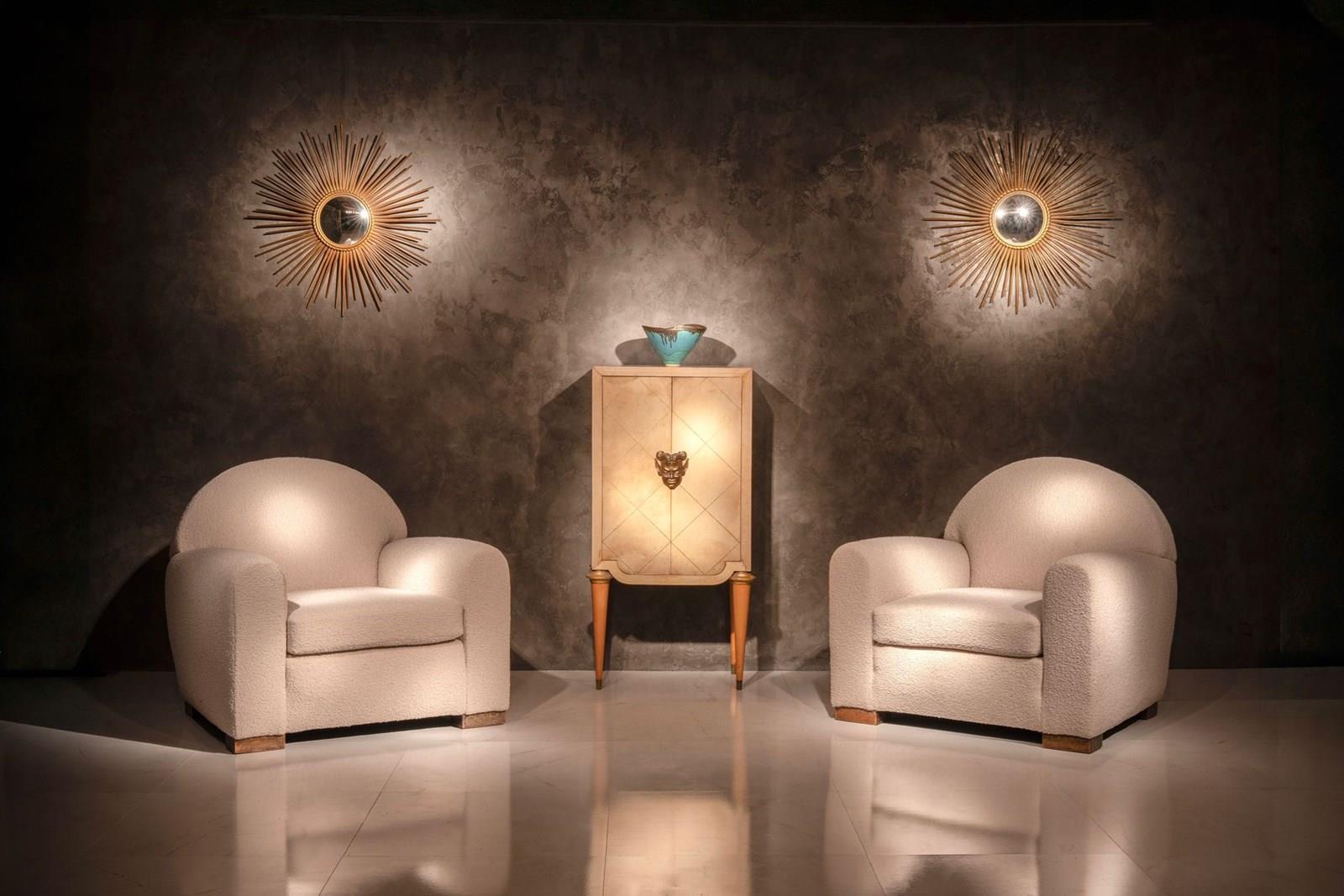 Many variations on the basic design were produced, with varying numbers of rays and different silhouettes being more or less circular in outline. Our pieces are one of the most successful of these designs with a perfect balance struck between the size of the plates and the length of the rays. The mirror frames are produced in gilt metal. The rays project from a rope twist bezel, one of the signatures of Vallauris design as opposed to one of their many imitators, and having central convex plates which are original. Pairs of mirrors of this sort are especially desirable and are not frequently encountered.
