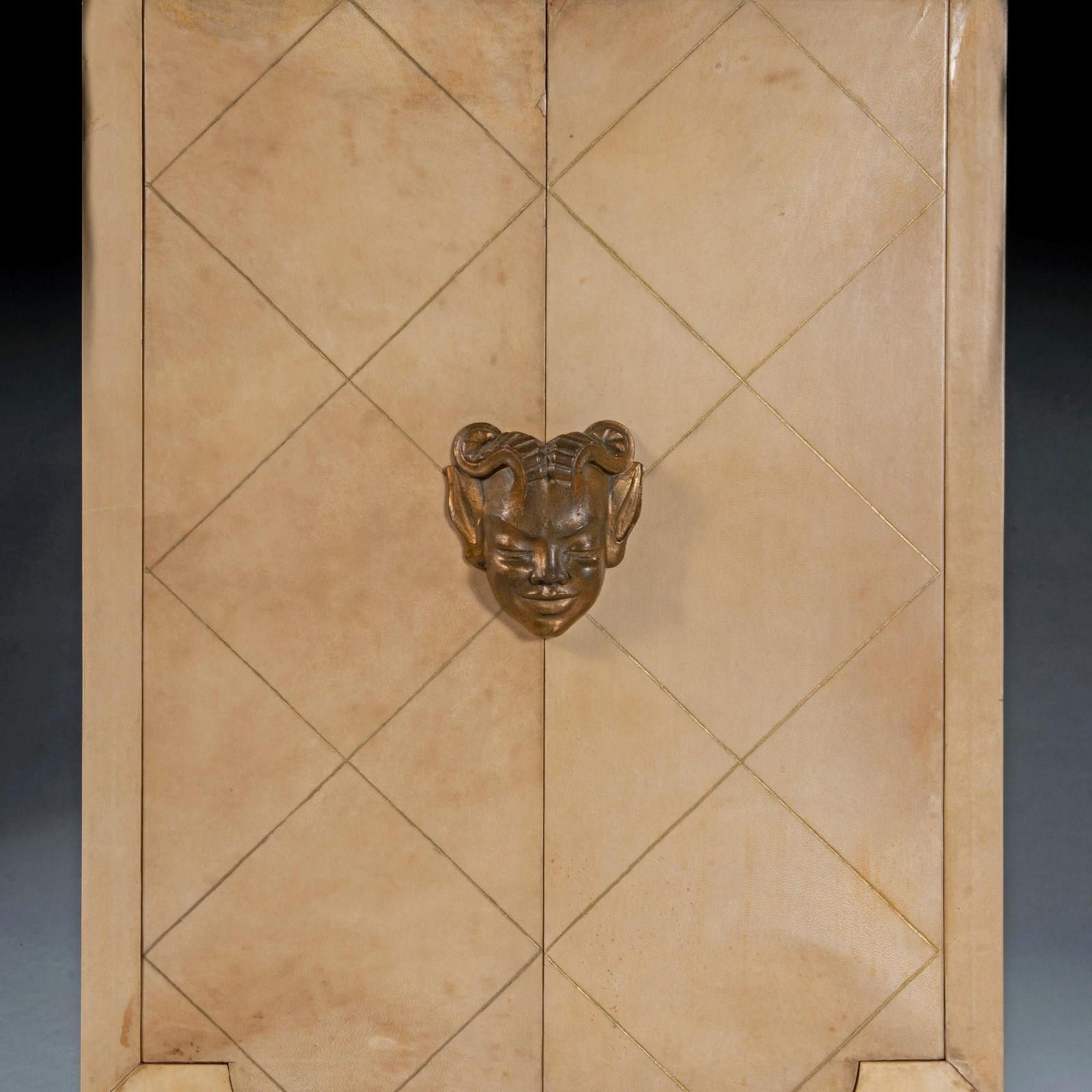 This rather extraordinary cabinet can be firmly attributed to the designer Maurice Jallot. A coffee table by Jallot featuring these same, highly distinctive, legs was sold by Phillips in New York on the 24th of May 2005. Additionally, a cabinet of similar form to the present piece but with simplified decoration was sold at Palm Beach Modern Auctions on the 21st of November 2015. This cabinet was also covered in parchment but has simpler handles rather than the faun's head mount. It does, however, employ precisely the same legs as on the present piece and provides further evidence for our attribution on that basis alone.