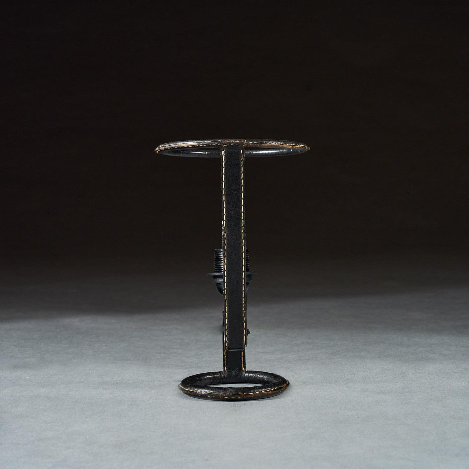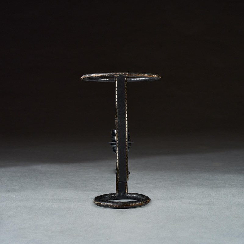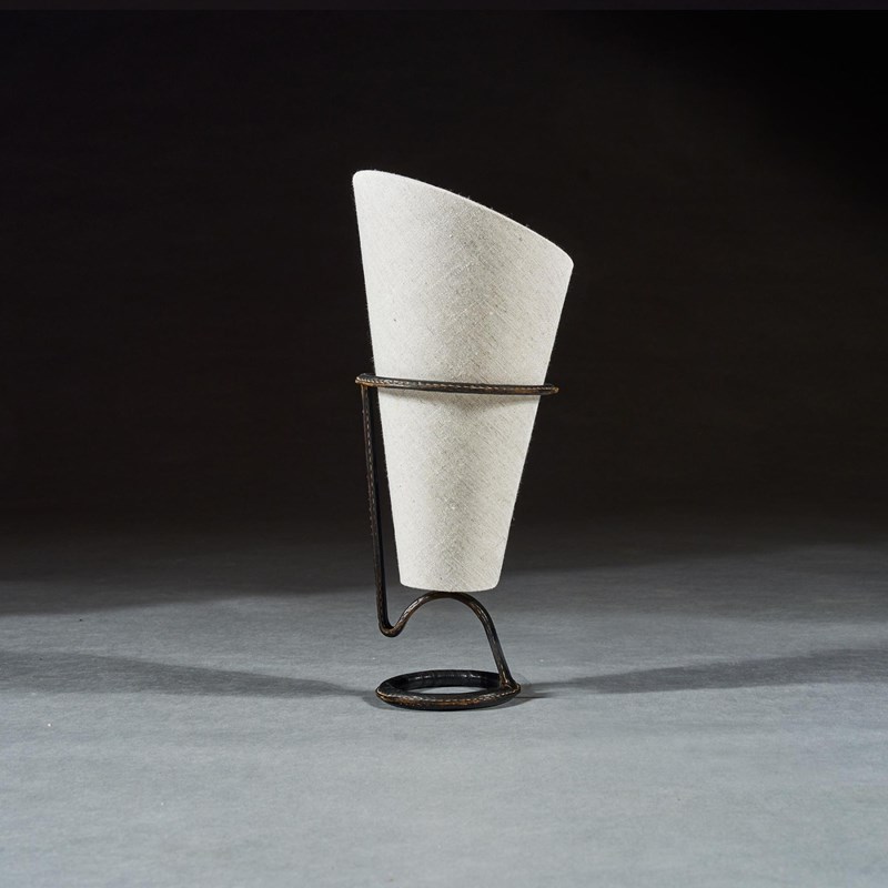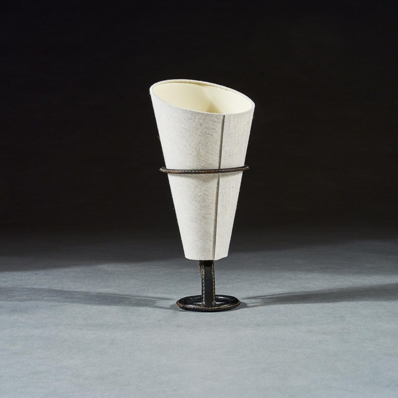 This striking design, utilising a folded torch or cone-shaped linen shade is firmly attributed to Jacques Adnet. The lamp base makes use of some of his signature features such as the use of hand-stitched leather with contrasting stitching covering the internal metal frame for a combination of aesthetic beauty and performance. Adnet is known to have made use of leather from the firm of Hermès of Paris in many of his productions and certainly the leather used in this piece is of the level of quality one would associate with that house. The torch form shade was utilised by many modernist designers in Europe and America at this time but rarely in combination with a leather-trimmed frame as found here, further proof of Adnet's propensity for going above and beyond and finding luxury in utility.