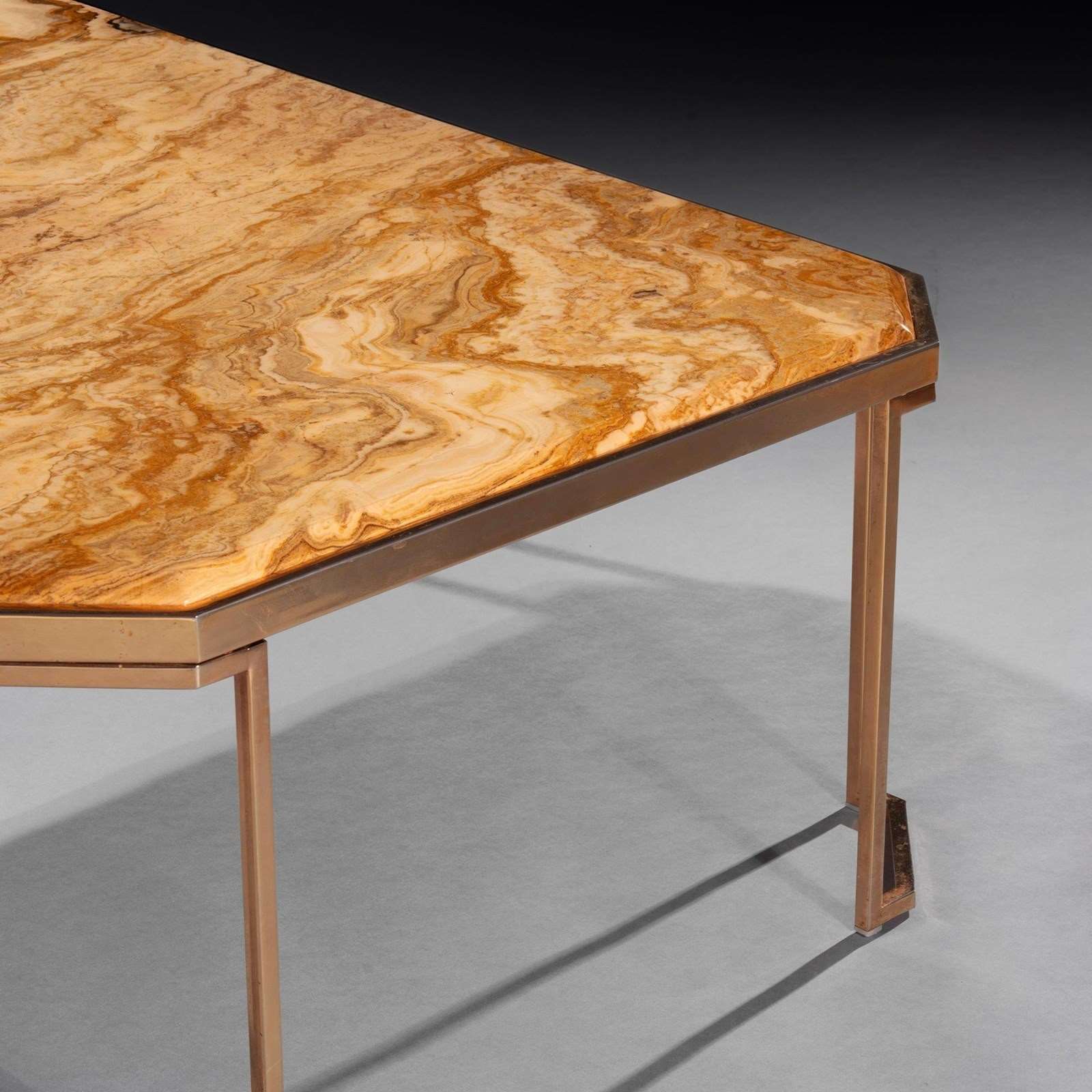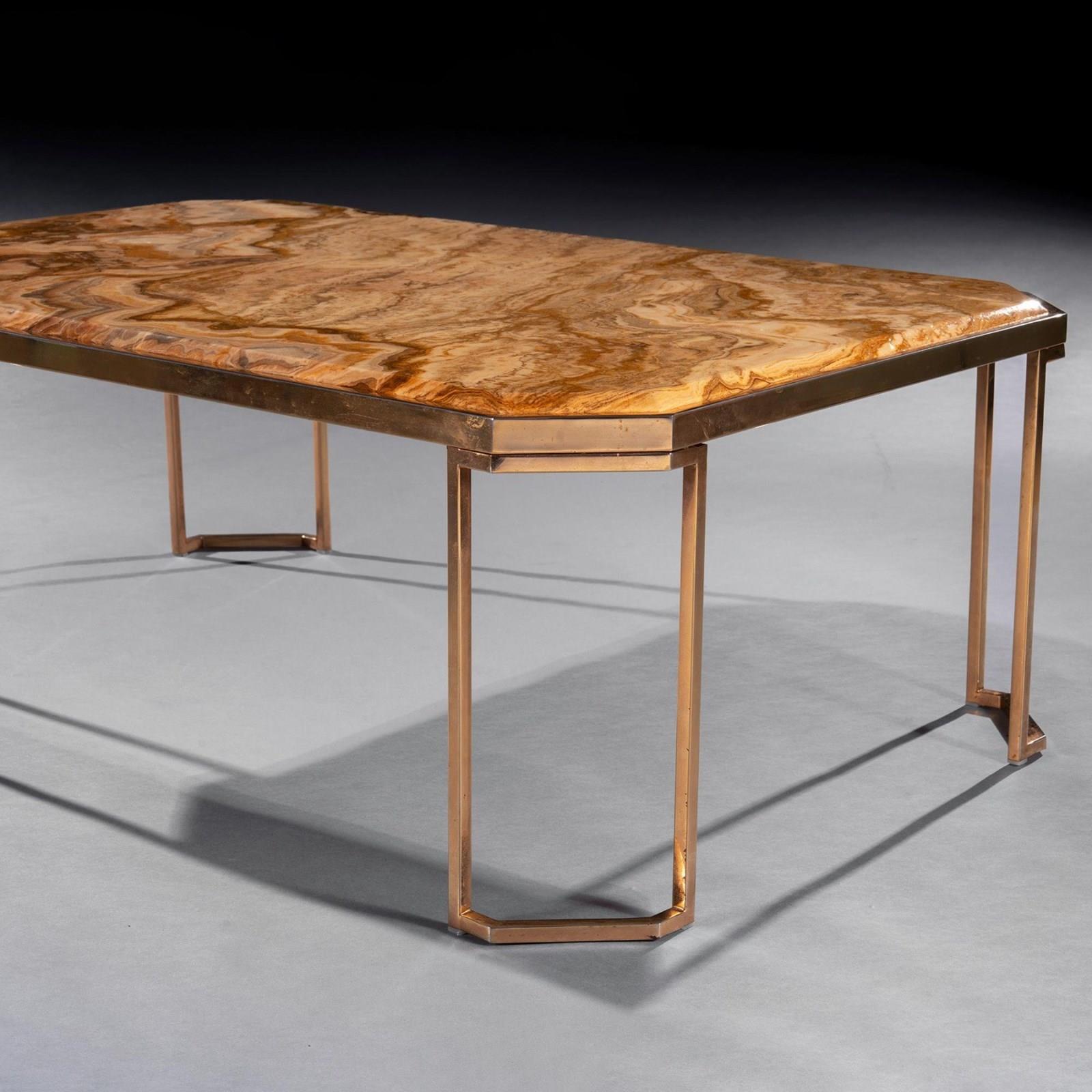 This fine table has a frame made of gilt brass. The table is of rectangular section with canted corners and supports an inset onyx marble, also known as veined agate, top. There are two conjoined legs at each corner of the table and this arrangement of legs is visually interesting as well as practical and strong.
