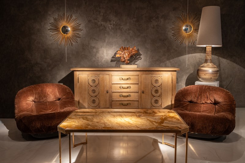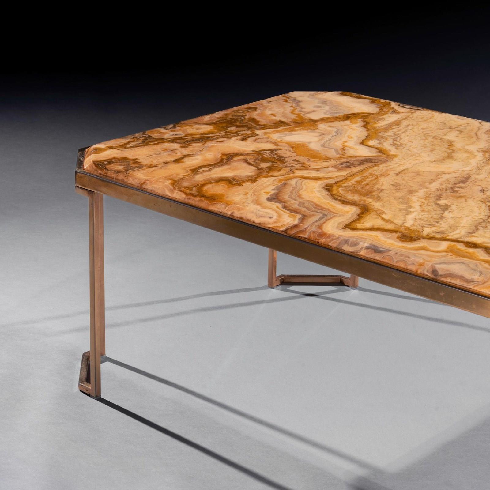 Onyx marble or veined agate is a semi-precious stone formed from calcite or aragonite and apart from its obvious beauty under natural light, it is translucent meaning that it looks remarkably beautiful when lit from below-something that the arrangement of legs on the present table makes easy to achieve.