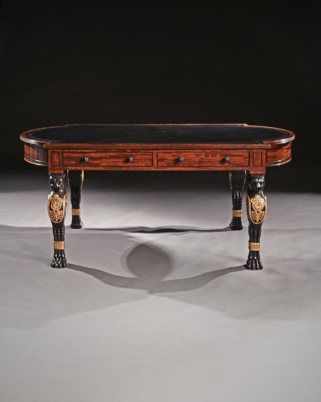 An Important Regency period mahogany, ebonised and parcel gilt partners writing table on monopodia legs of exceptional quality and design, in the manner of George Smith, stamped Chas Norman, Labelled ‘Morning Library’.