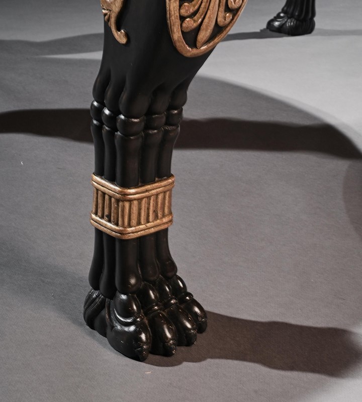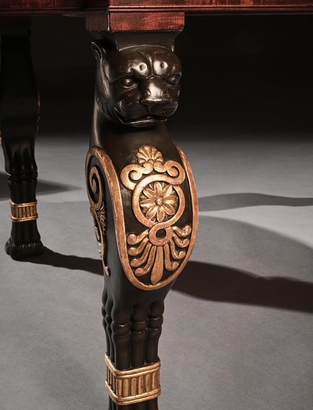 Raised on four boldly designed and imposing, crisply carved, ebonised and parcel gilt leopard monopodia supports in wonderful original waxed condition. Each of the Egyptian leopards' masks above a bold breast decorated with carved gilt anthemion and guilloche motifs, finishing on a finely detailed carved leg and paw foot.