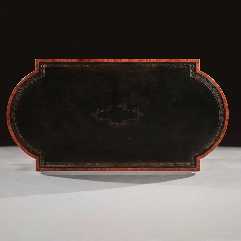 Of sophisticated shape, the crescent shaped ended rectangular top is beautifully lined with the original gilt tooled leather writing surface, enclosed by a mahogany cross-banded border and reeded edge.