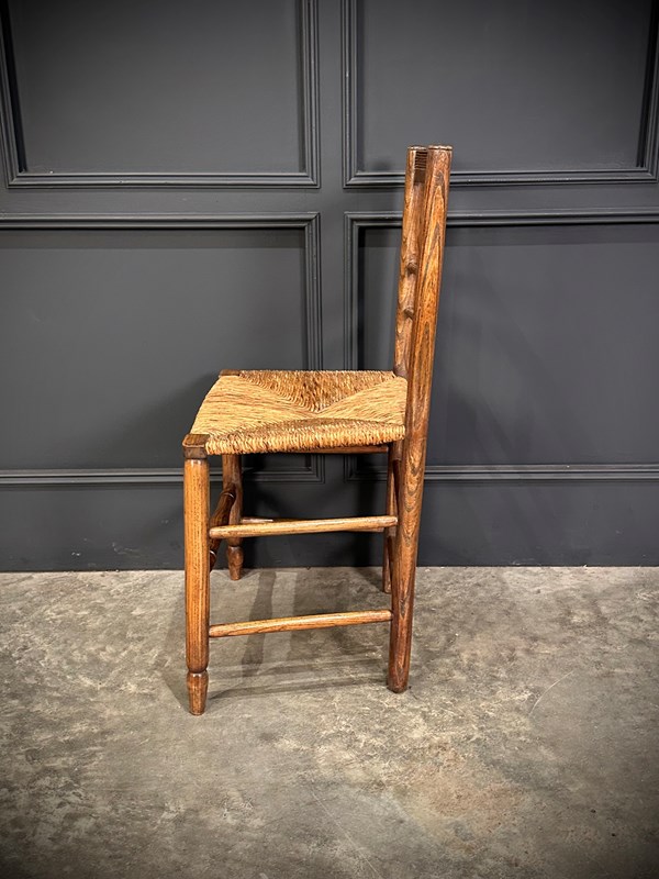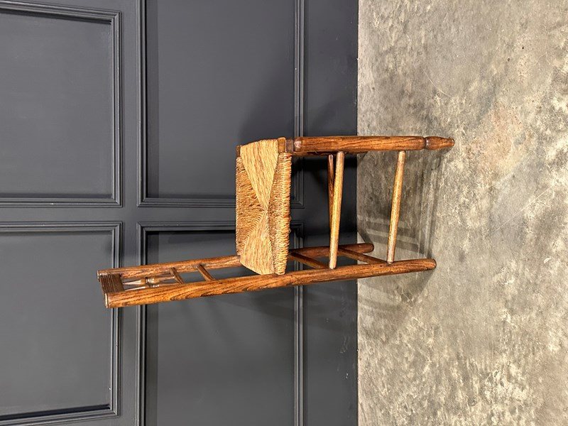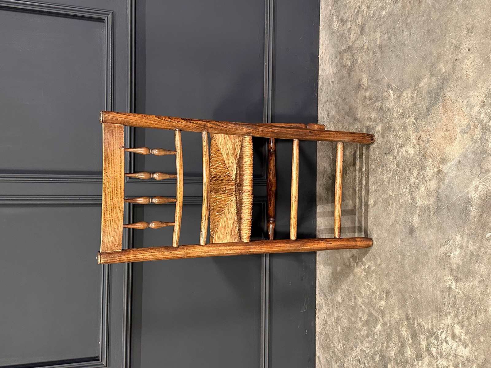 The rush seat is well-woven and in good condition, complementing the warm tones and natural grain of the elm frame.