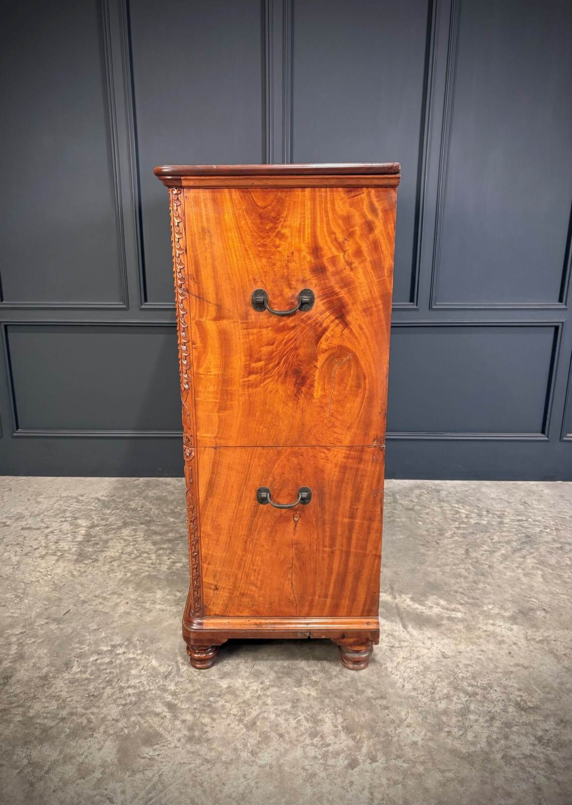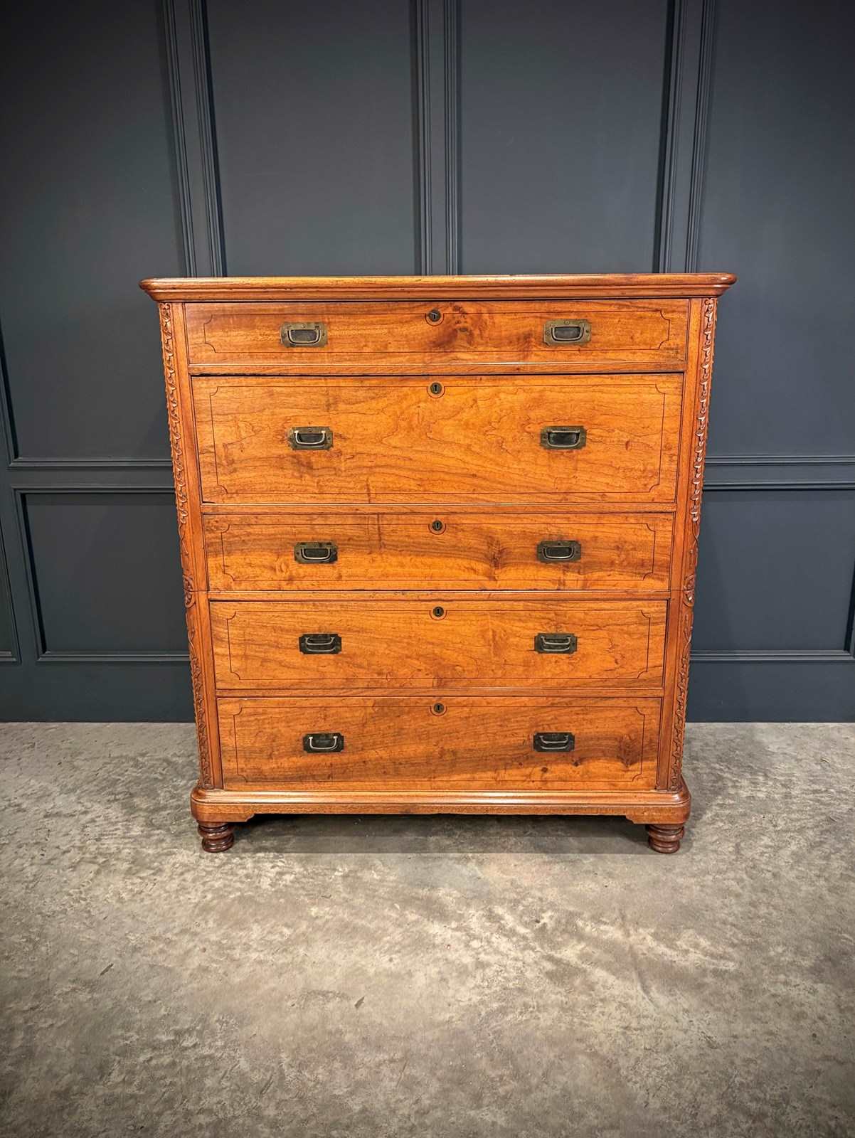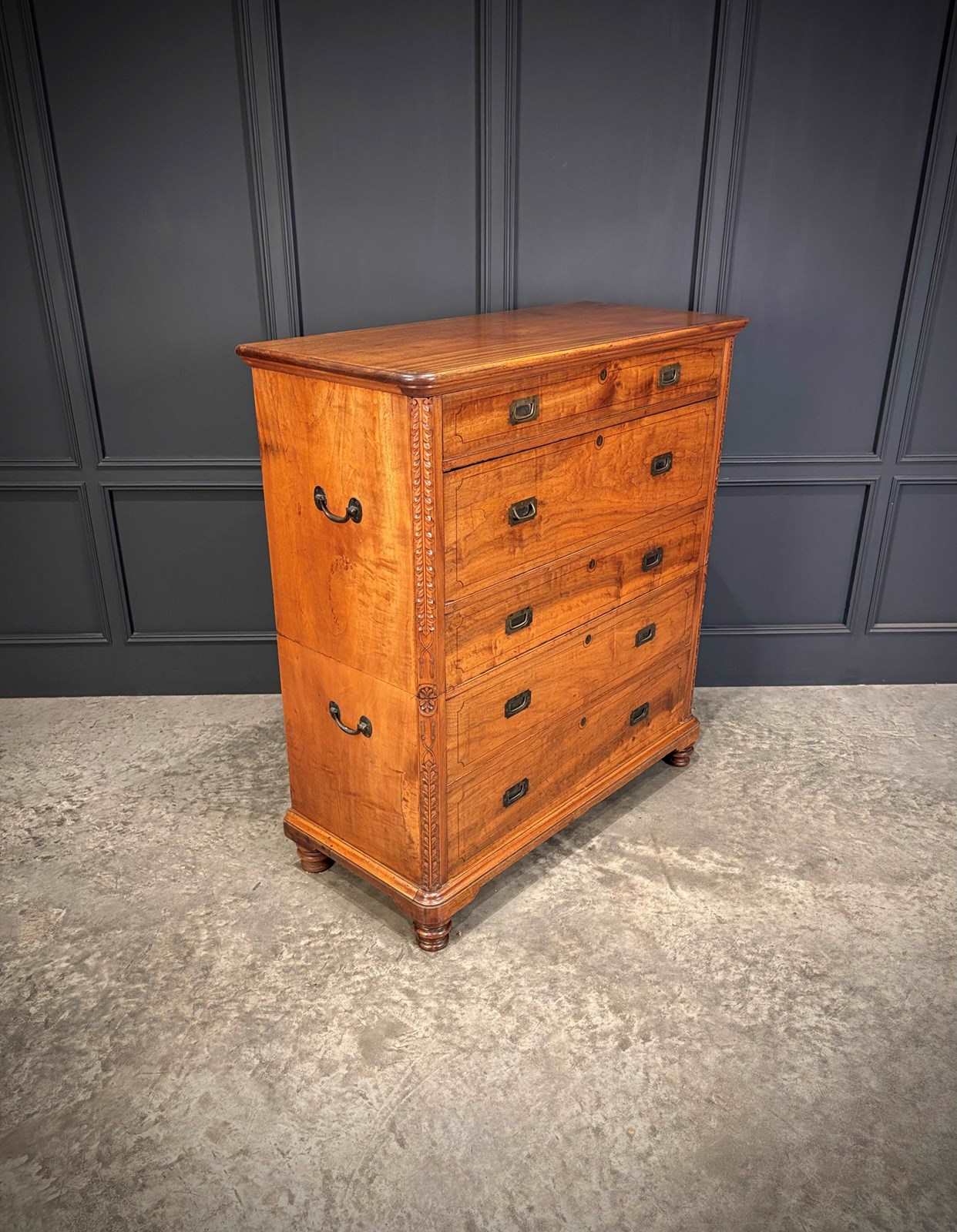 Constructed in two parts for ease of transport, this handsome piece features beautifully figured timber with inlaid drawer fronts, carved corner details, and raised on turned feet.