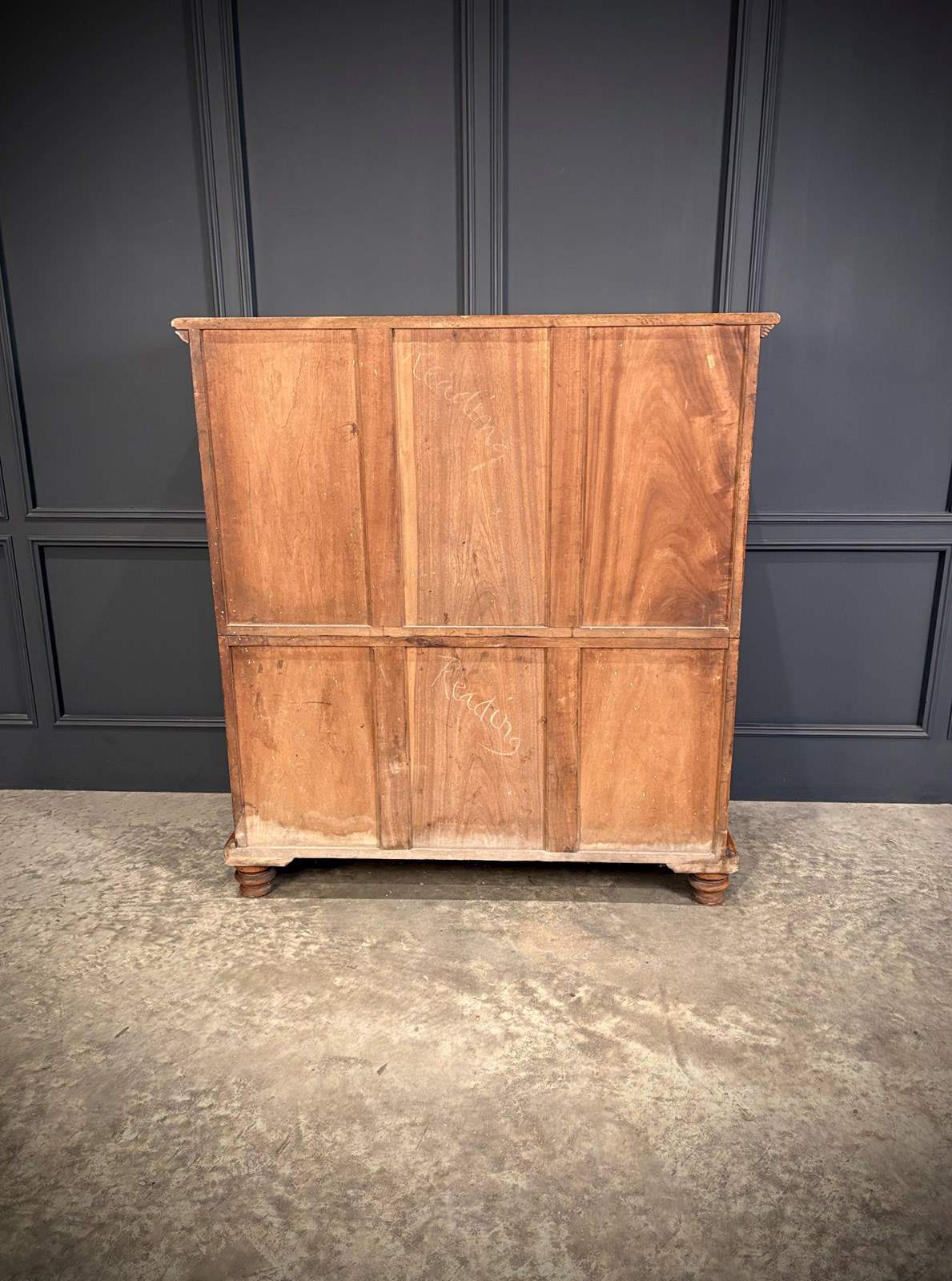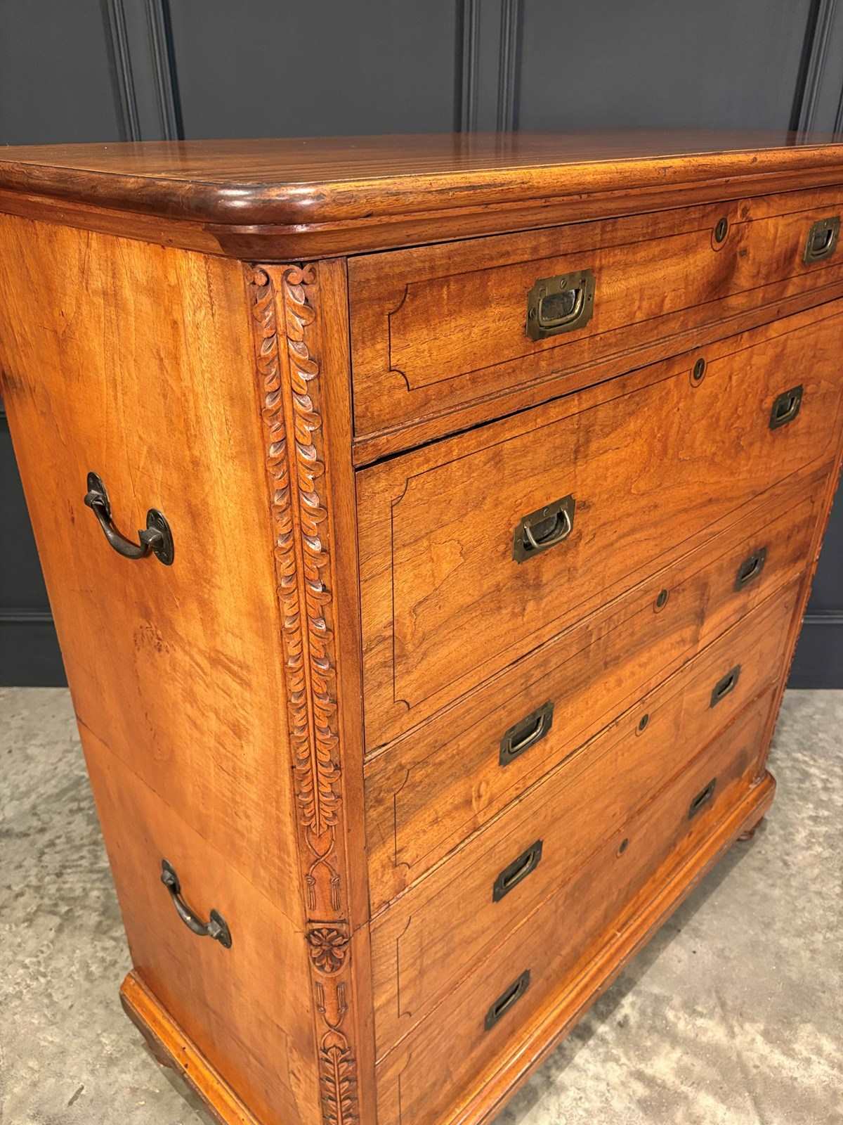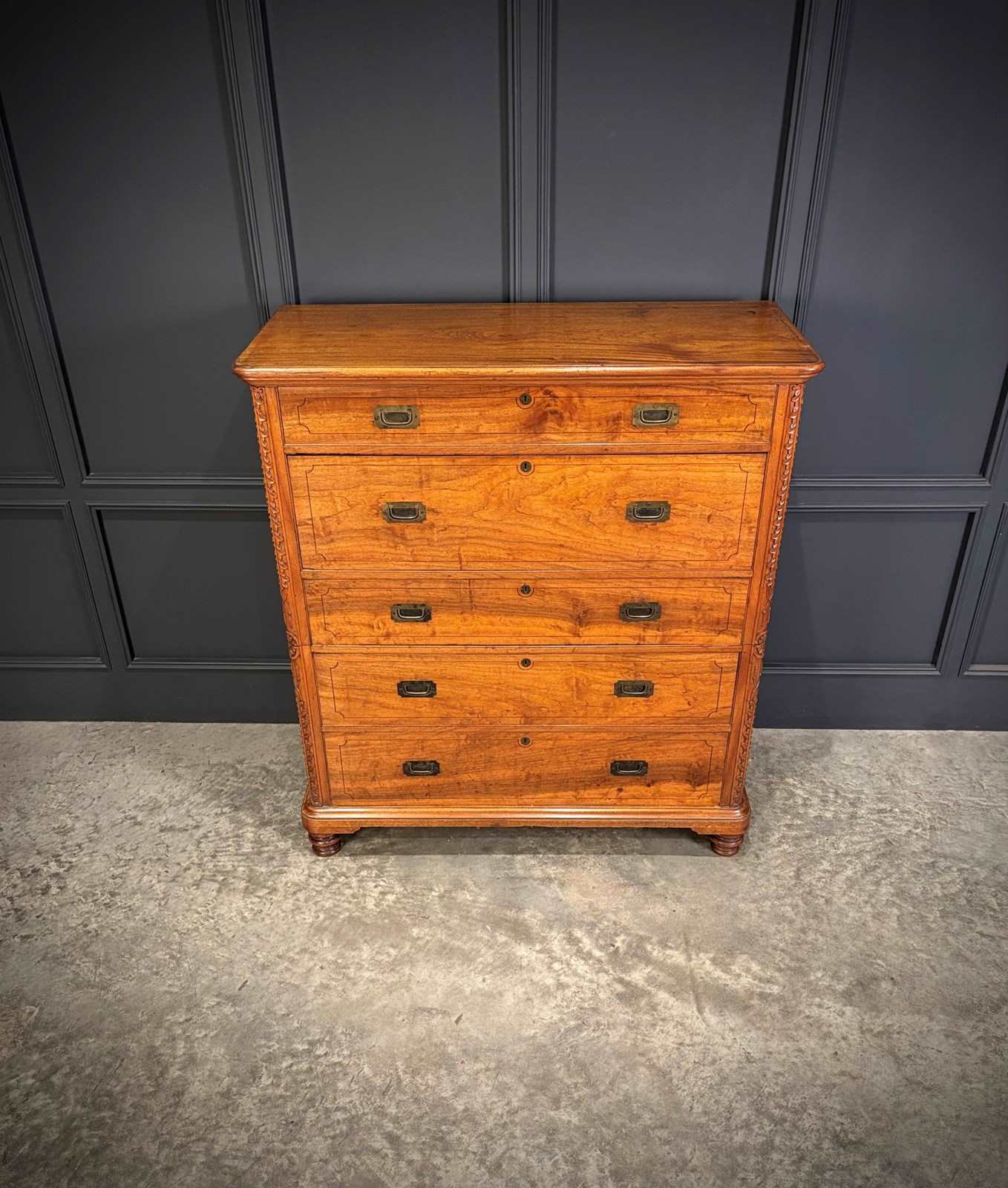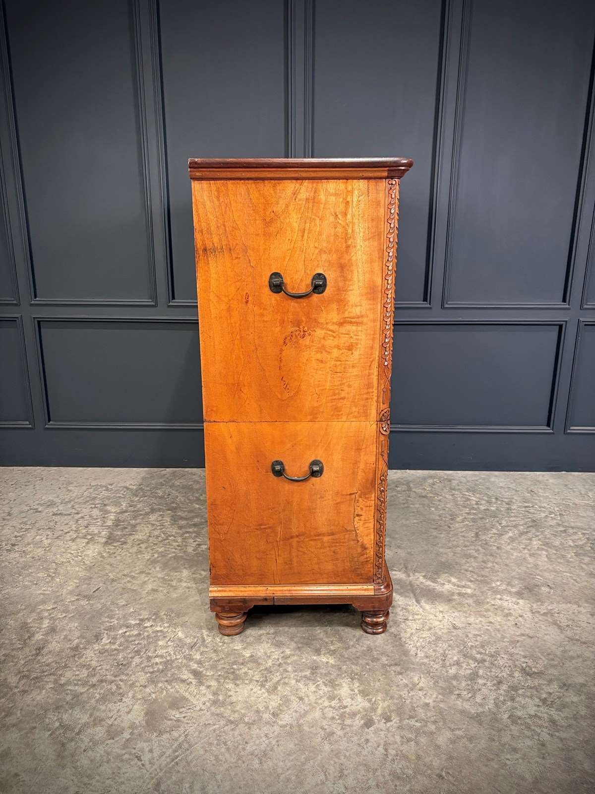 Constructed in two parts for ease of transport, this handsome piece features beautifully figured timber with inlaid drawer fronts, carved corner details, and raised on turned feet.