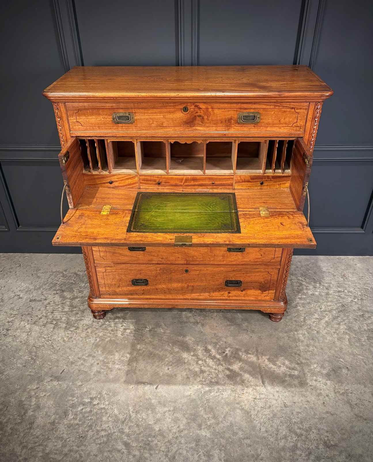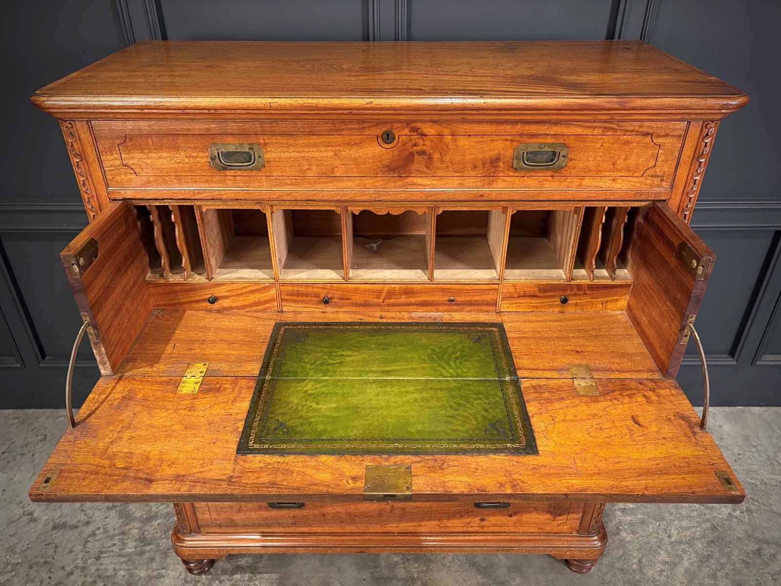 The upper section opens to reveal a fitted secrétaire interior, complete with an arrangement of pigeonholes and small drawers, centered around a new hand-dyed green leather writing surface.