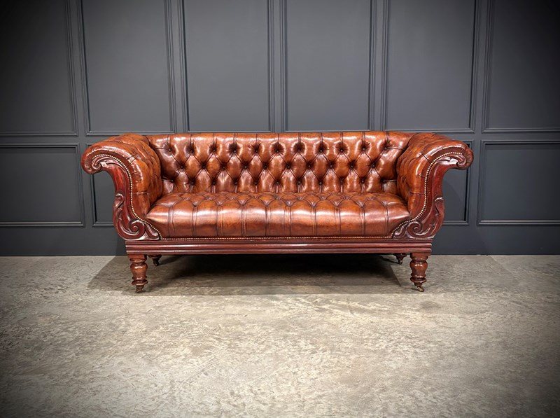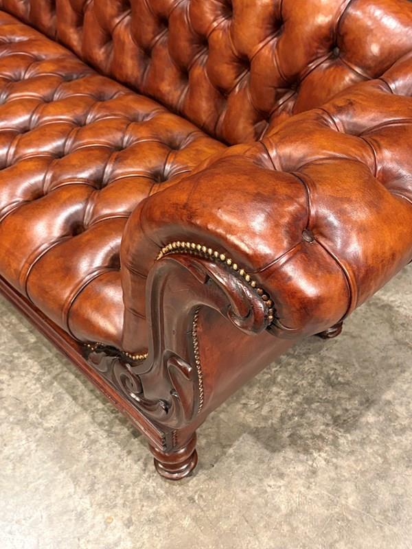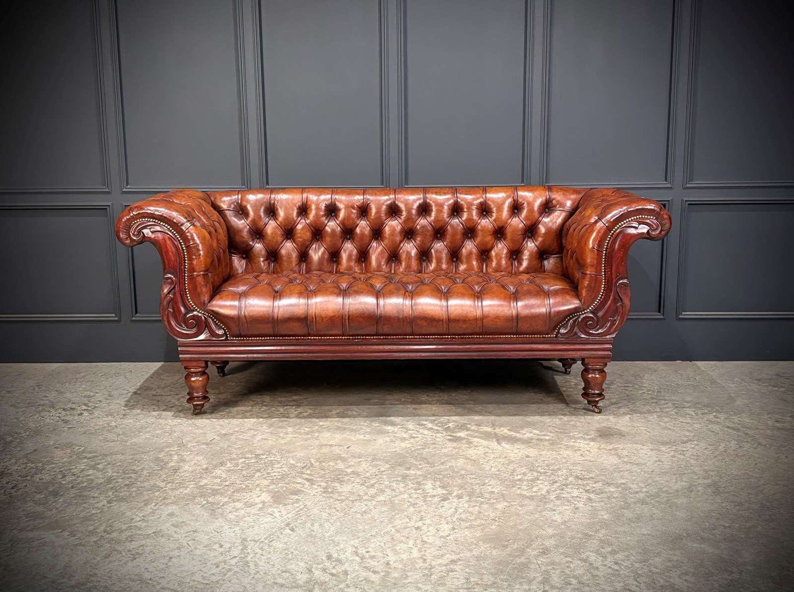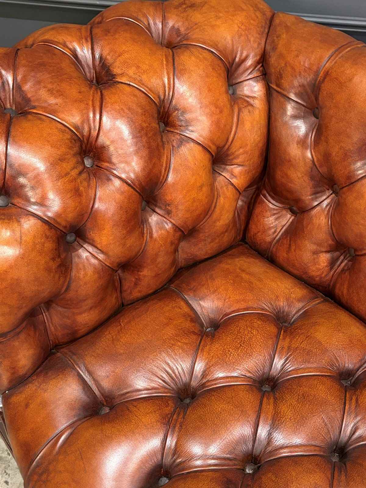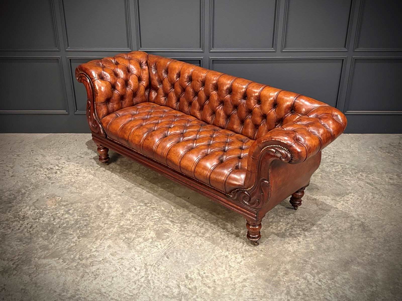 The sofa has been reupholstered in high-quality deep buttoned leather, traditionally hand-dyed to a rich, whisky brown that complements the period frame perfectly. Finished with individual brass studding for a crisp, tailored look.