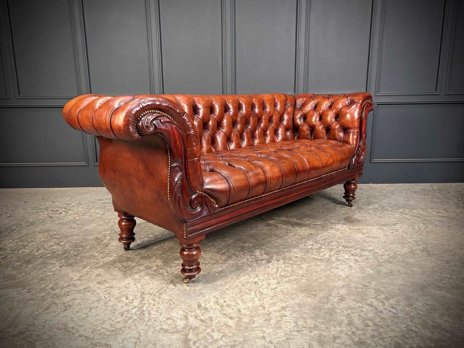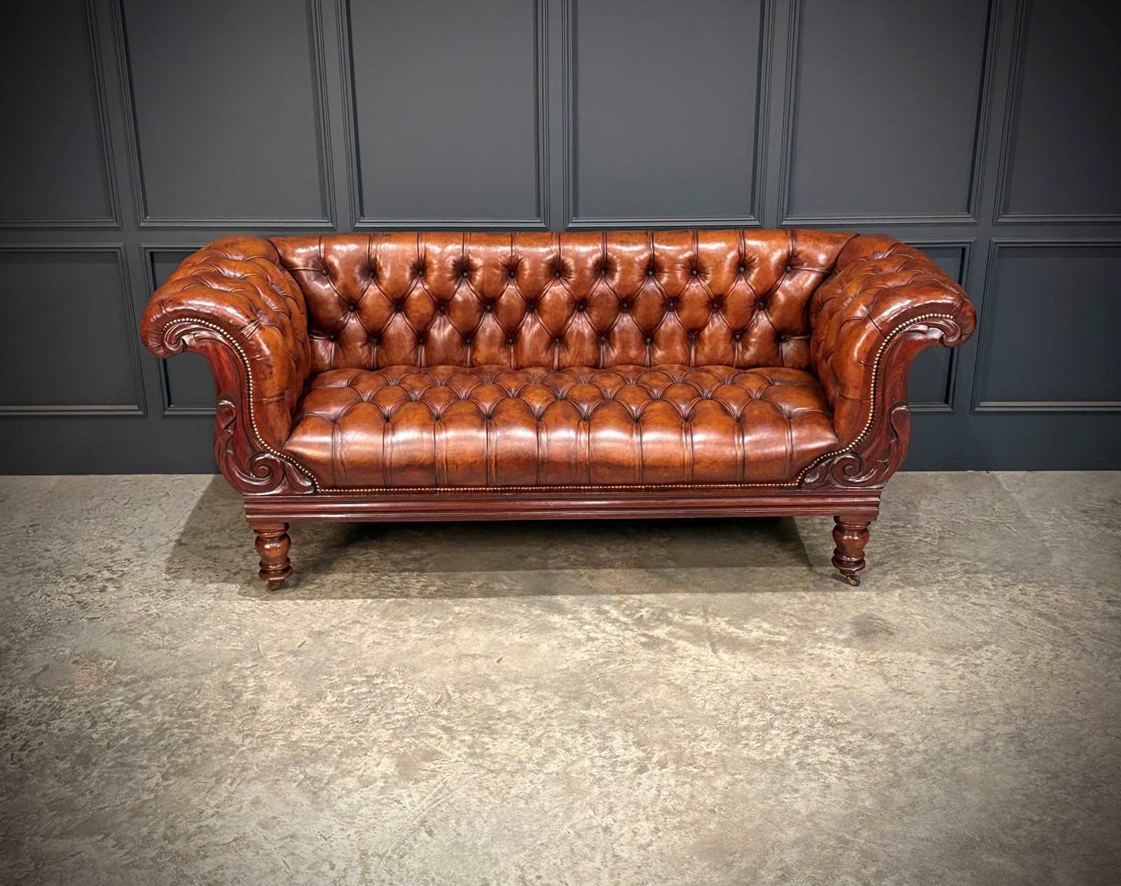 This elegant 3-seater features a solid mahogany show frame with beautifully carved scroll arms and turned legs on casters.