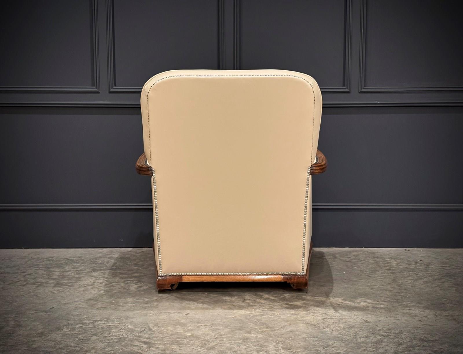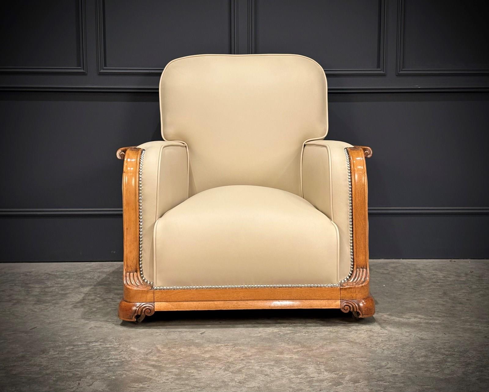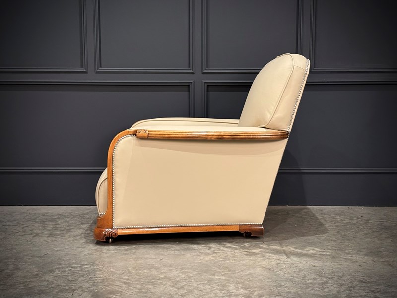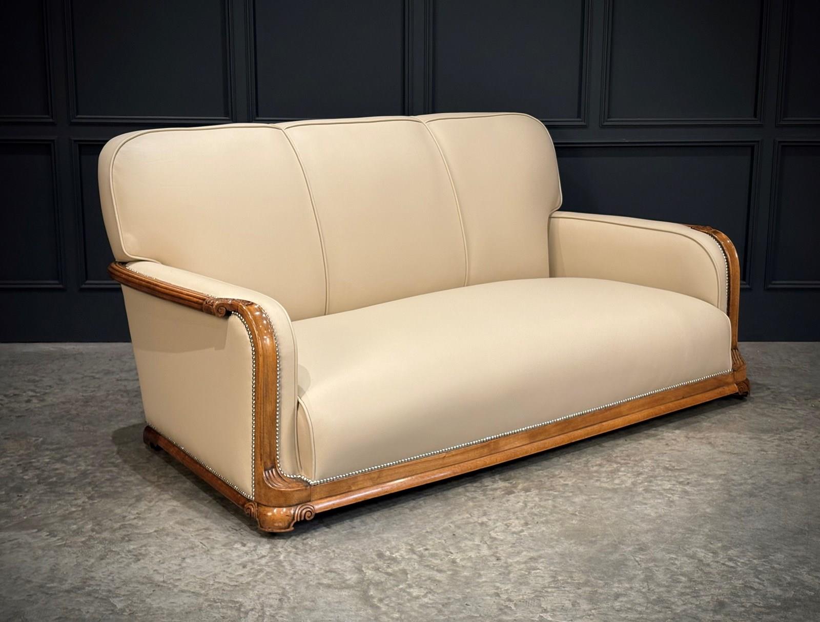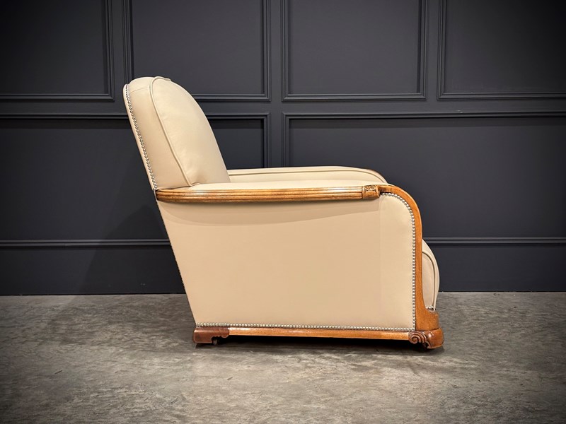 This exceptional Art Deco 3-piece suite, dating from the 1930s, combines timeless style with comfort. The beautifully crafted walnut frames feature intricate carved detailing, while the suite’s elegant design is further enhanced by the newly upholstered, thick quality cream leather with a striking chrome studded trim.