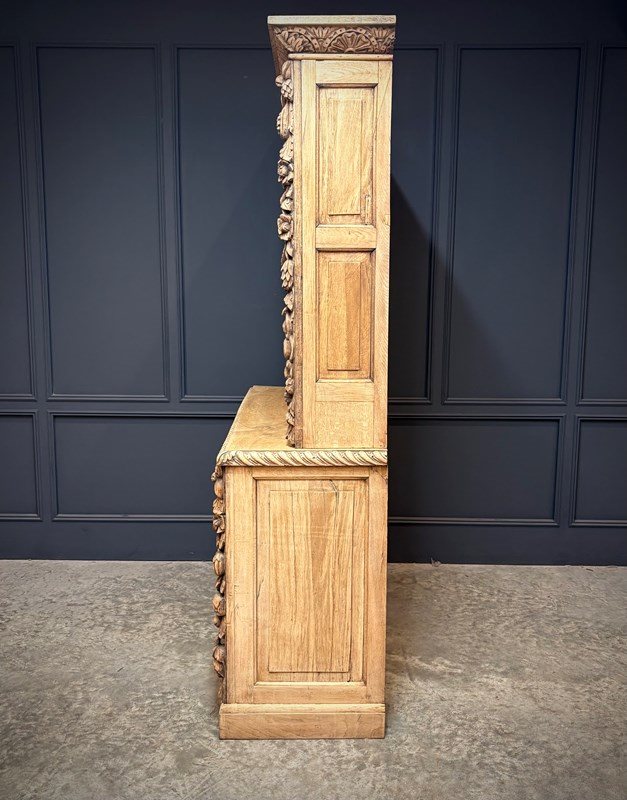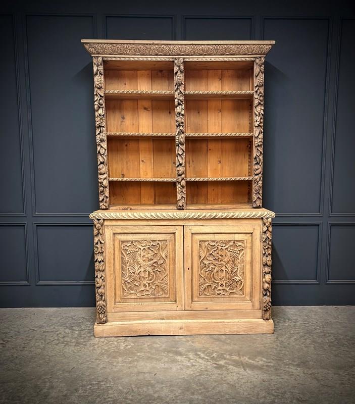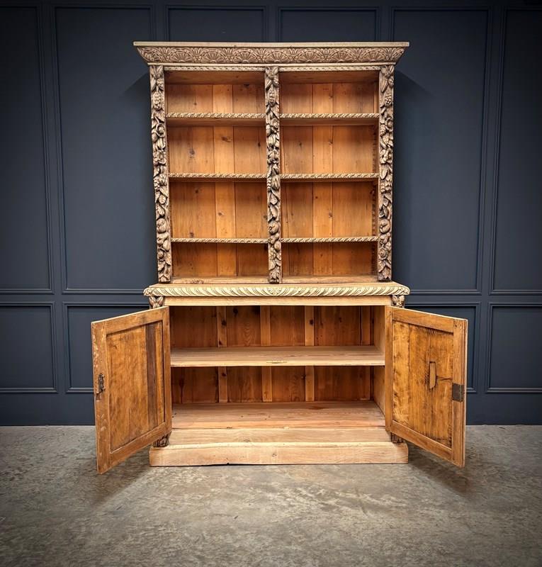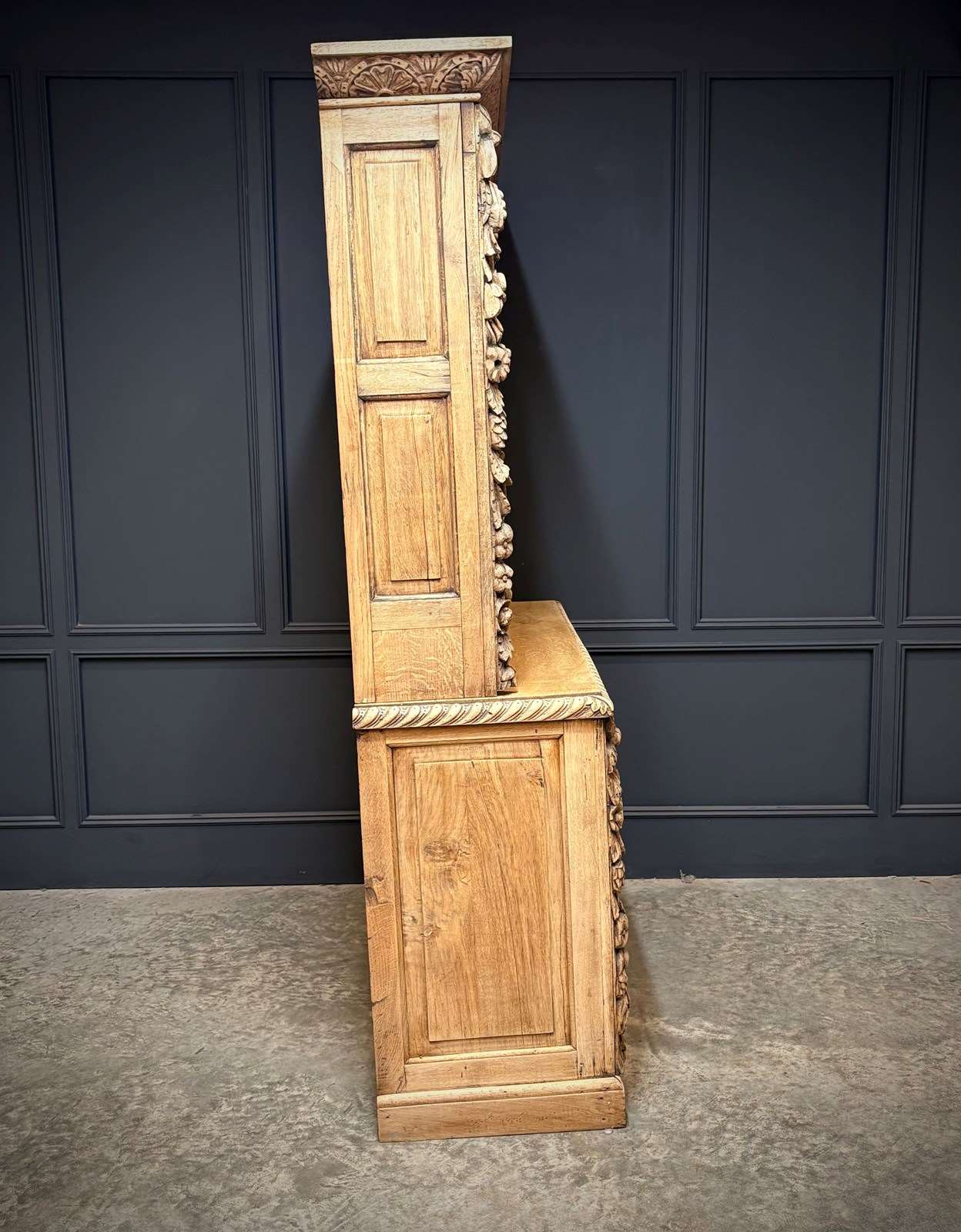 The wood has been sympathetically bleached, giving the piece a lighter, more contemporary feel while still honoring the depth and character of the oak grain and its historical origins. This combination of functional design and intricate ornamentation makes the bookcase both a practical storage solution and a stunning decorative centerpiece.