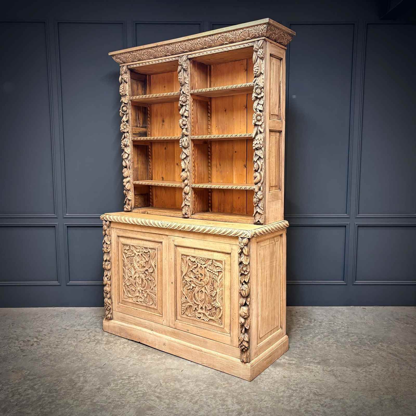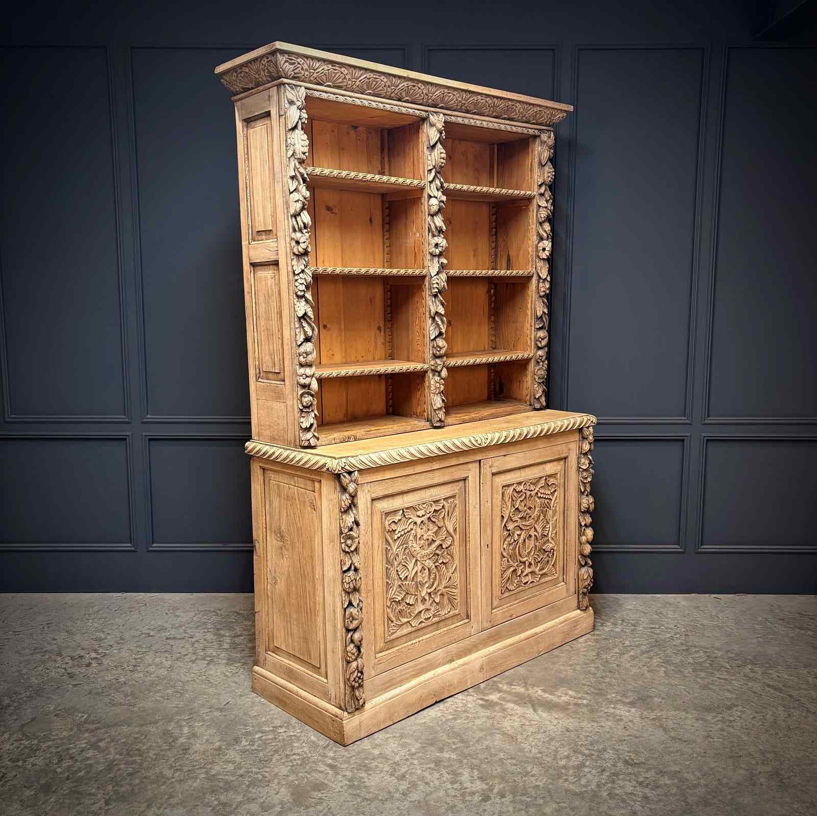 An impressive and detailed bleached oak open bookcase, dating to circa 1880, crafted in two sections for ease of transport and display.