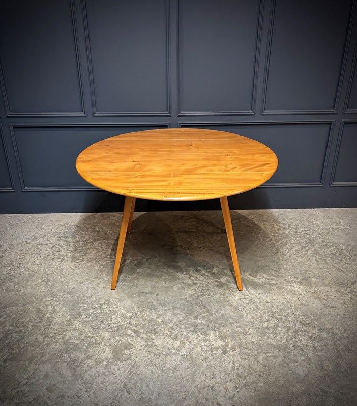 A beautifully restored vintage Ercol drop-leaf dining table, showcasing classic mid-century British design and craftsmanship.