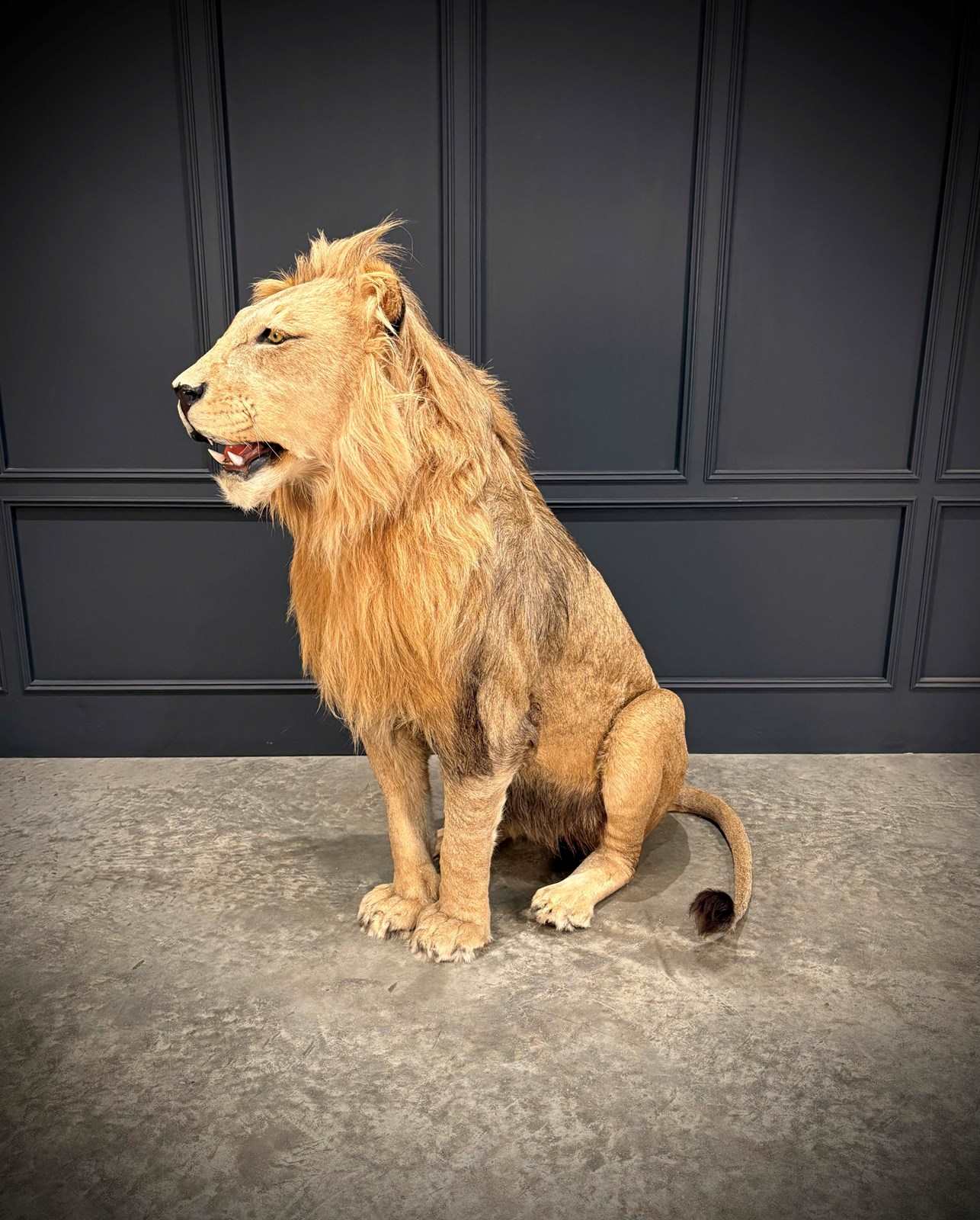This impressive piece features a full mount in a seated pose, showcasing a well-preserved mane, naturalistic facial expression, and strong anatomical detail.
