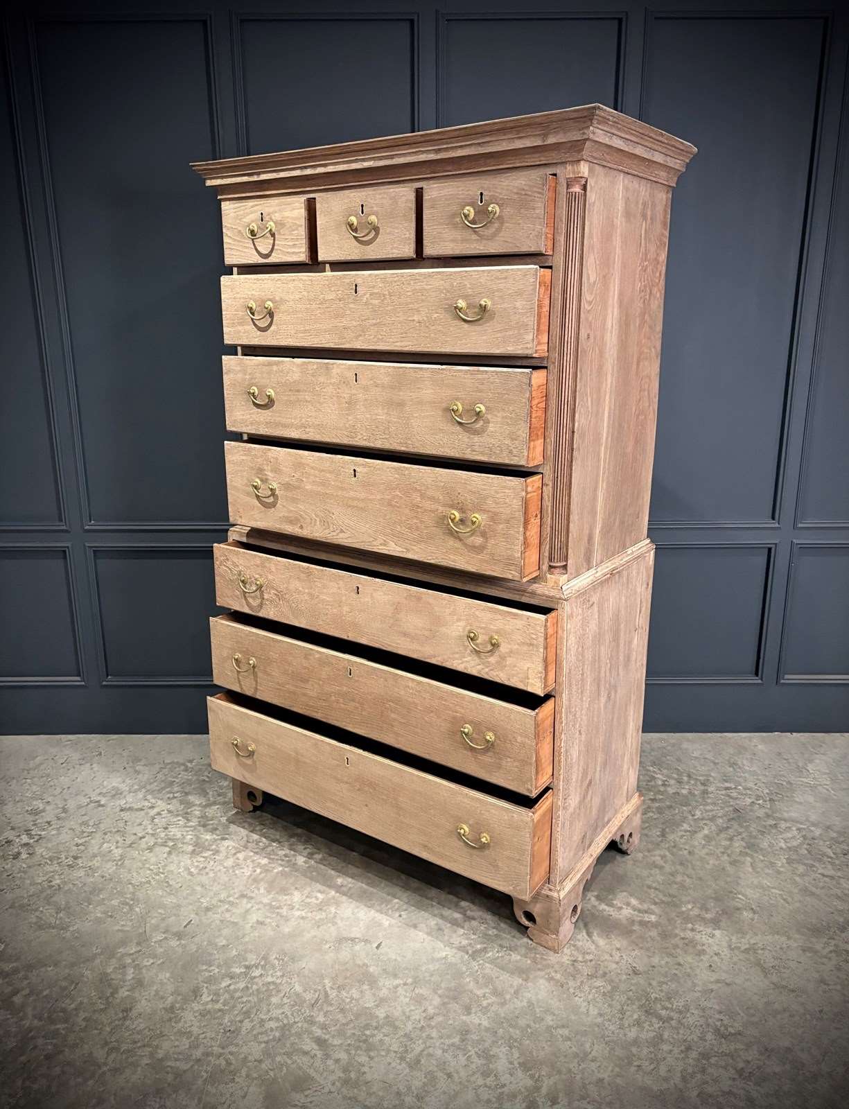 A handsome bleached oak chest on chest of classic Georgian form.