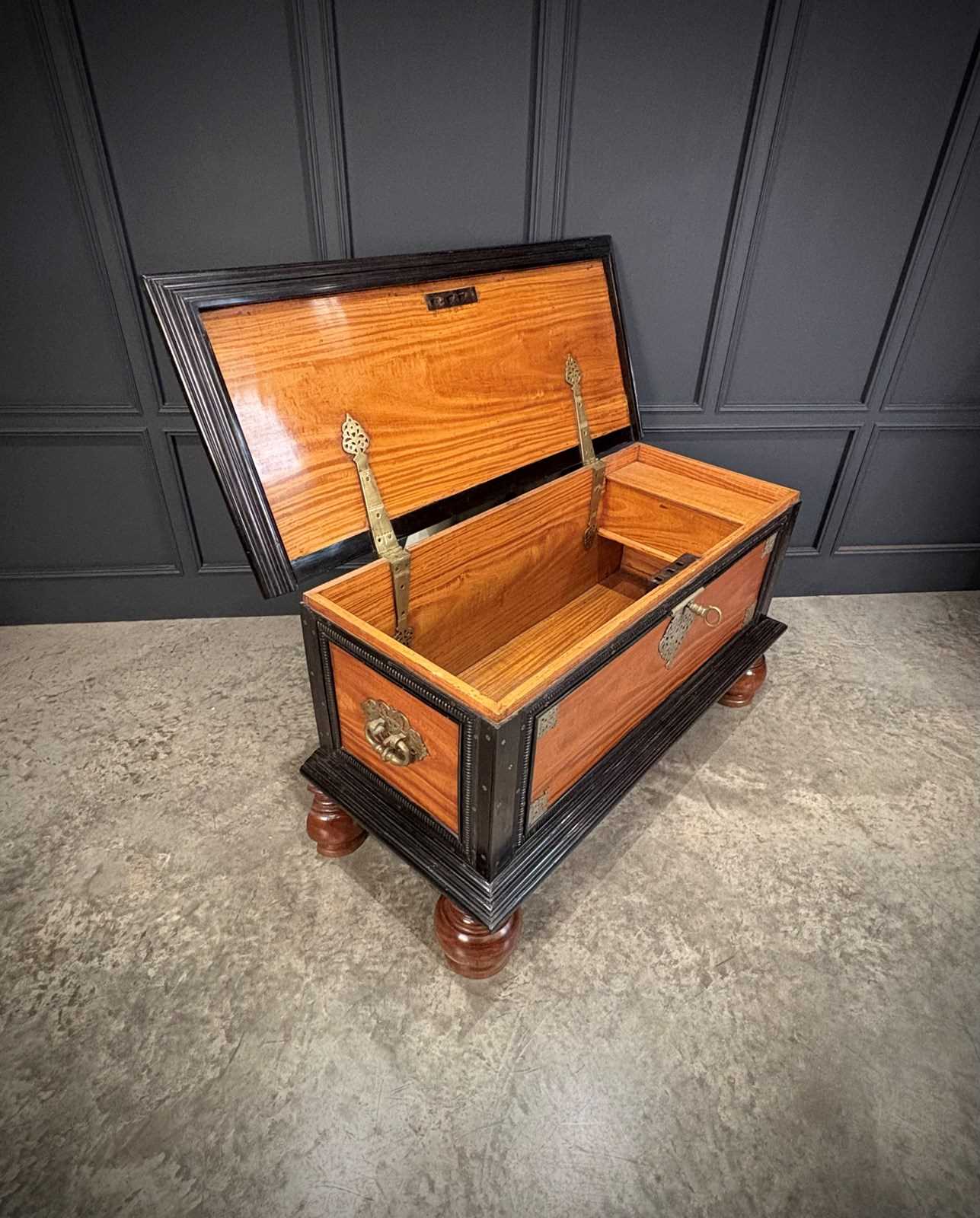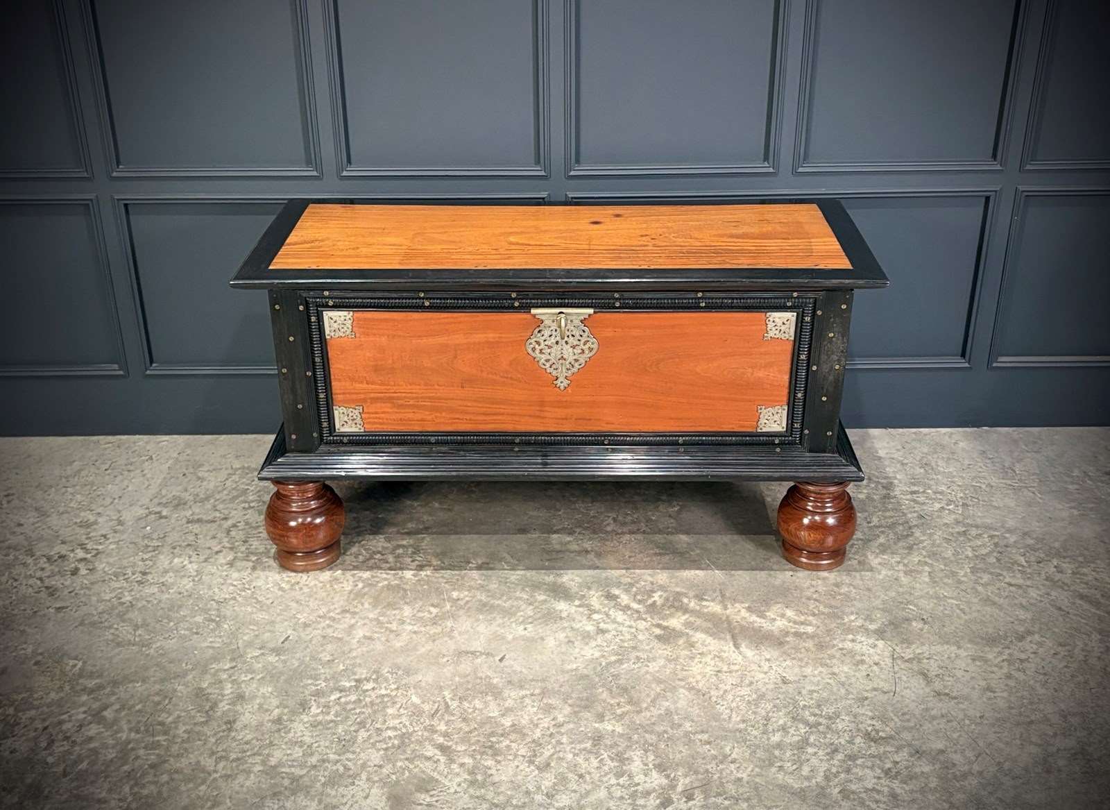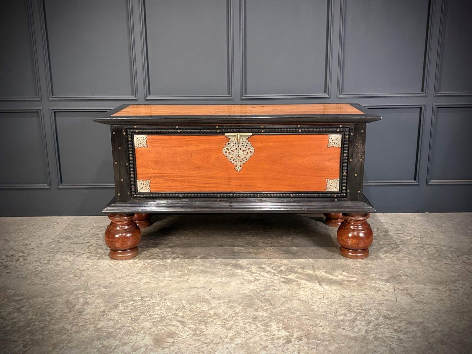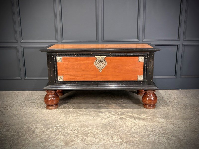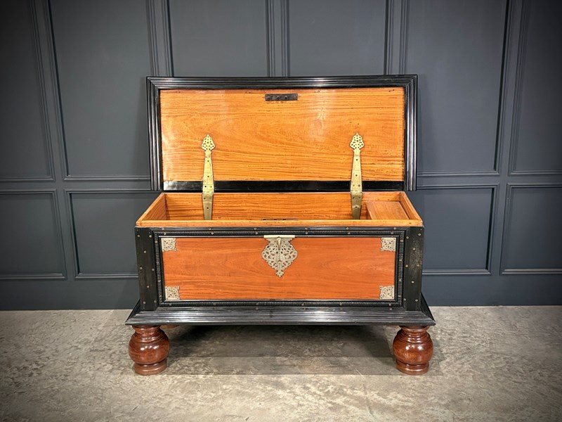 Impressive 19th century Ceylonese camphor wood and ebony trunk, circa 1850, of substantial size and weight.