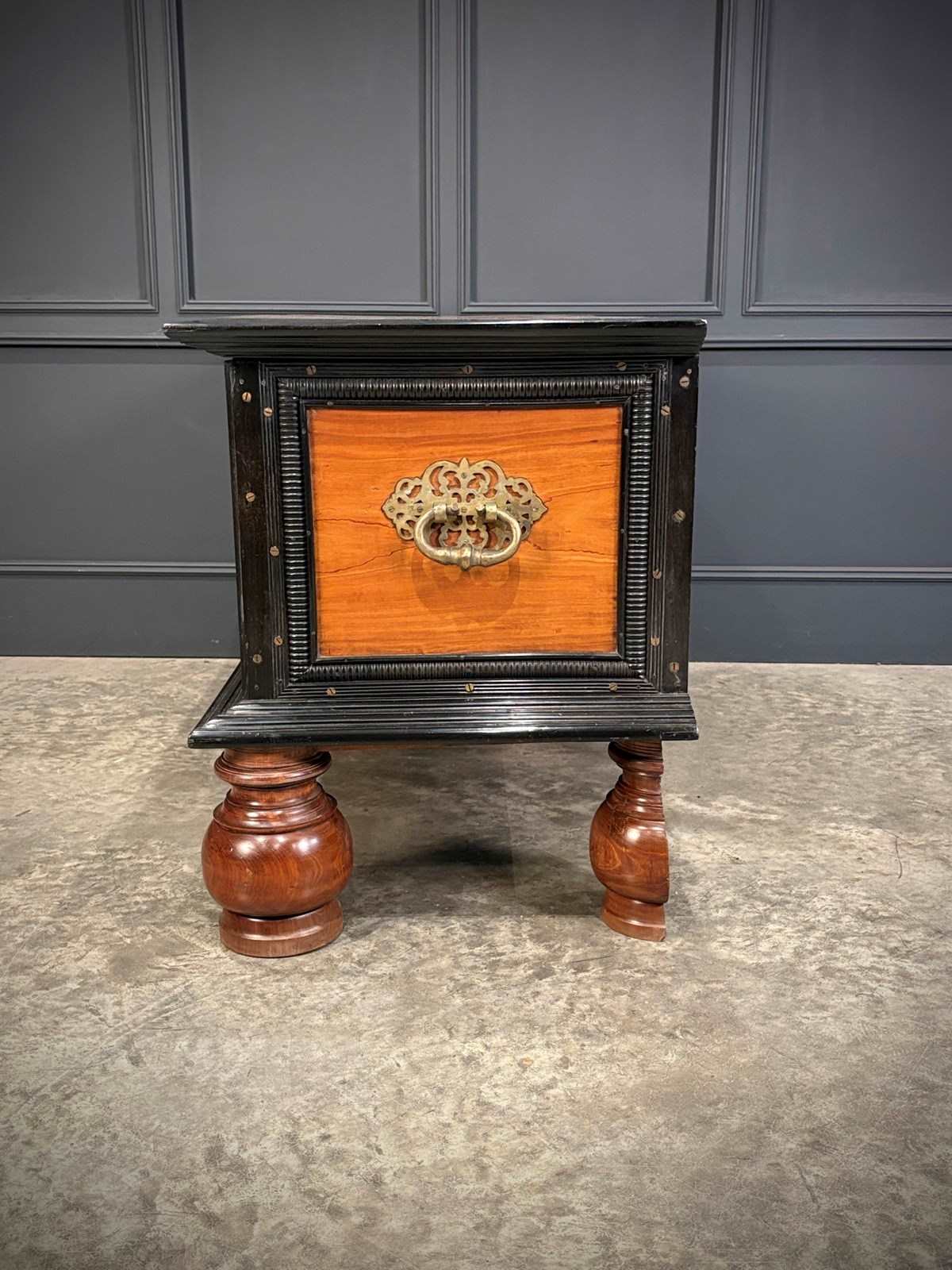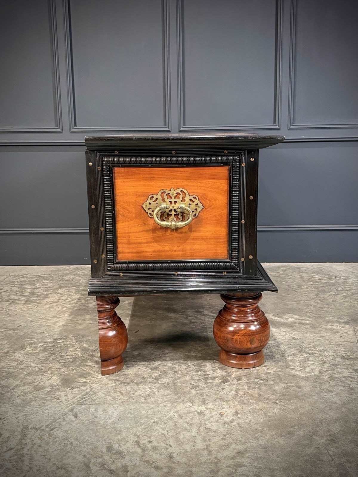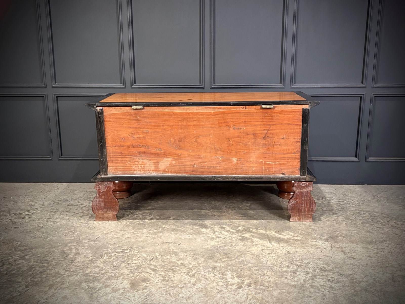 Impressive 19th century Ceylonese camphor wood and ebony trunk, circa 1850, of substantial size and weight.