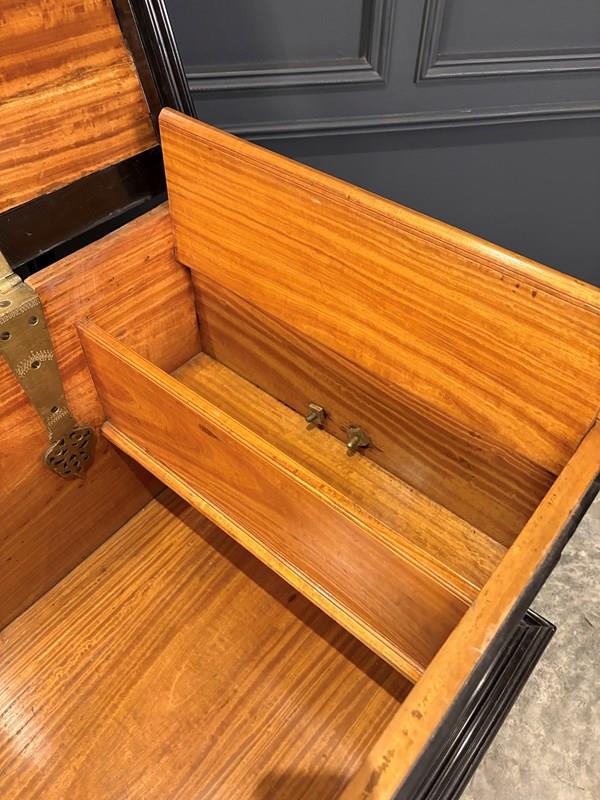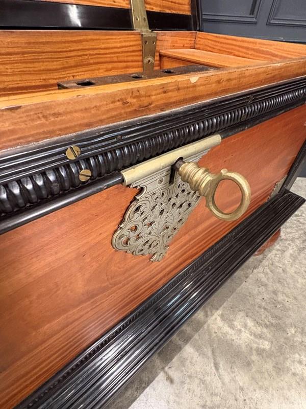 Beautifully constructed in camphor wood with contrasting ebony banding and moulded edging, the trunk is further enhanced with decorative metal mounts and carrying handles to the sides.