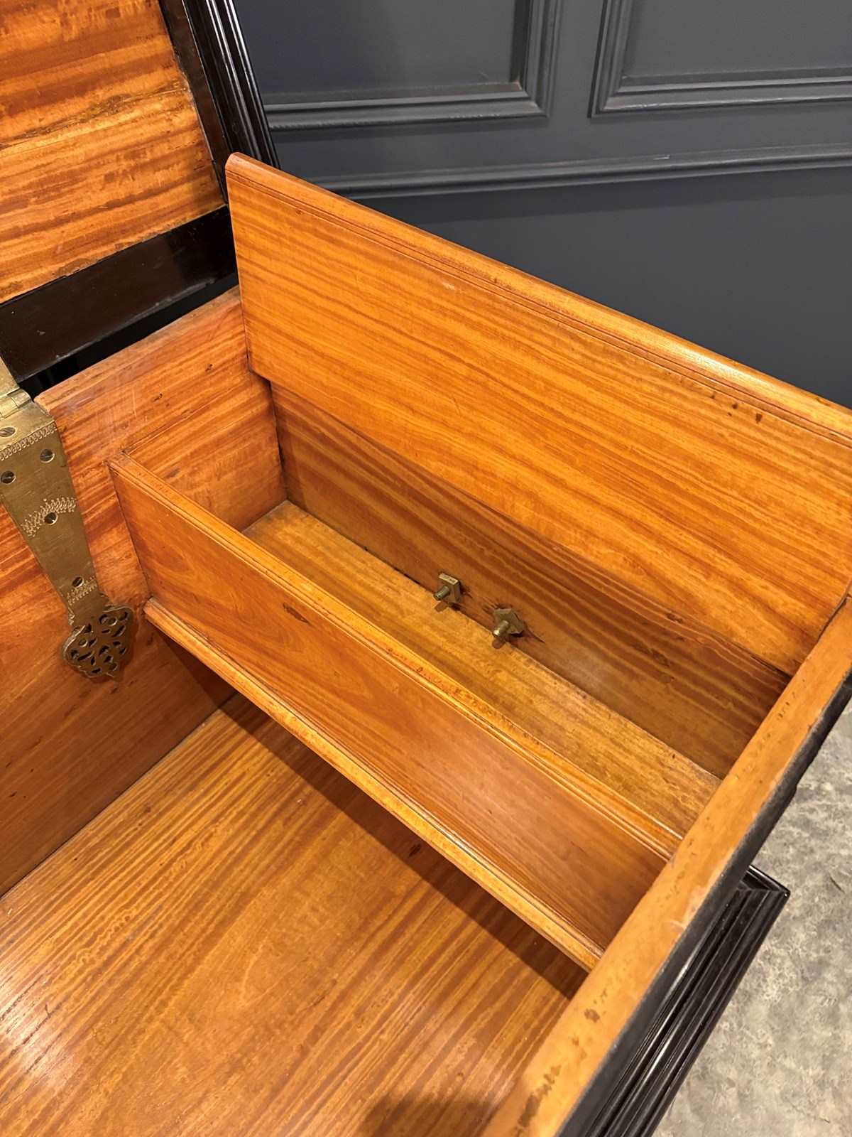 The hinged lid opens to reveal a fully polished interior, complete with candle box compartment.