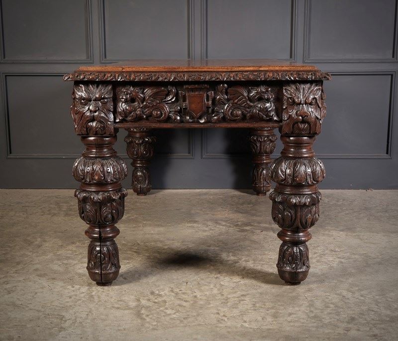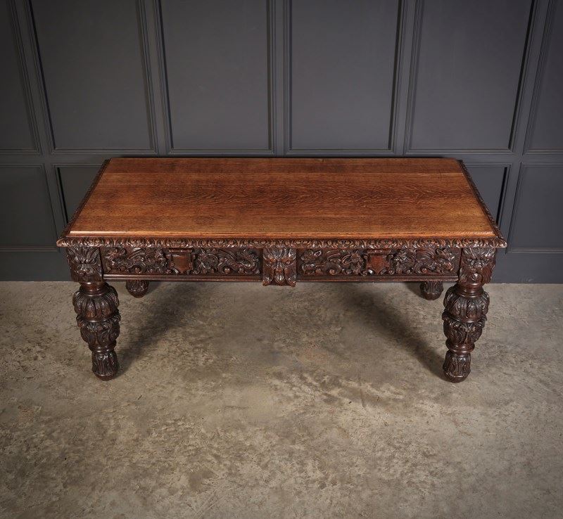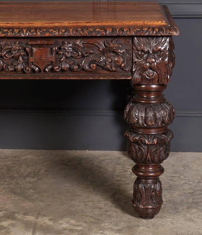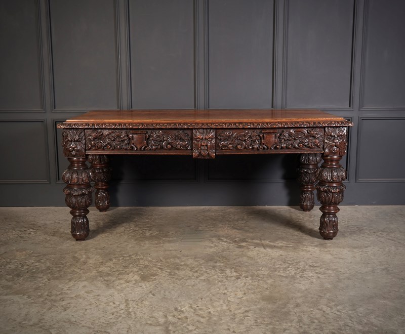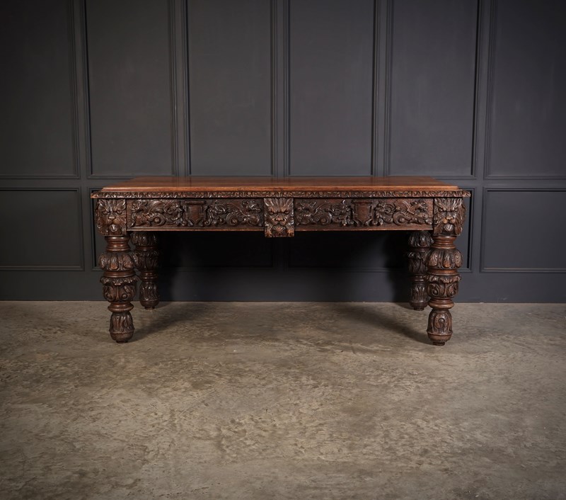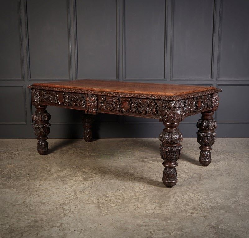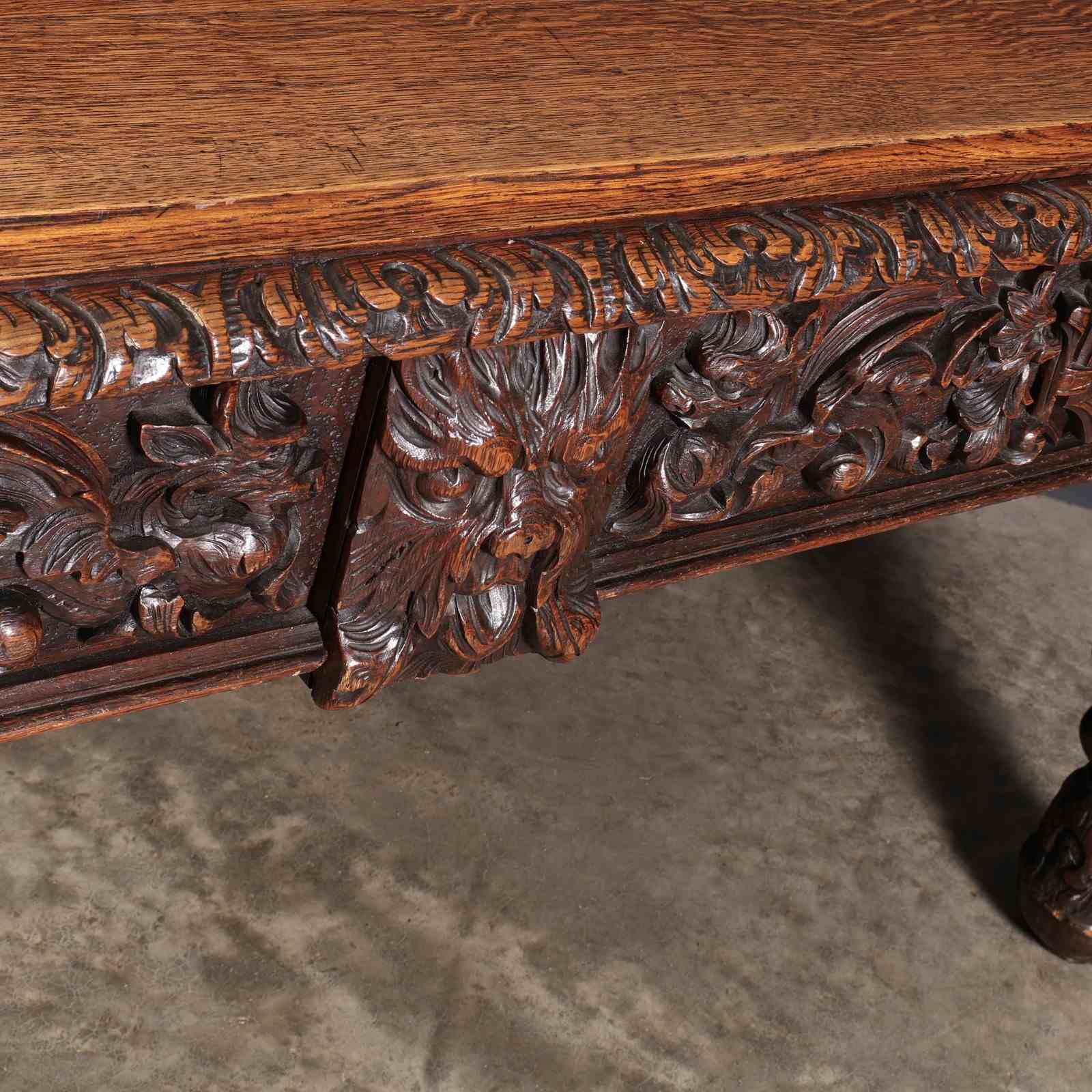 An exceptional large carved oak writing table of superb presence and quality. The table is fitted with two drawers to the front, each framed with finely executed carving, including striking depictions of the Green Man amongst scrolling foliage and animal motifs.