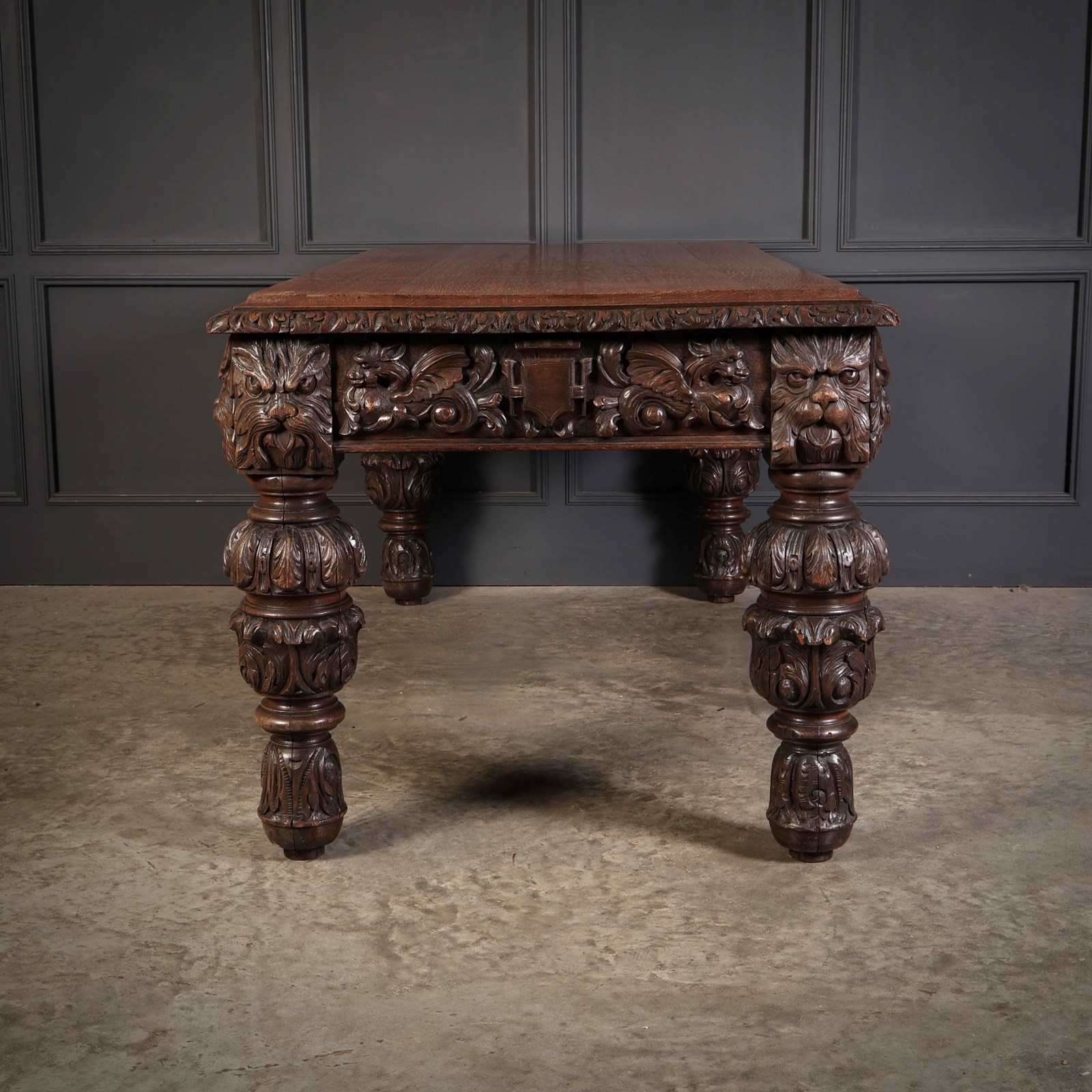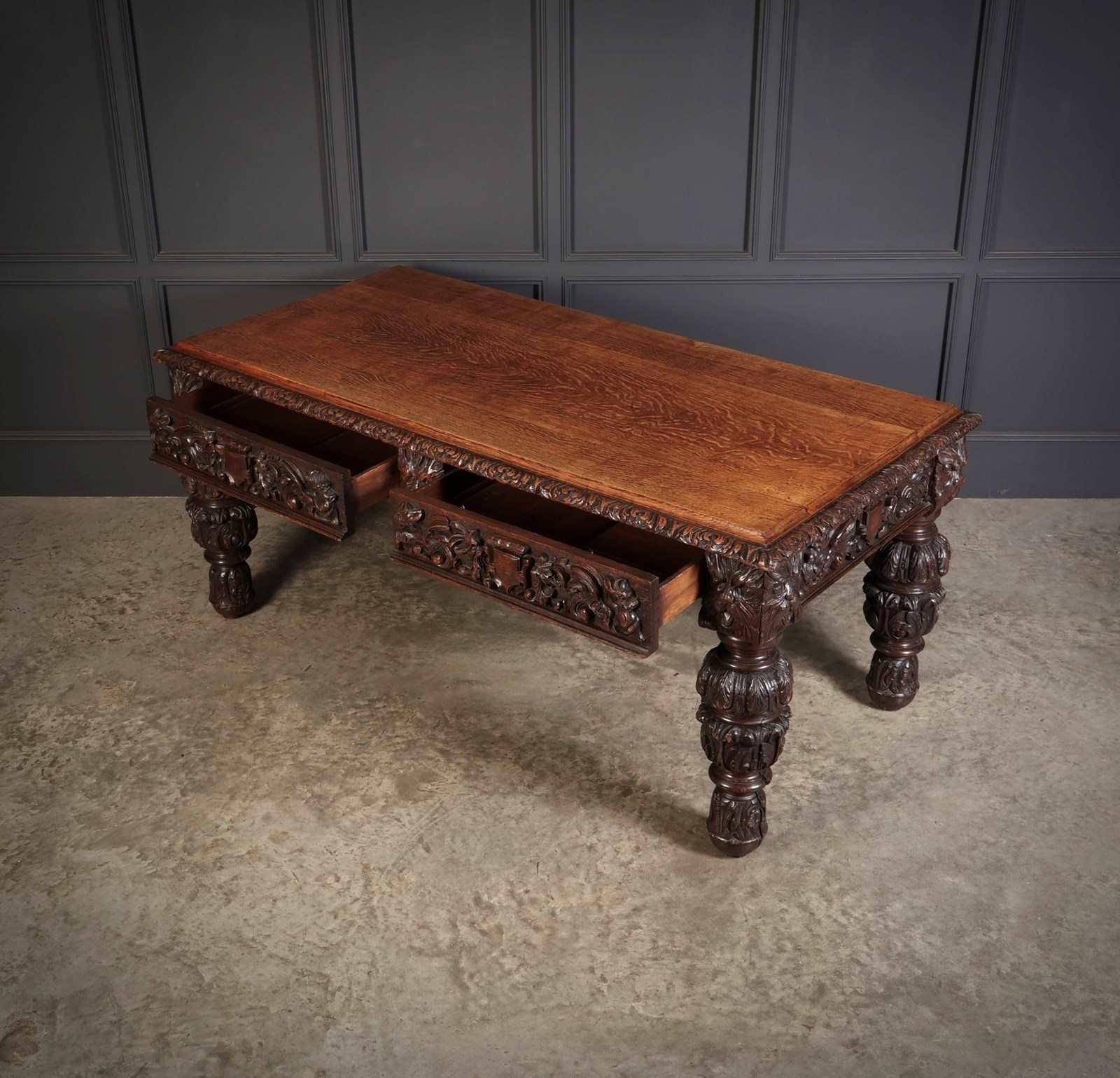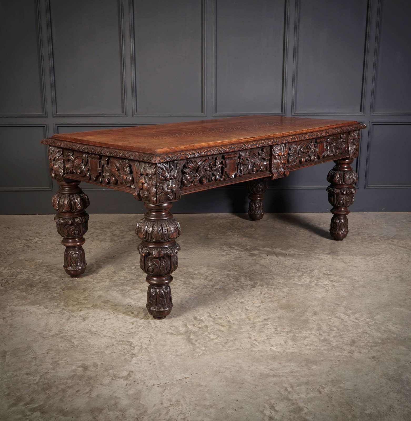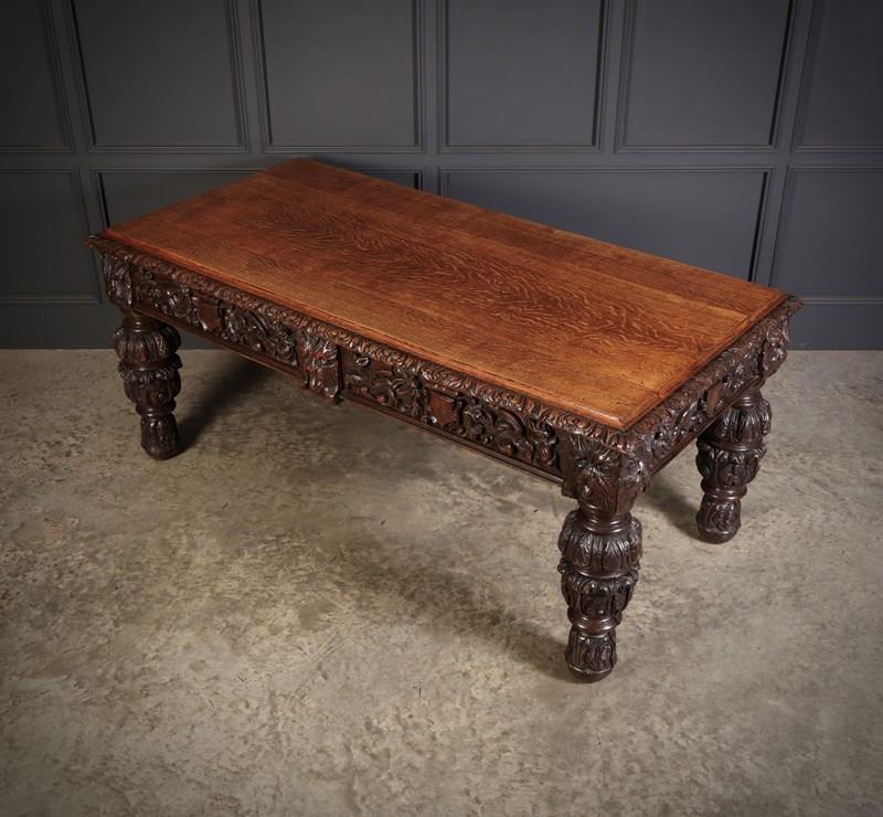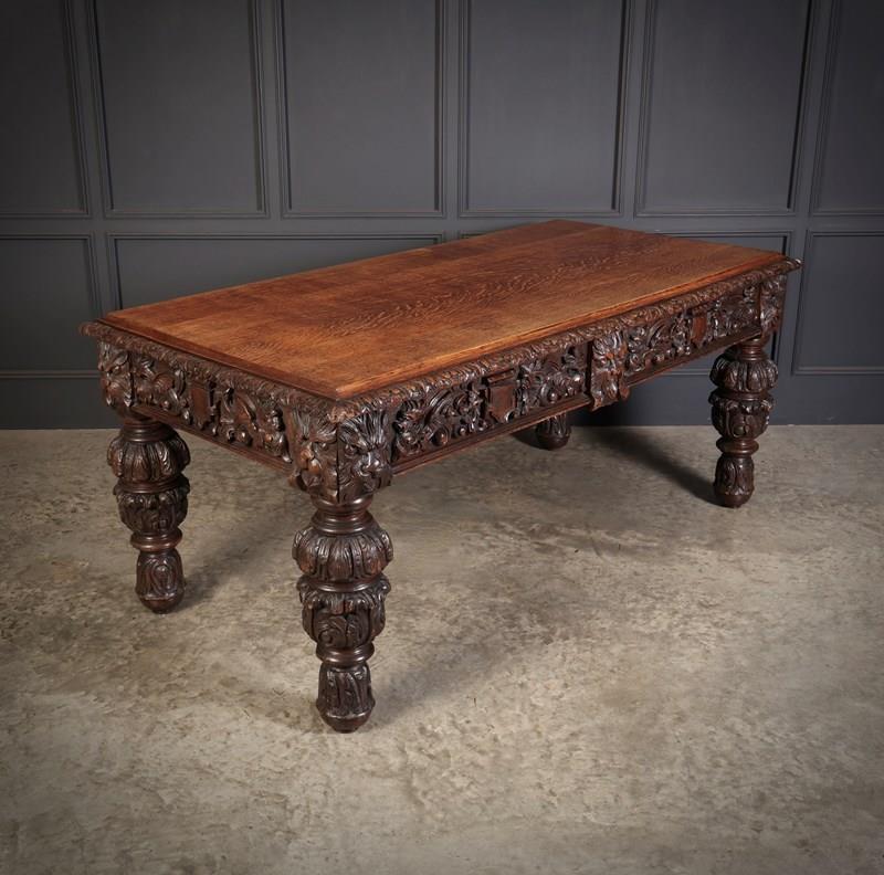 An exceptional large carved oak writing table of superb presence and quality. The table is fitted with two drawers to the front, each framed with finely executed carving, including striking depictions of the Green Man amongst scrolling foliage and animal motifs.