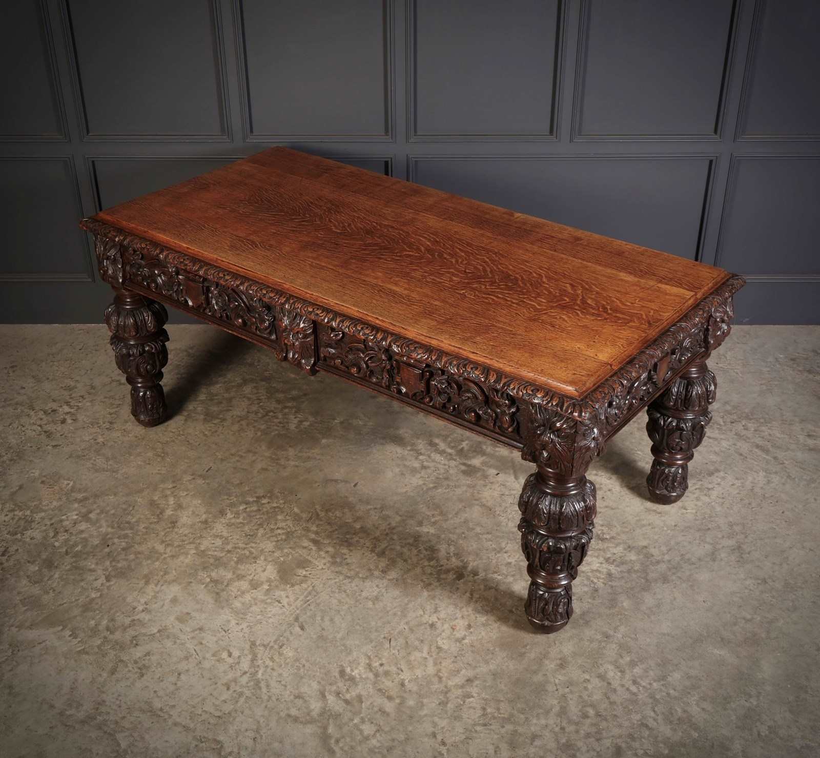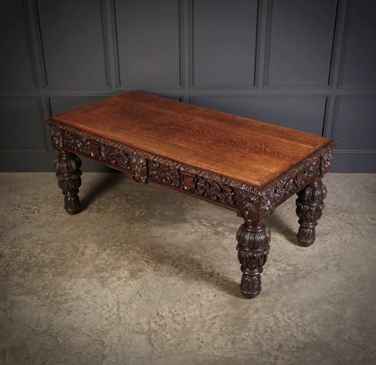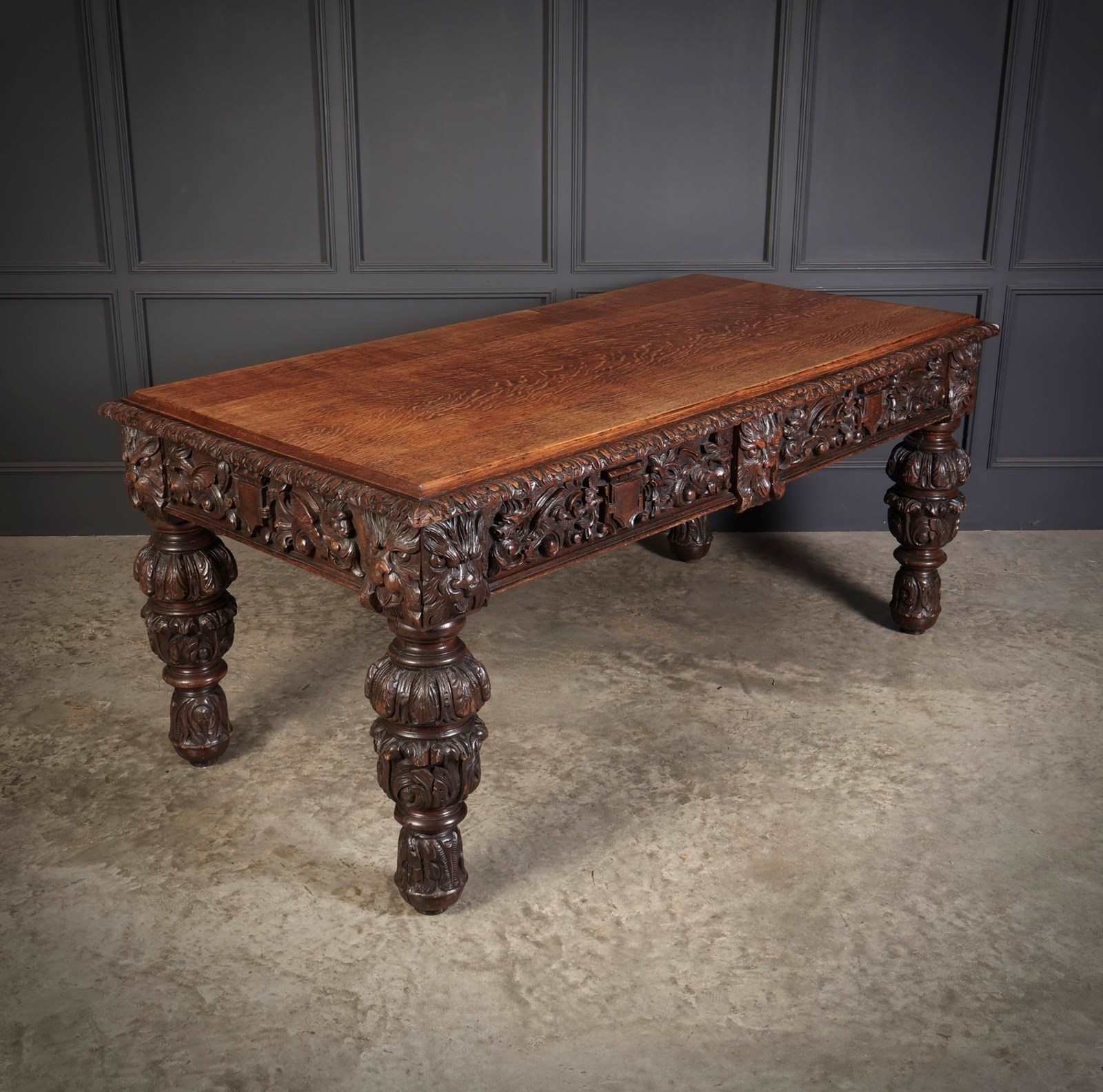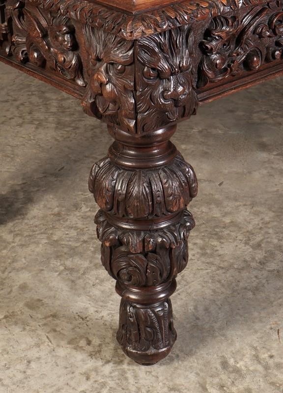The table stands on substantial boldly carved legs, richly detailed with deep leaf and floral decoration, giving the piece a commanding and architectural appearance.