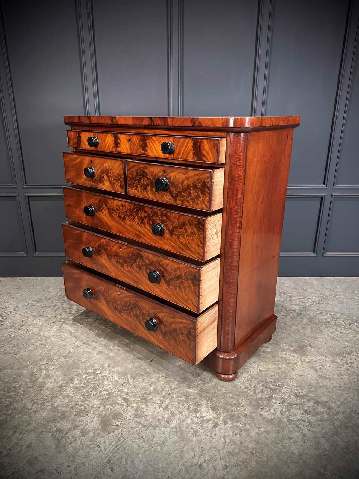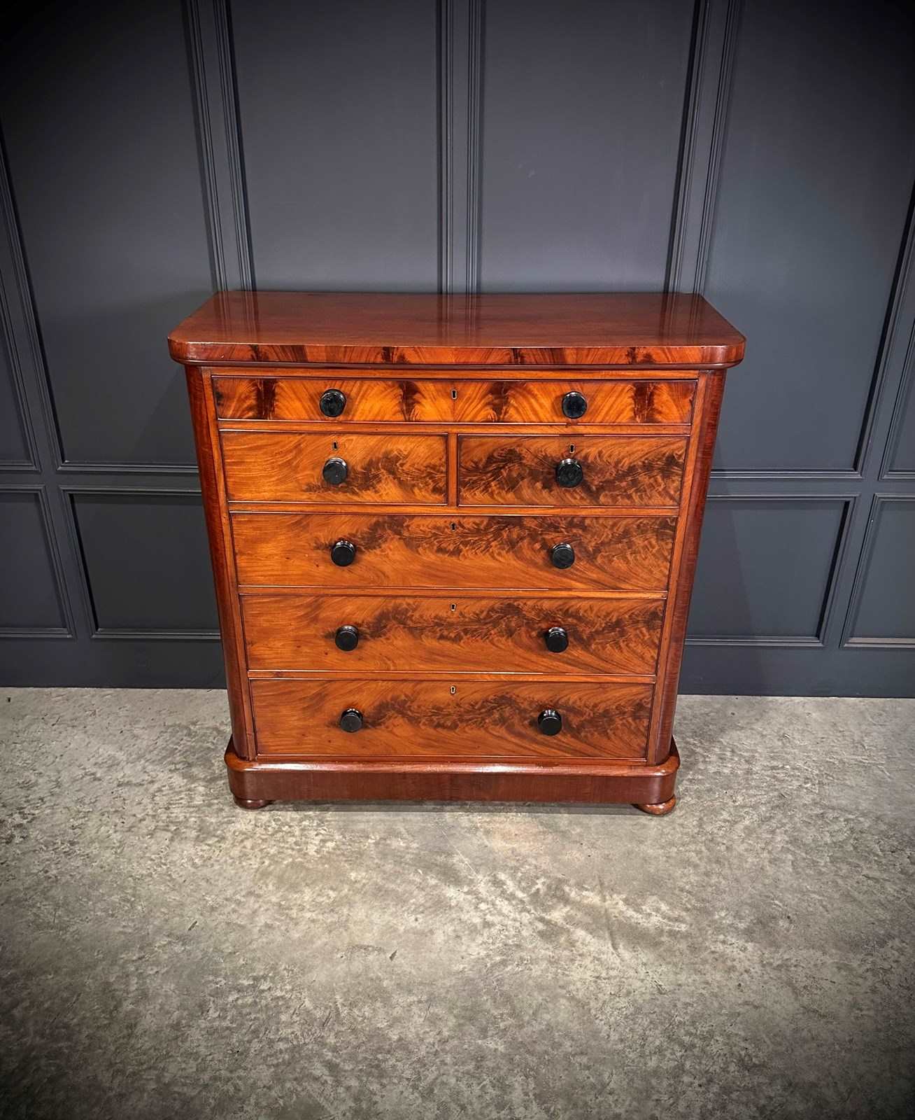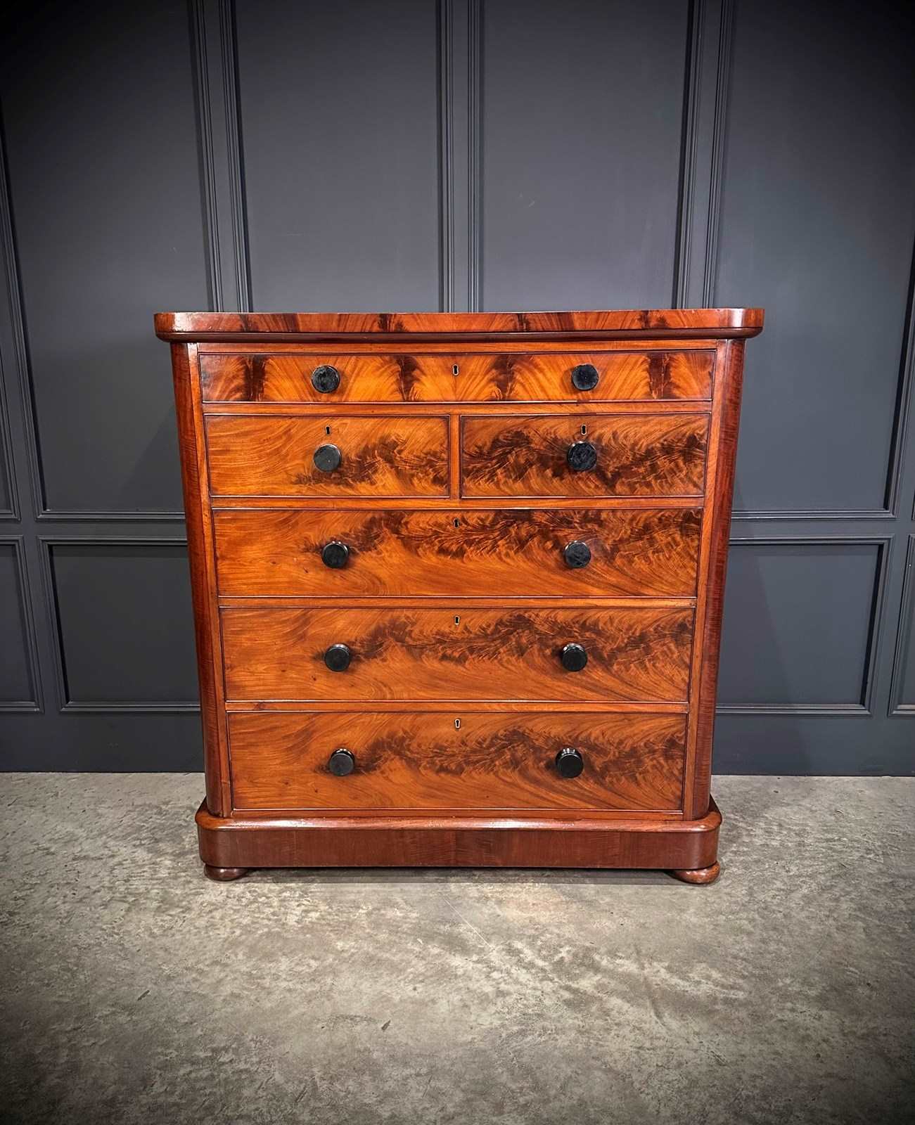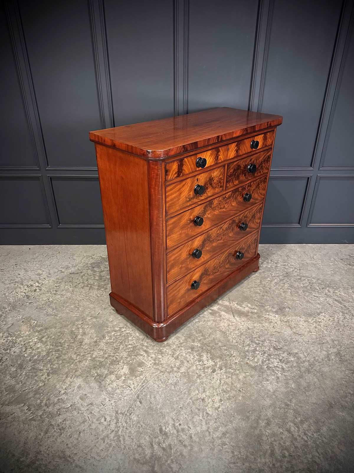 A fine and impressive large Victorian flame mahogany chest of drawers, showcasing beautifully figured grain throughout with rich colour and a polished finish.