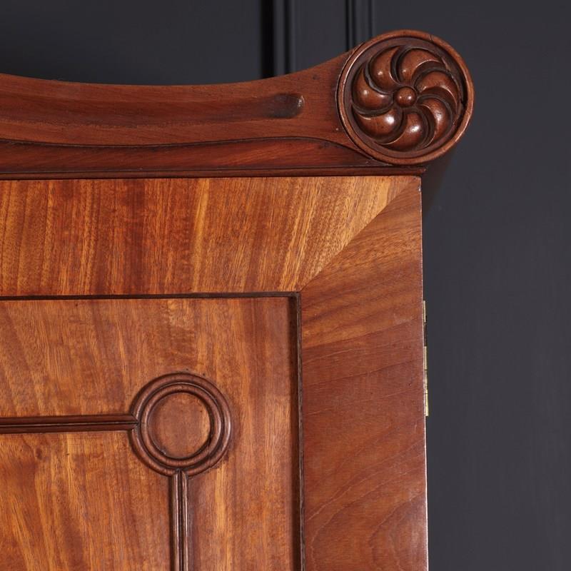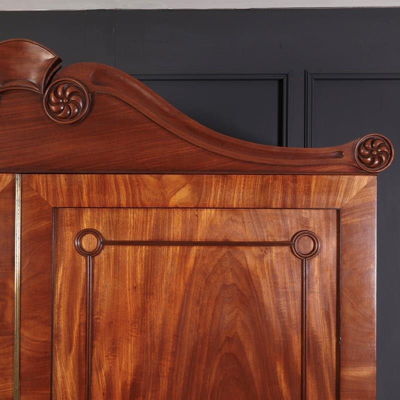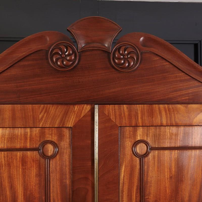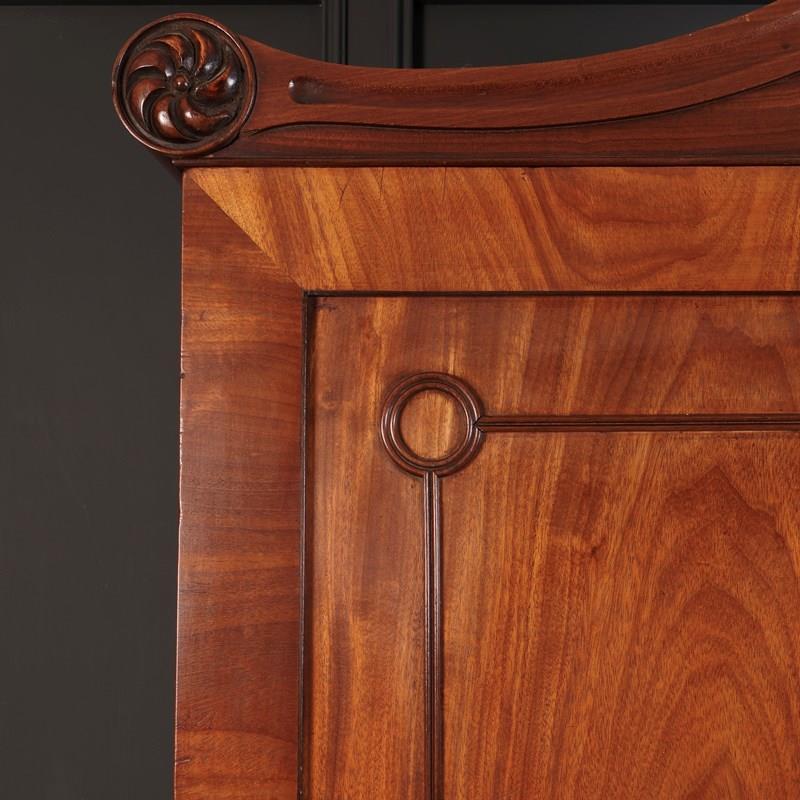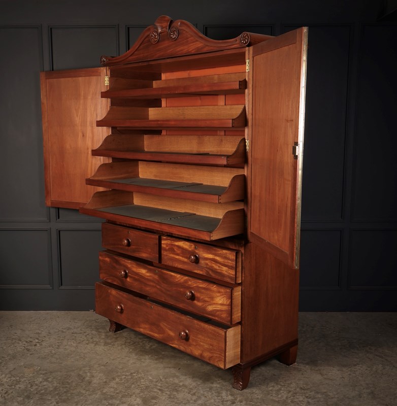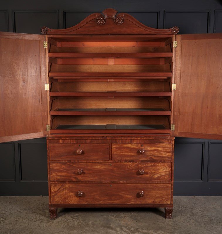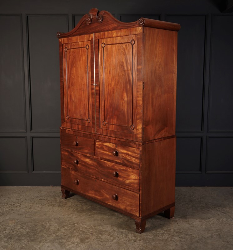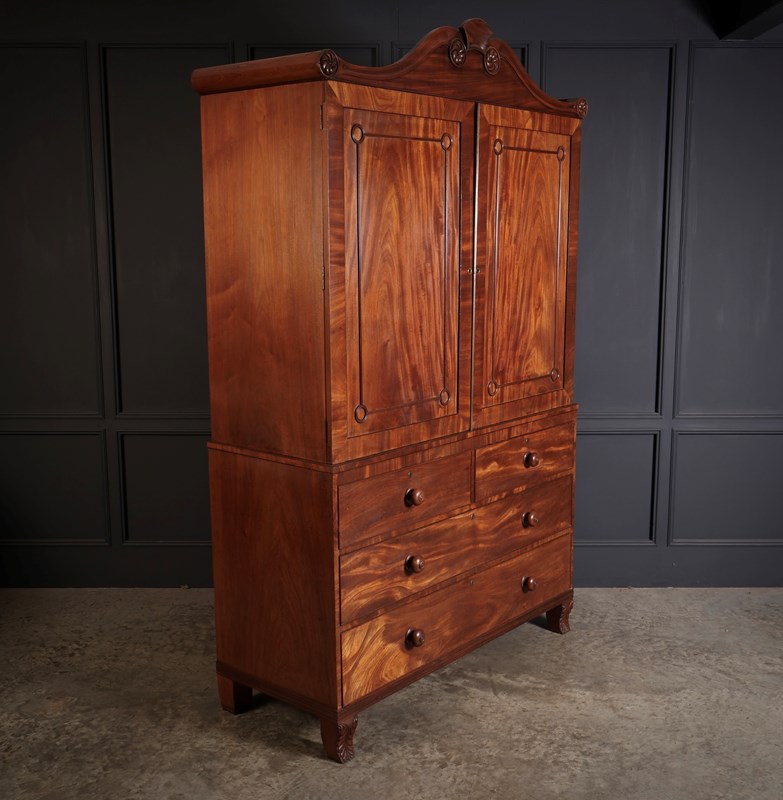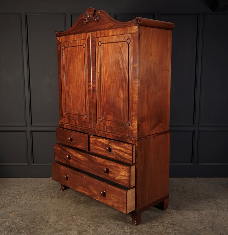 A handsome late Regency mahogany linen press of excellent colour and patination, dating to circa 1820. This versatile piece comes apart in three sections for ease of movement – a base with drawers, the central carcass, and the arched pediment top with carved detail.
