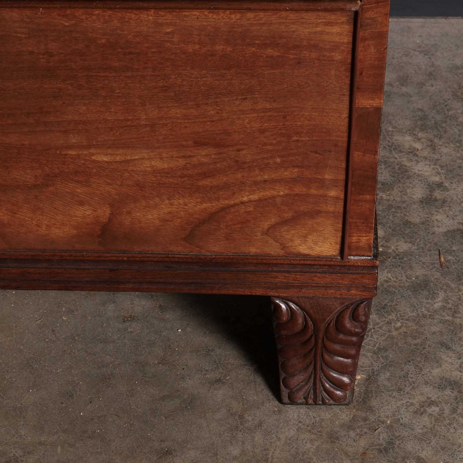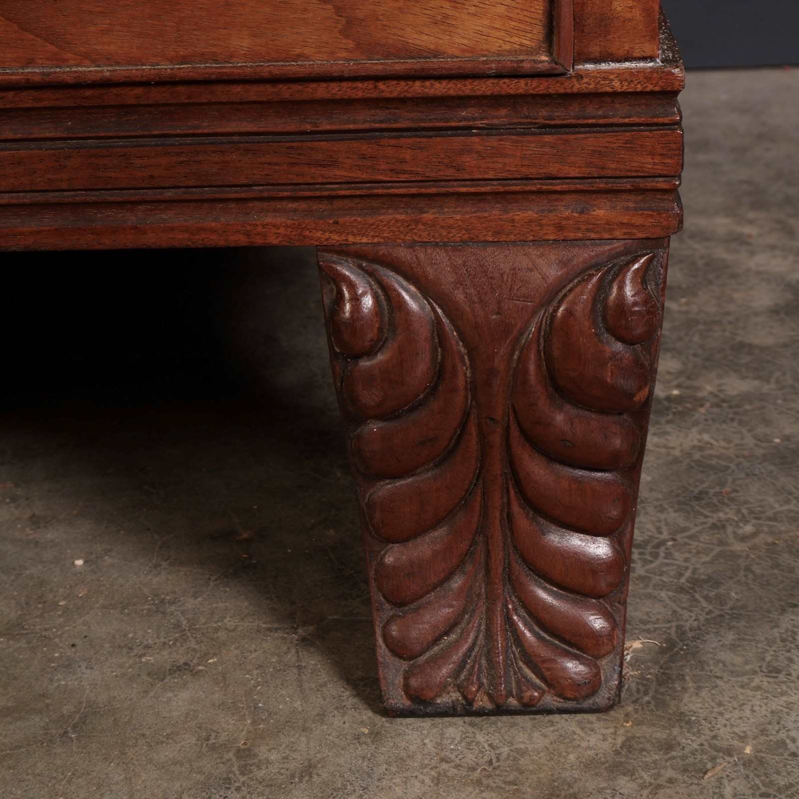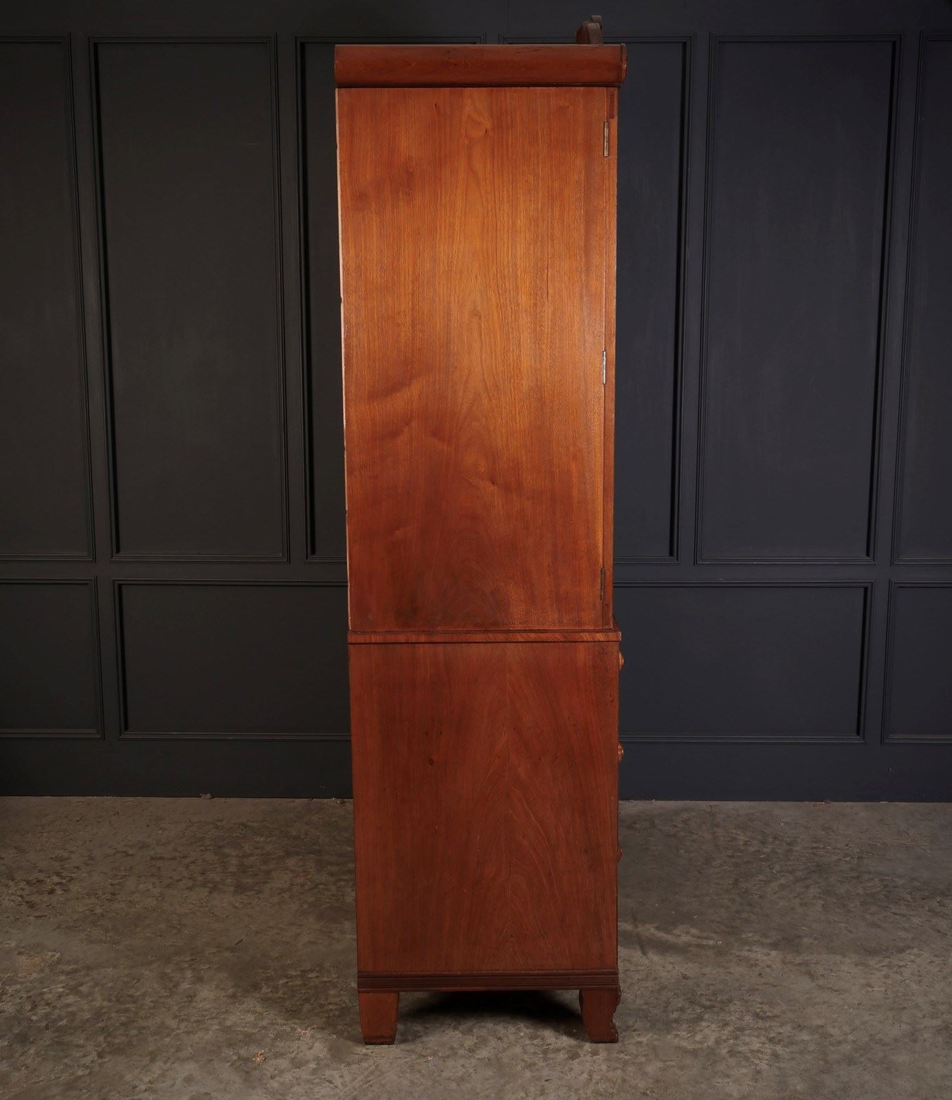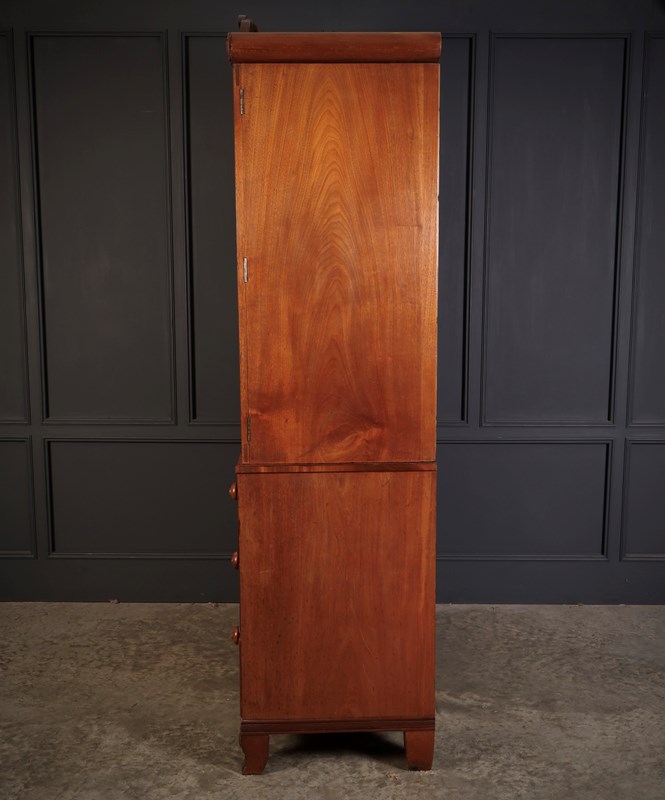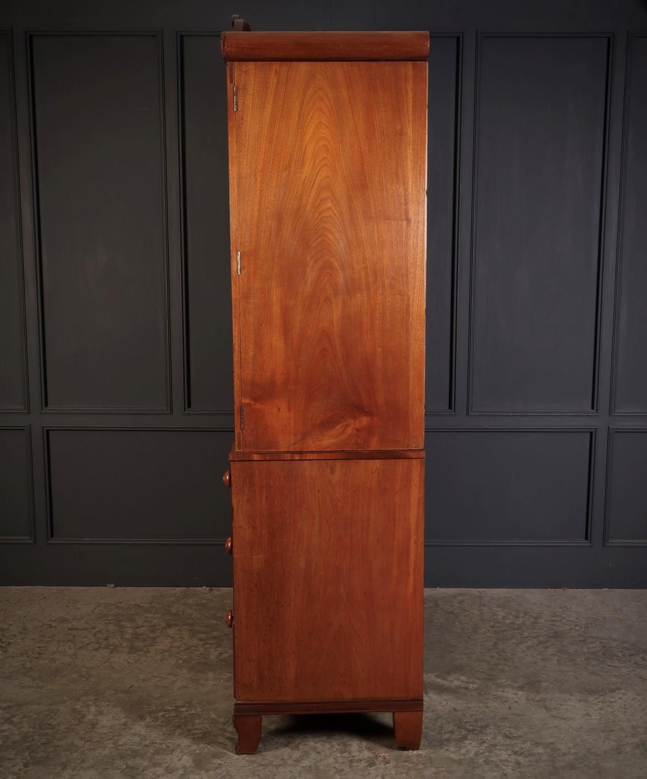 A handsome late Regency mahogany linen press of excellent colour and patination, dating to circa 1820. This versatile piece comes apart in three sections for ease of movement – a base with drawers, the central carcass, and the arched pediment top with carved detail.