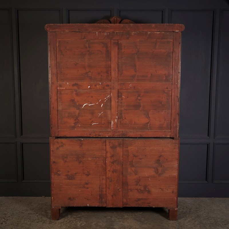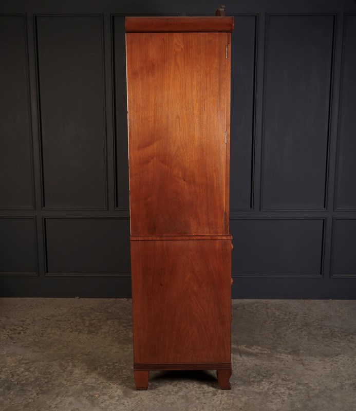 The base is fitted with an arrangement of two short drawers over two long drawers, all with cockbeaded fronts and retaining their original turned mahogany handles. A brass closing strip runs vertically between the doors, with original lock and working key.